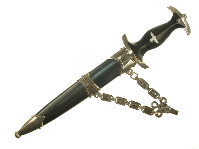This SS chained dagger is typical of the mid-period of about late 1937 or 38. The crossguards are the nickel-plated type and they still have excellent plating which appears to be in fine condition beneath the patination. These guards have good smooth surfaces and precise accent grooves. The grip had a couple of chips at the upper portion as well as on the lower and we fixed the worst ones. They came out pretty good and if you did not know we repaired them you would probably not notice it. The rest of the grip is in good condition being an ebony wood. These grips which were made during this period though are extremely brittle and we often see chips in them. The grip is a medium contour constructed type and it fits the crossguards adequately. The runes button is one of the copper types and it is turned to about seven o’clock. The enamel has some taps but I don’t see any missing material. The eagle is a nickel variety and it is the style with beak which points upward slightly. This bird still has good detail to his eye, beak, breast, wing feathering, talons, wreath and mobile swastika. The scabbard of this example is straight throughout with the exception of one tiny bb dent just below the center ramp on the obverse. The anodizing itself appears to all be there but it does have just a little bit of age in the surfaces. A lot of this would probably clean out if someone wanted to bother with it. The scabbard mounts are also nickel-plated nicely matching the crossguards as far as the patination goes. These mounts still appear to have their original brightness beneath the patination. They are in excellent condition to include the lower ball. The original domehead style screws are all in place and are not buggered. The center ramp is the style with the later larger edges. This fitting features three raised intertwined swastikas on each side. There is no blackening in the background as it was not done on this type of plated chain. The chain assembly itself is a type two. It also is completely patinated having a dull finish exactly matching the rest of the dagger. The chain links are extremely crisp featuring the skull and crossbone links with all teeth being sharp and clear. The SS runes links are also nicely struck. These links all have good pebbling in the backgrounds but again it is not blackened. The reverse of the first SS runes link is stamped on the reverse with the SS kulturzeichen. The cloverleaf snap clip is the closed style that we normally see with this type chain. All of the connectors are in good condition and they are all closed. A nice untouched uncleaned outside here. Taking the blade out of the scabbard the viewer is in for a treat. This blade is still nice and bright and has all of its crossgraining. Other than in and out markings this blade is in mint condition. The SS motto is very crisp and has all of the original blackening in the backgrounds. This unmarked blade has perfect positioning of its shoulders against the crossguard contours. There is a slight amount of the original box clearance hole showing but this is normal for this vintage dagger. A good strong mid-period example here.