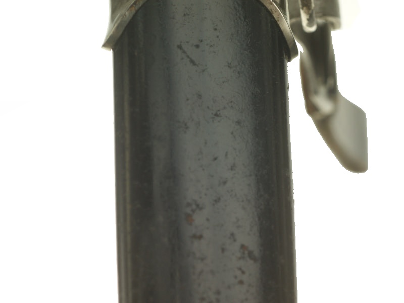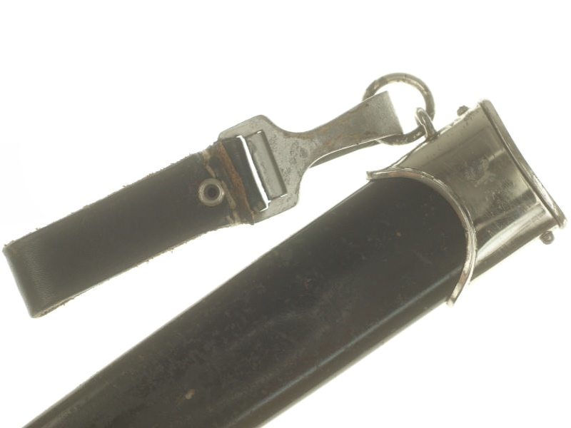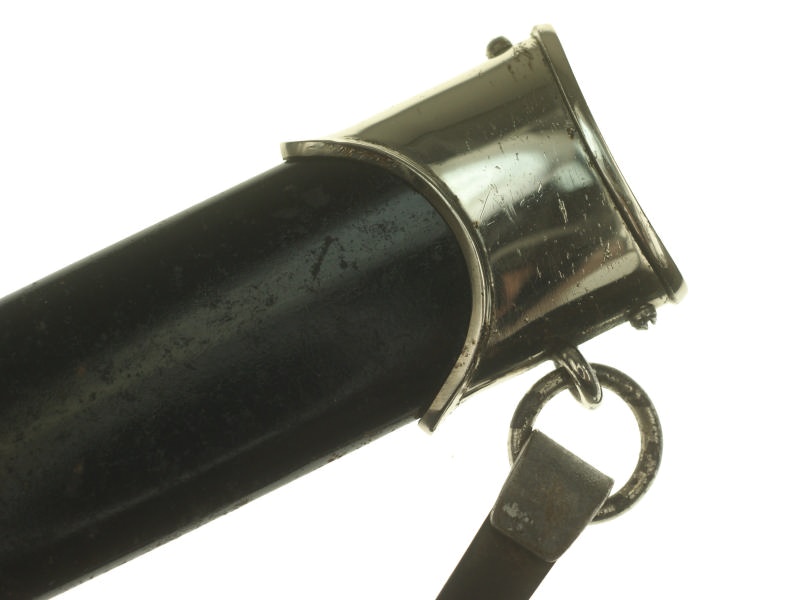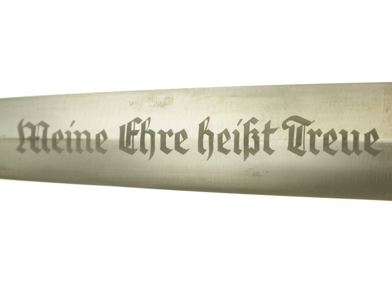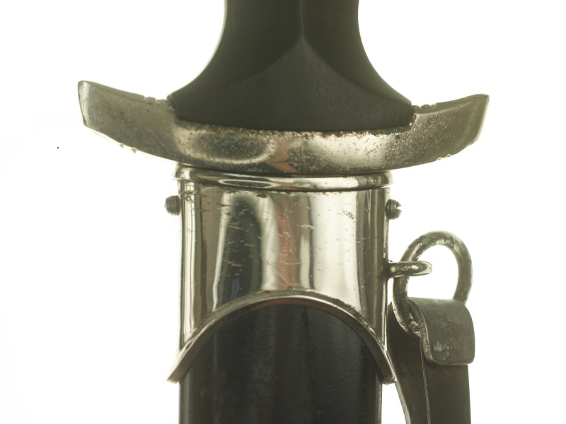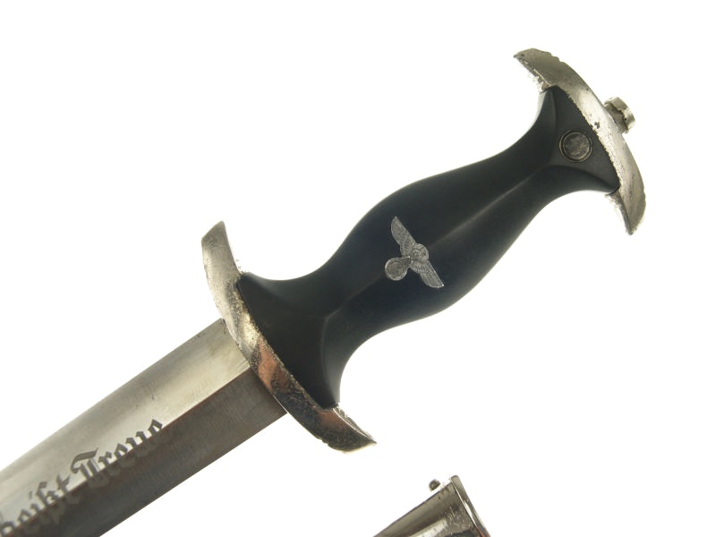 This middle-made SS Dagger is a very nice example. The cross guards and tang nut are the nickel plated type. The plating on the obverse is in perfect condition throughout, showing no lifting and fine, bright areas. The reverse upper is also in nice condition with only minor freckling signs and on the lower example there are a little more signs of freckling, but not bad at all. The grip is a beauty, being of medium contour construction. This grip shows no repairs and shows almost no usage. It fits the cross guards like a glove. The SS runes button is the style that has a darkening in the backgrounds without enamel. The runes are raised out of the surfaces. This is a rarely seen runes button but is absolutely genuine. It is positioned in a north to south format. The grip eagle is a point-behind-the-head type. It shows good detail to the head, breast feathering, wing feathering, legs, wreath and mobile raised swastika. A very fine hit here! The scabbard shell is straight as an arrow throughout. It has outstanding original black paint. This paint still retains its factory brightness and other than a few extremely minor chips, is in near mint condition. It is rare to see nice paint like this. The matching scabbard mounts are nickel plated steel and they, too, have 100% of their finish and still have fine luster throughout. The screws are the dome head steel type and they do not have plating visible, but all are there and are untouched. The blade of this example is a real screamer. It has all of the original cross graining and is a fine, mirror bright finish. The SS motto is crisp to the etch and also has 100% of the background darkening. This blade is easily in full mint condition. The makers are RZM M7/15 (Carl & Robert Linder, Solingen) and Henkels J.A. Zwillingswerk. The blade shoulders perfectly fit the lower cross guard contour. There is a small amount of the tang clearance hole showing next to the blade on the cross guard. A very, very fine later made SS piece.