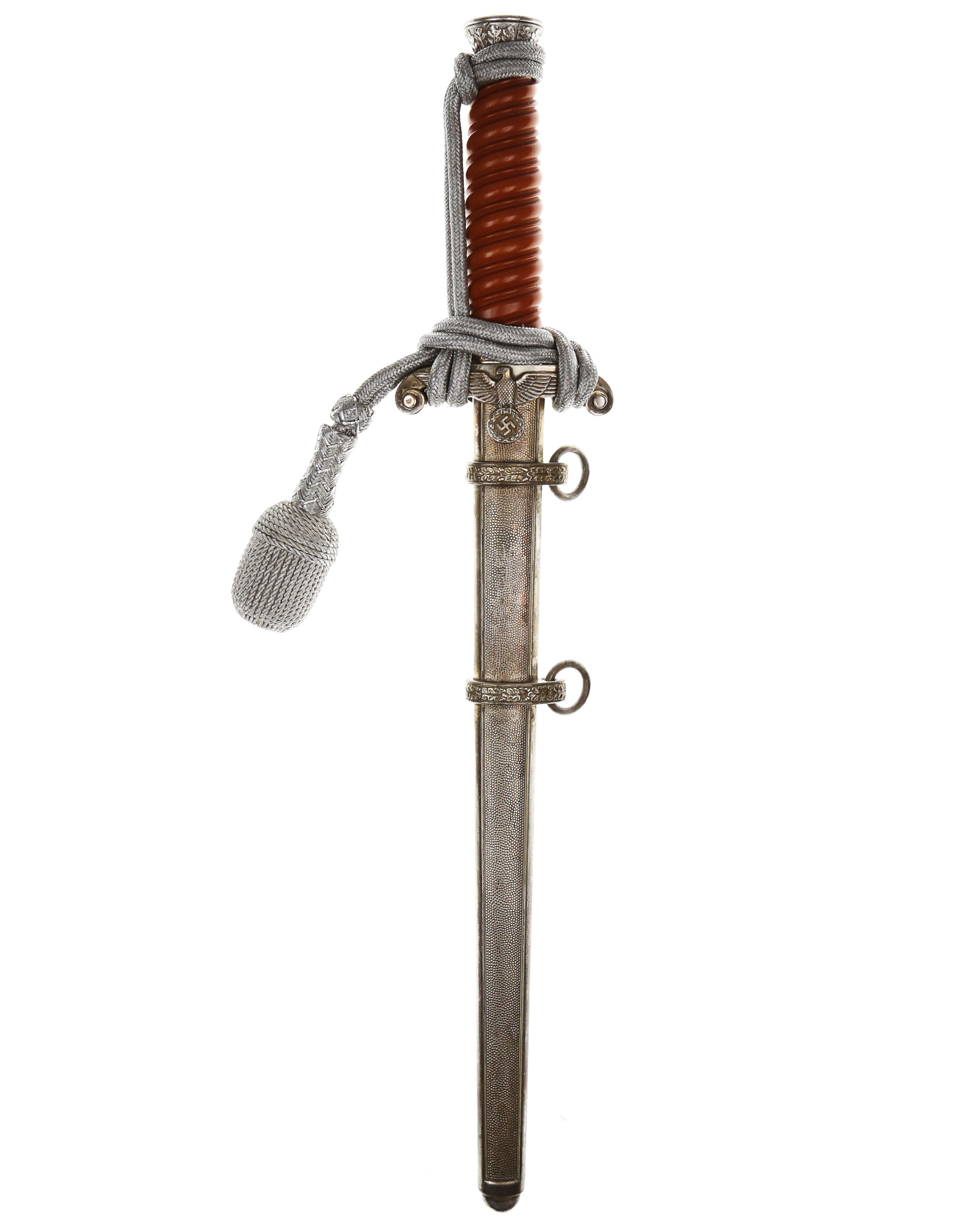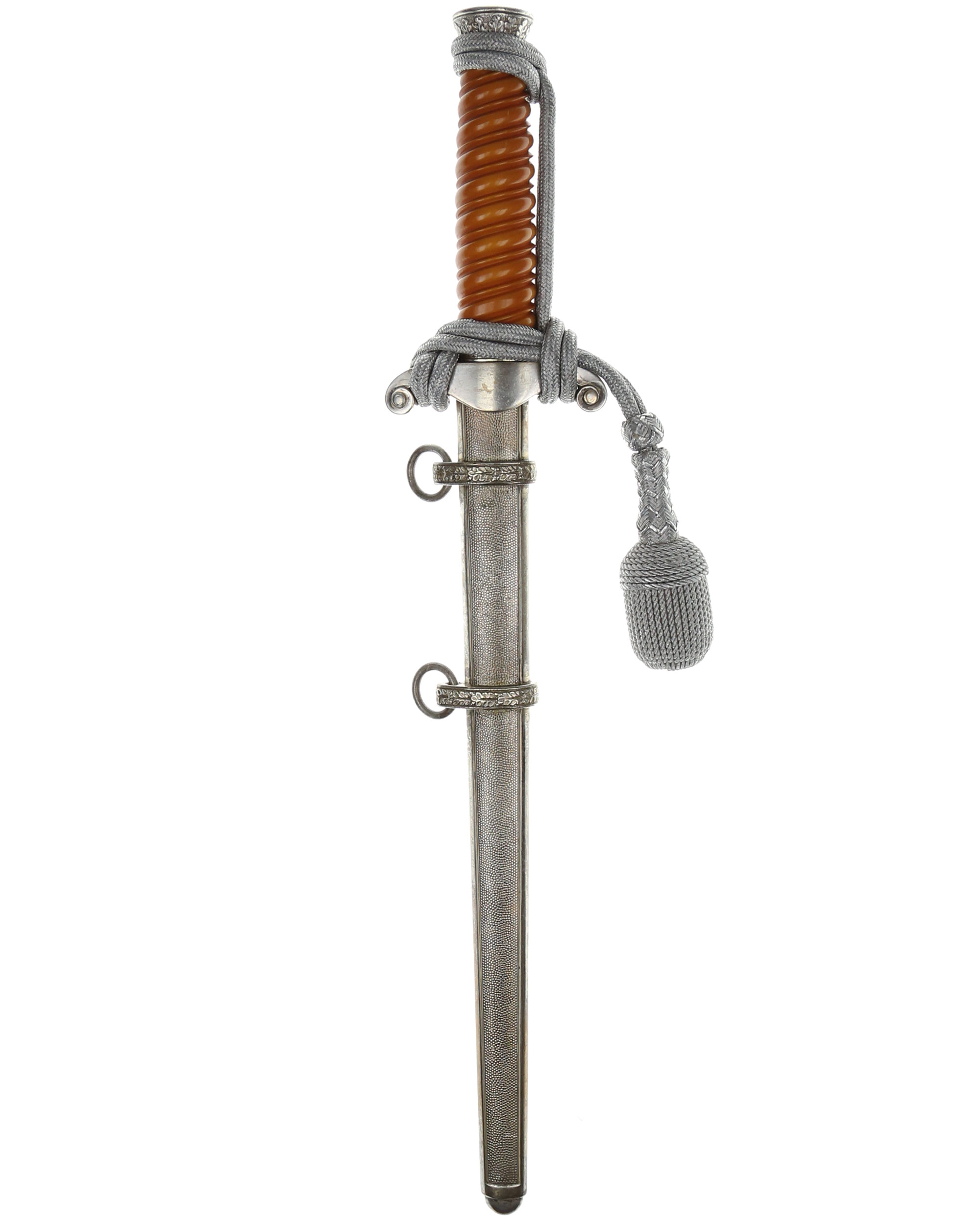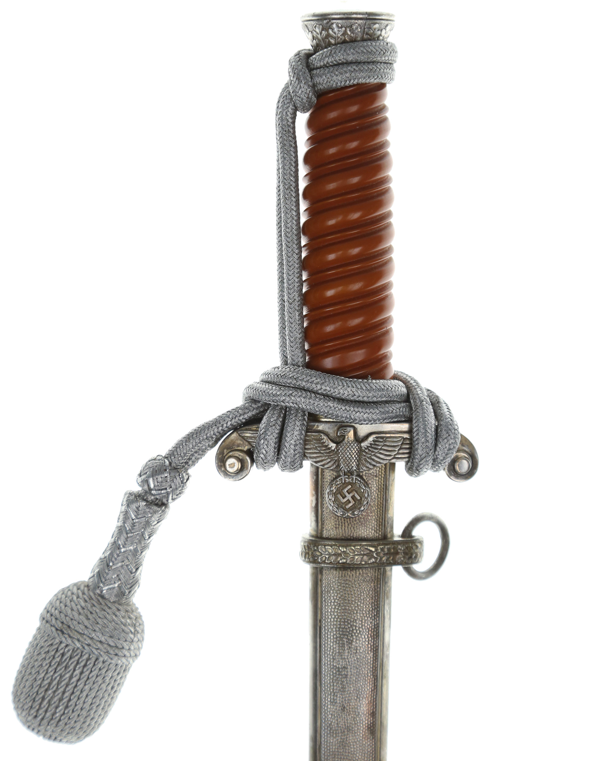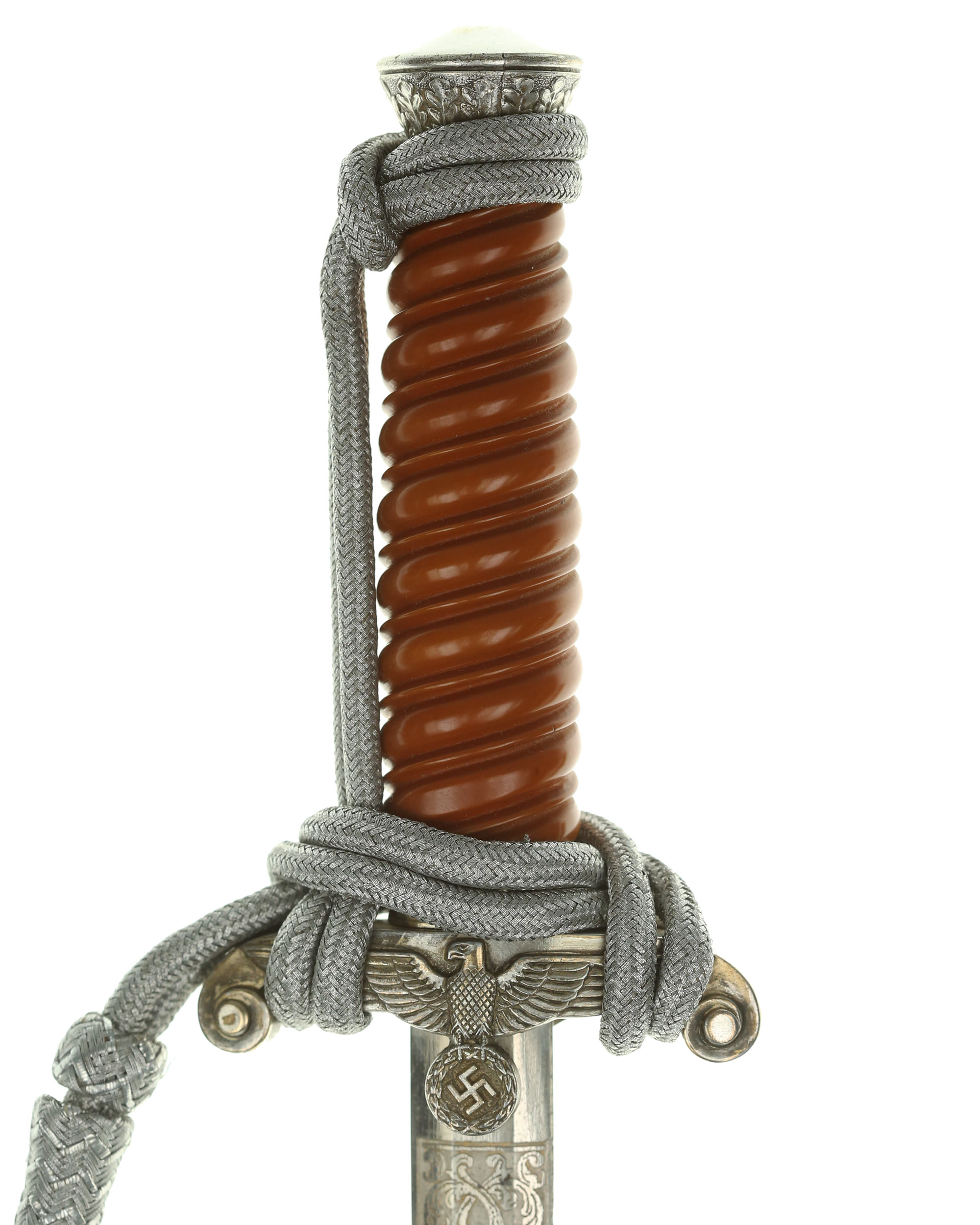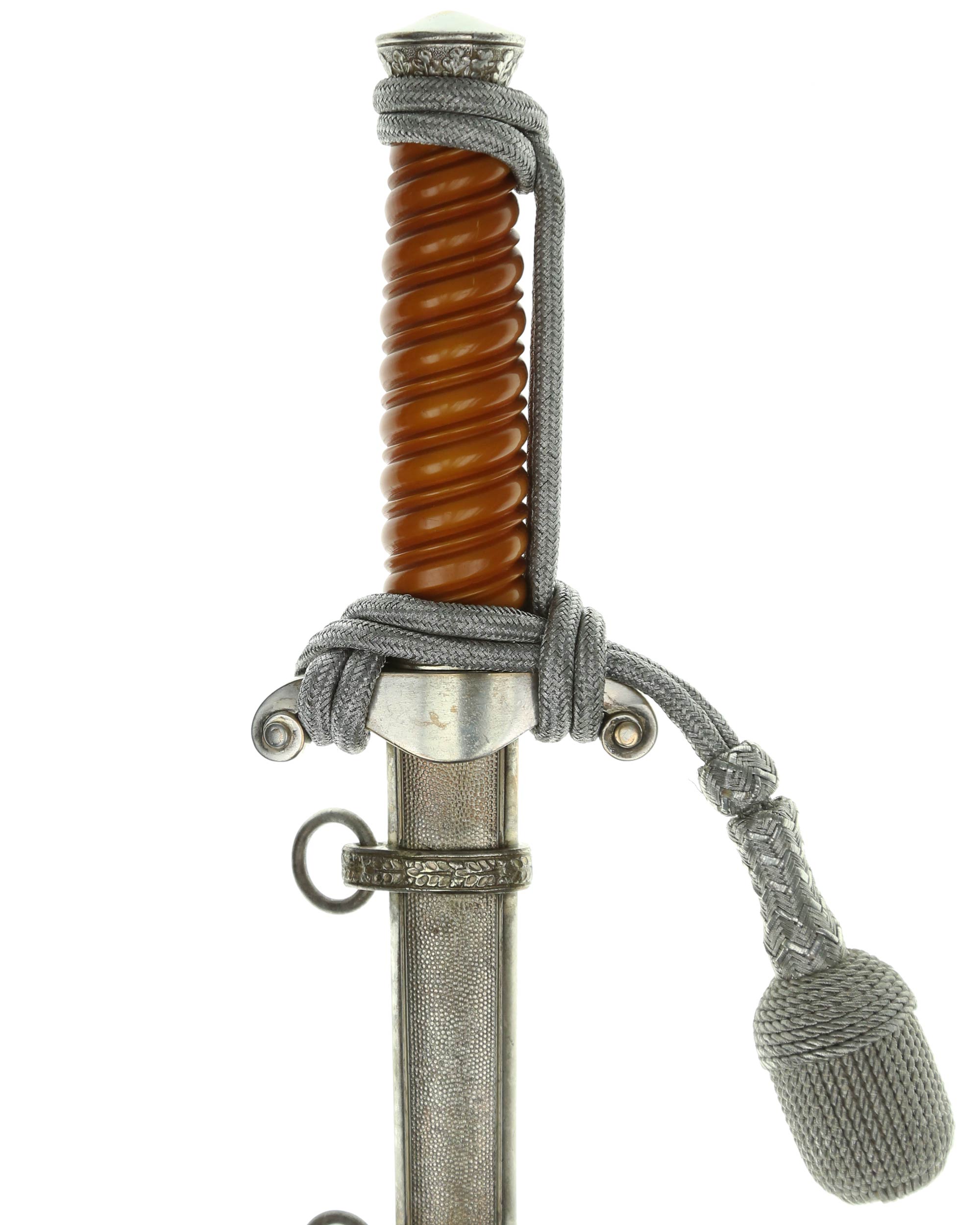 Grip: The silvering is still quite good throughout the piece. The crossguard still looks excellent. The fourteen standing oak leaves separated by acorns have good hand enhancement. The upper portion of the pommel appears to have all of the silvering. The crossguard is often little detail remaining to the head and breast of the bird, and this is somewhat the case with this particular example. The wing feathering, talons, wreath, and raised mobile swastika still have good detail. The reverse of the crossguard still has good silvering. This solid celluloid grip is in excellent condition.