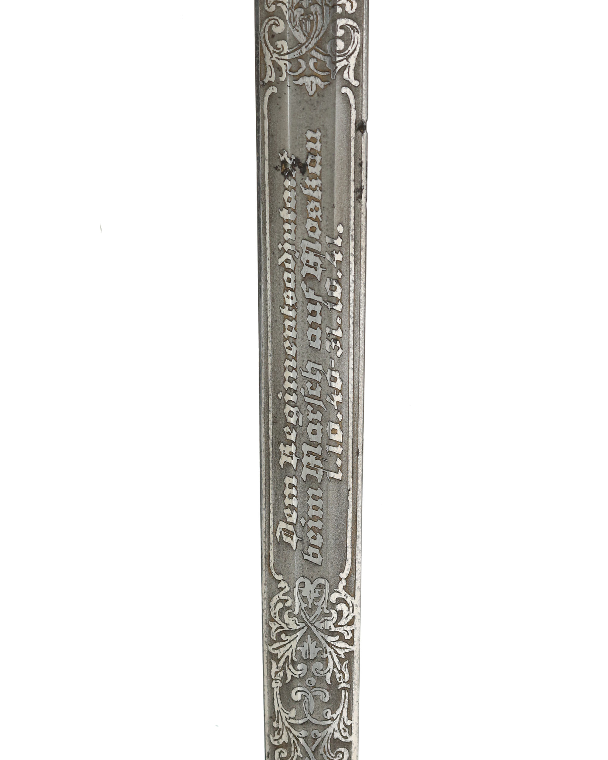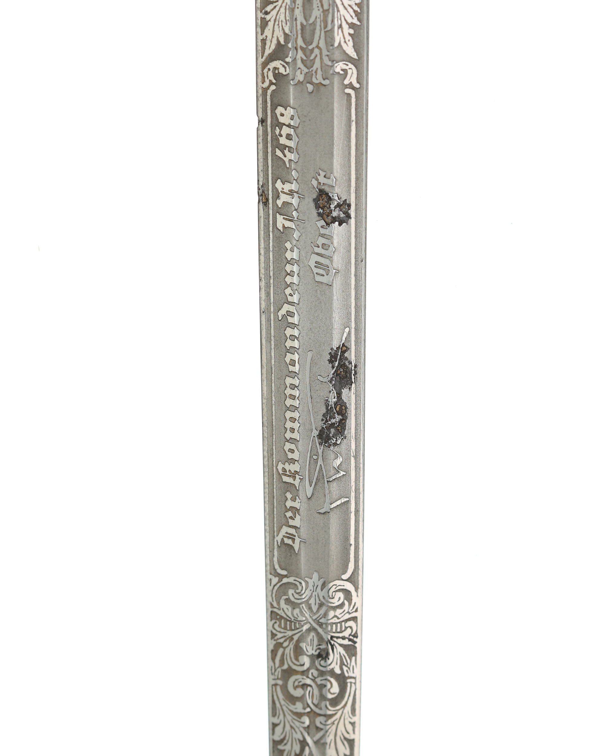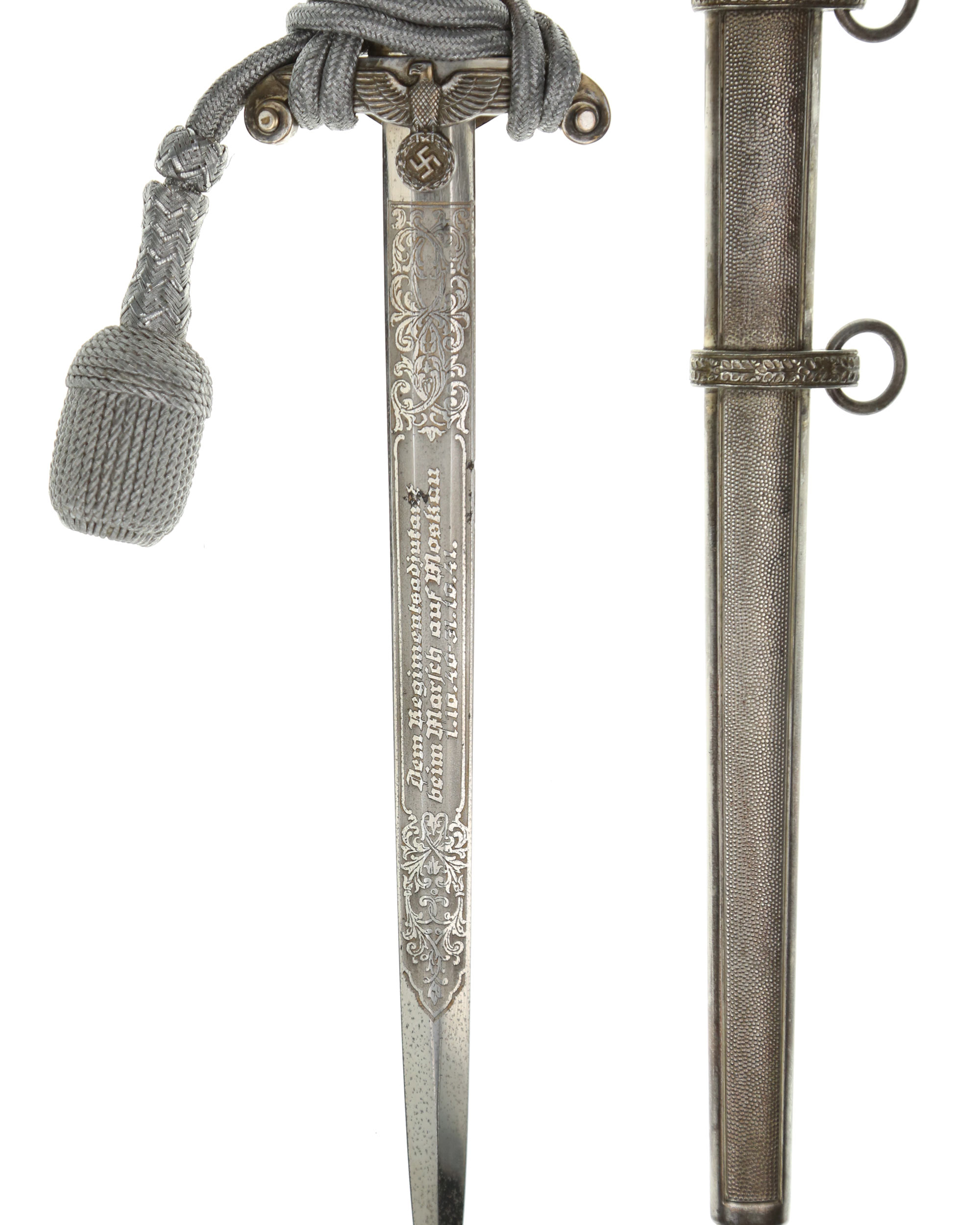 Blade: The beautiful, classic blade is in near mint condition having all of its original nickel-plated surfaces with fabulous frosted backgrounds highlighting the raised areas. The obverse section of the blade leaves a panel in the center which is reserved for an inscription: Dem Regimentsadjutant beim Marsch auf Moskau 1.10.40 - 31.10.41. Next to the wreath on both sides respectively are sprigs of oak leaves and acorns. The reverse blade repeats the pattern with 2nd center panel: Der Kommandeur J.R. 468 Oberst. The reverse ricasso is etched with the 1940-41style trademark used by Alcoso. It features the scales with the initials, "ACS" interspersed. To the right of the scales, "Alcoso" is written in script, positioned over a block-lettered "Solingen". The original large-sized leather blade buffer is in place.