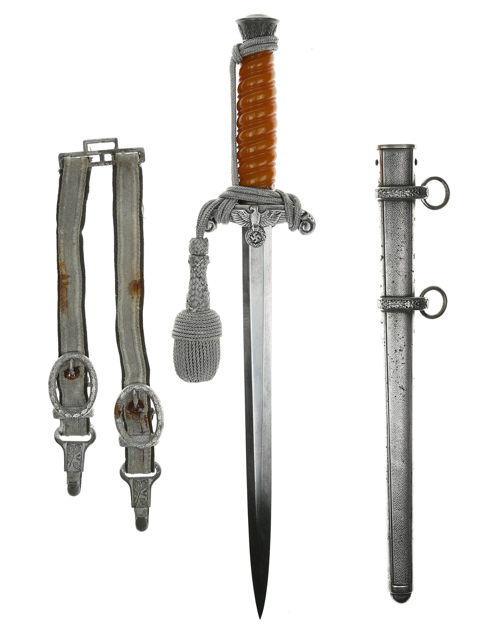 Heeres Offiziersdolch der Wehrmacht wurde ursprünglich von dem Berliner Künstler PAUL CASBERG (Pseudonym) entworfen. Das Tragen des Heeresdolches wurde am 4. Mai 1935 offiziell genehmigt. Für den Dolch wurde auch ein Aluminium Portepee und 7 unterschiedliche Gehänge entwickelt. Die Herstellung des Heeresdolches war am 27. Mai 1943 und das Tragen des Dolches am 05. September 1944 eingestellt worden. Ab dem 24. Dezember 1944 wurden den Offizieren befohlen, anstelle des Heeresdolches eine andere Waffe zu tragen. Da der Heeresdolch ein persönlicher Gegenstand der Offiziersbekleidung war, kauften meistens die Offiziere den Dolch für ihr eigenes Geld. Ein Heeresdolch hat damals ca. 11,50 RM (Reichsmark) gekostet.