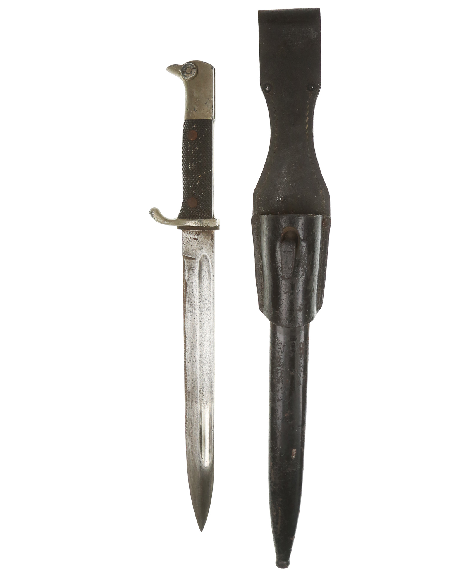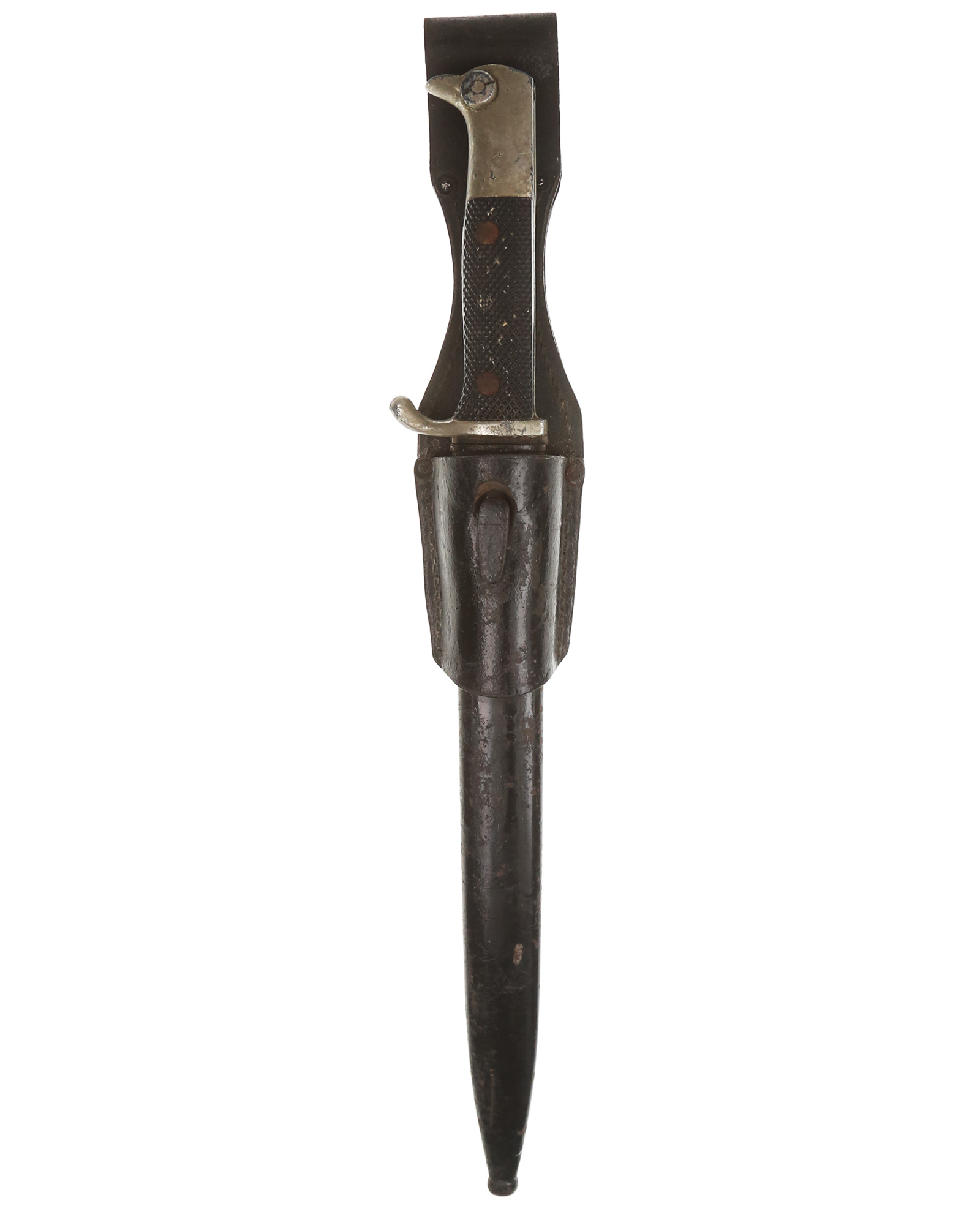 German WW2 period Army model dress/parade bayonet, the nickle silver plated blade is 245mm (9 3/4"), makers mark E.Pack Solingen, nickle silver plated hilt, it is complete with it's original (painted) black steel scabbard, the excellent leather belt frog.