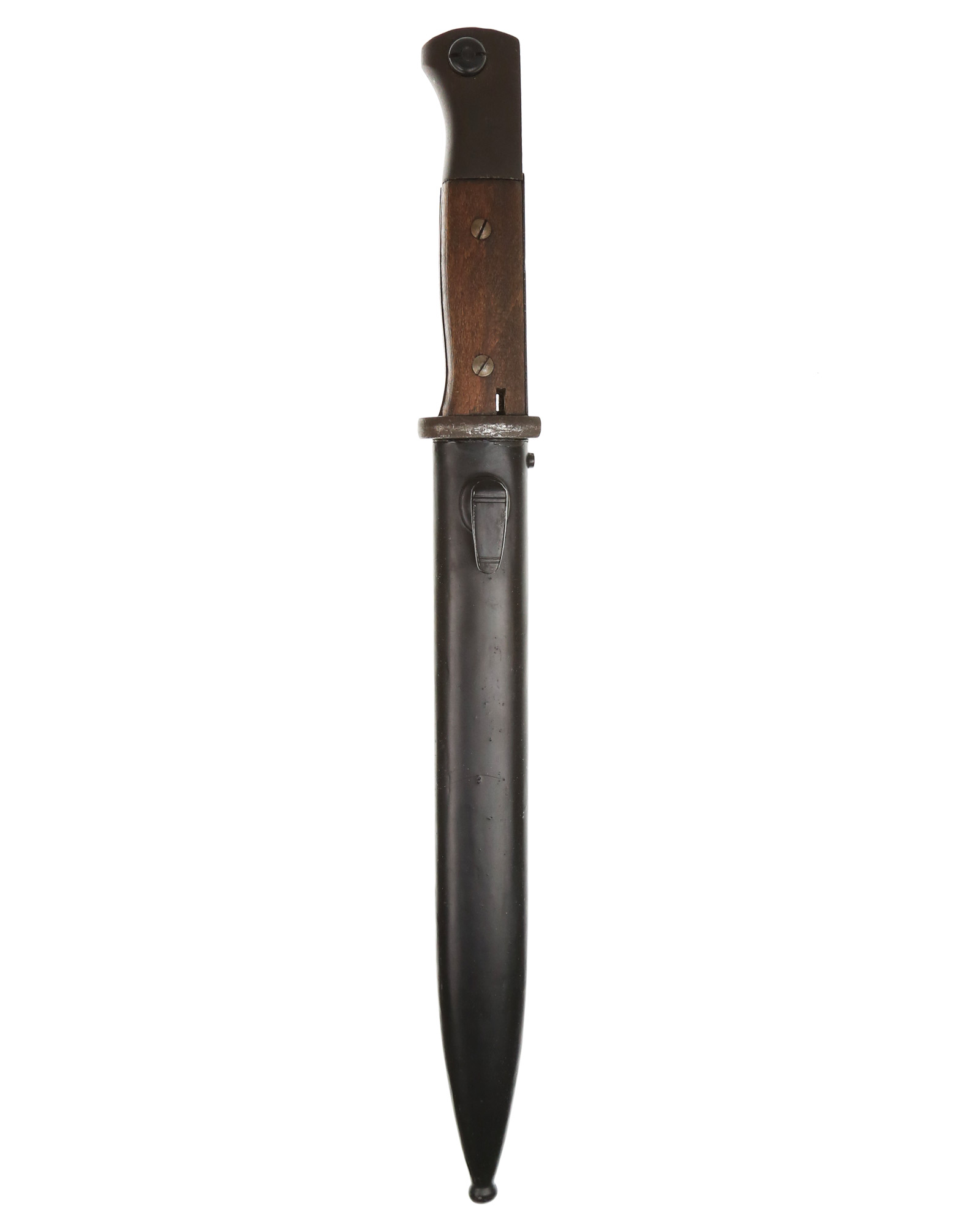 German 1884/98 Bayonet. It is in EXC+ condition. Wood grips. Very nice blade with about 85% bluing on the blade. Crossguard is with number: #3785.