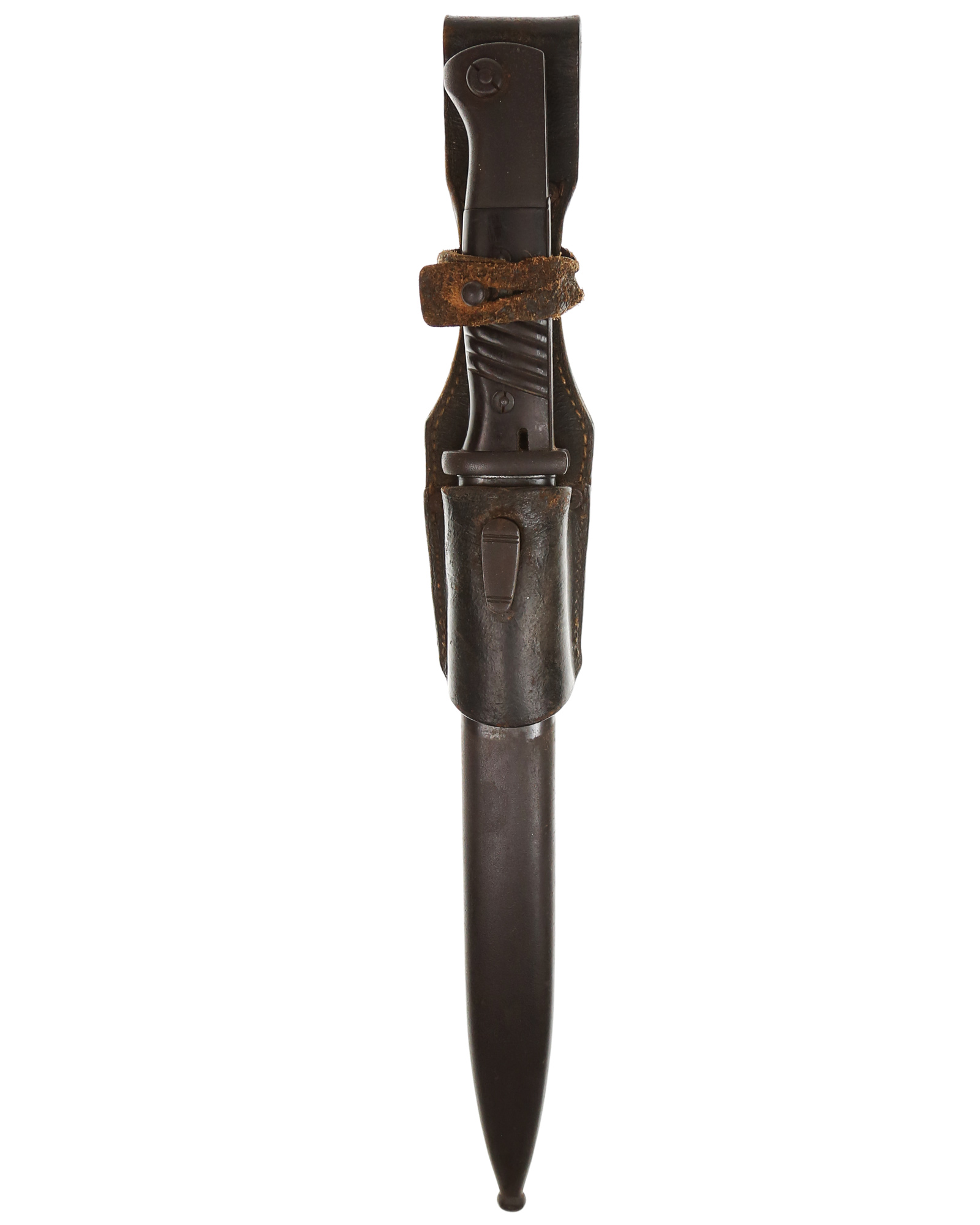 German 3rd Reich marked M84/98 (K98) knife bayonet with number, the blued steel blade is 252 mm with makers mark E. & F. Hörster Co., Solingen at the forte with number 8024k on the other side, brown bakelite grips, it is complete with it's original matching steel scabbard. The general condition is Near Mint.