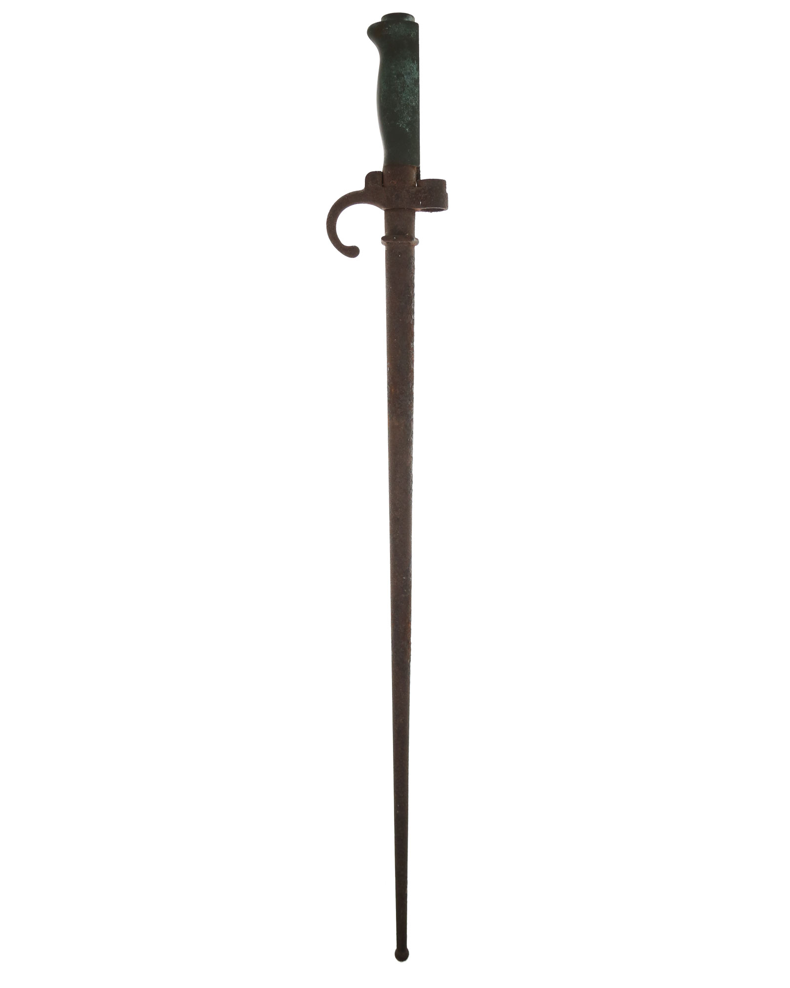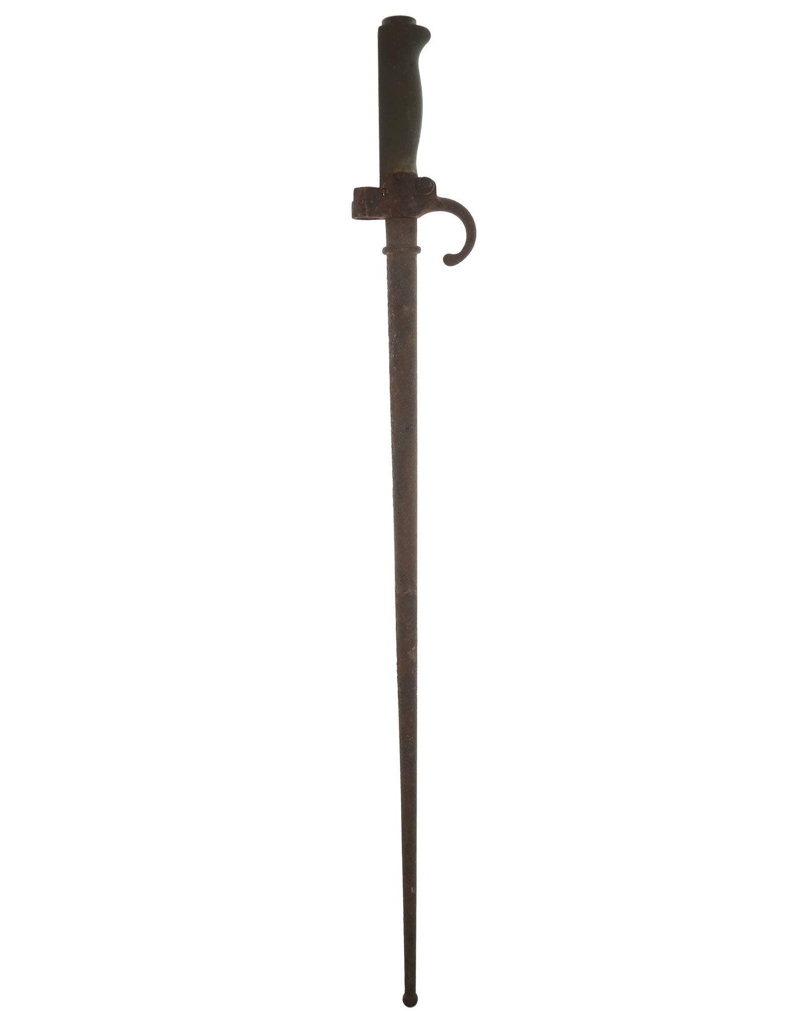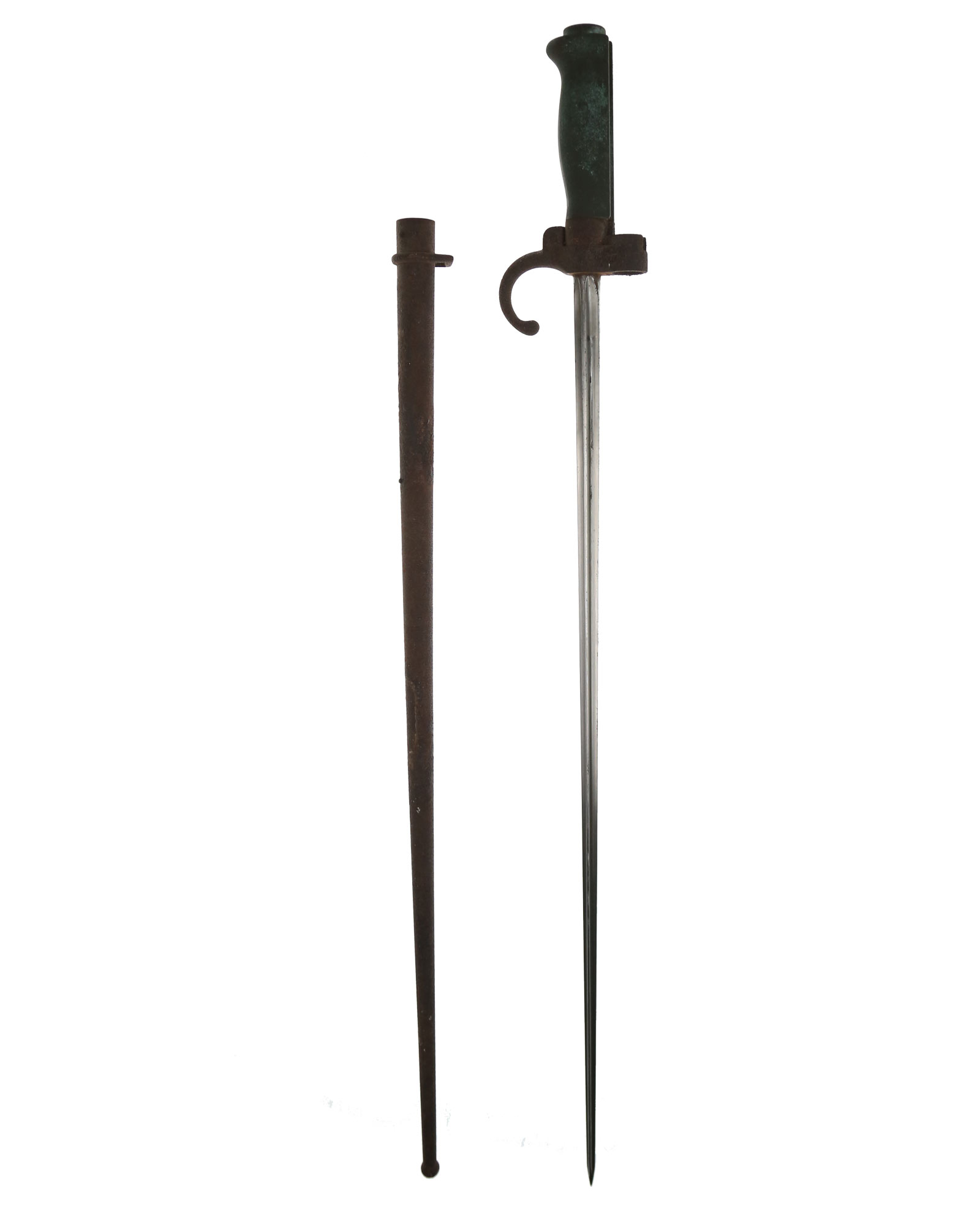 French M1886 Lebel Bayonet with cruciform "epee" blade. With an original scabbard. 52 cm cruciform blade with a silver alloy handle. Overall good original condition showing some age, uncleaned.