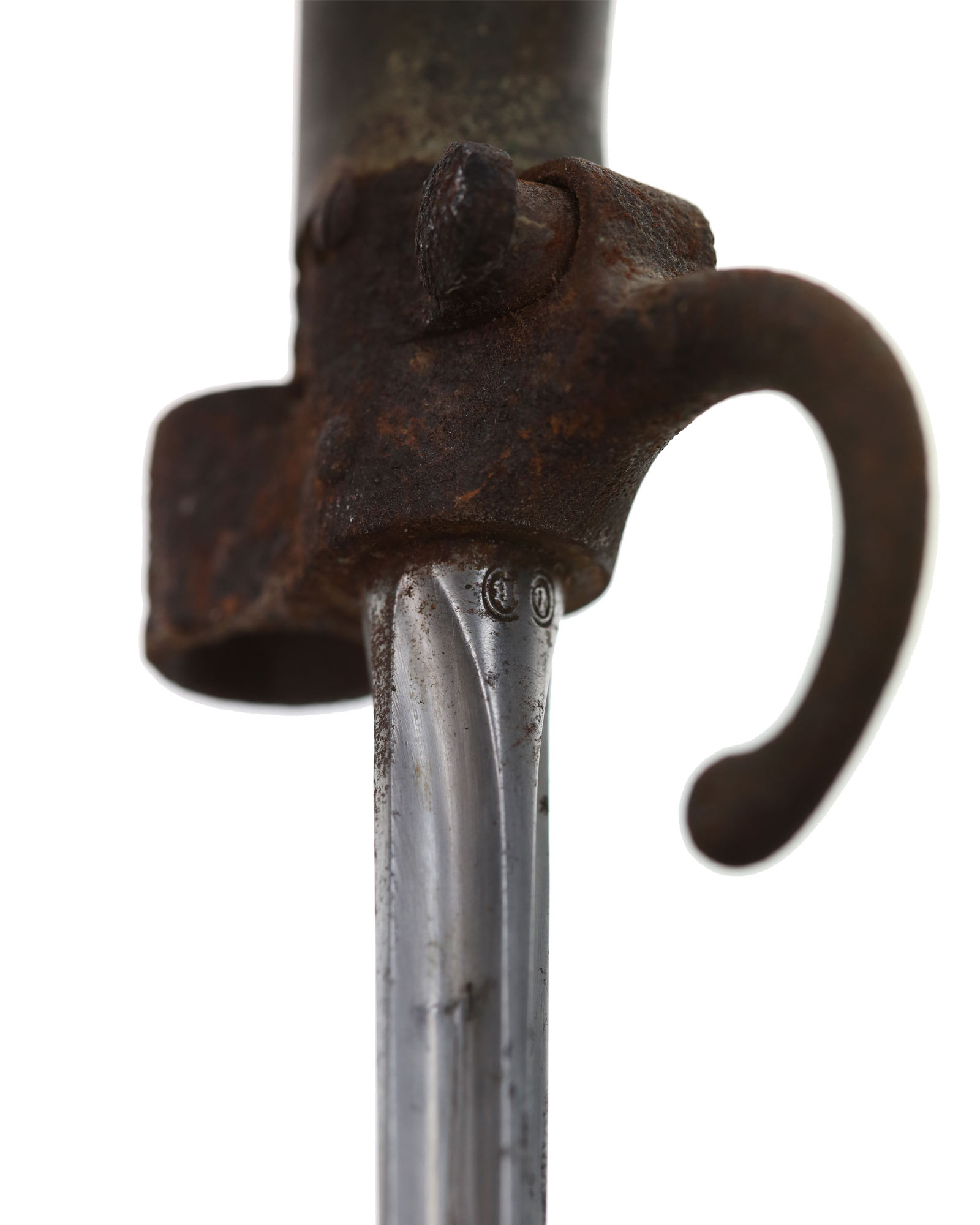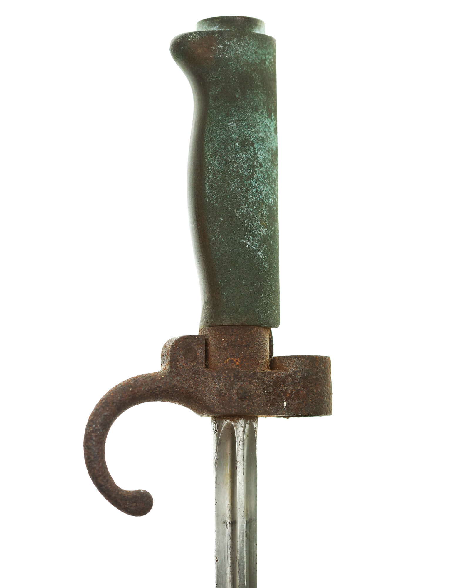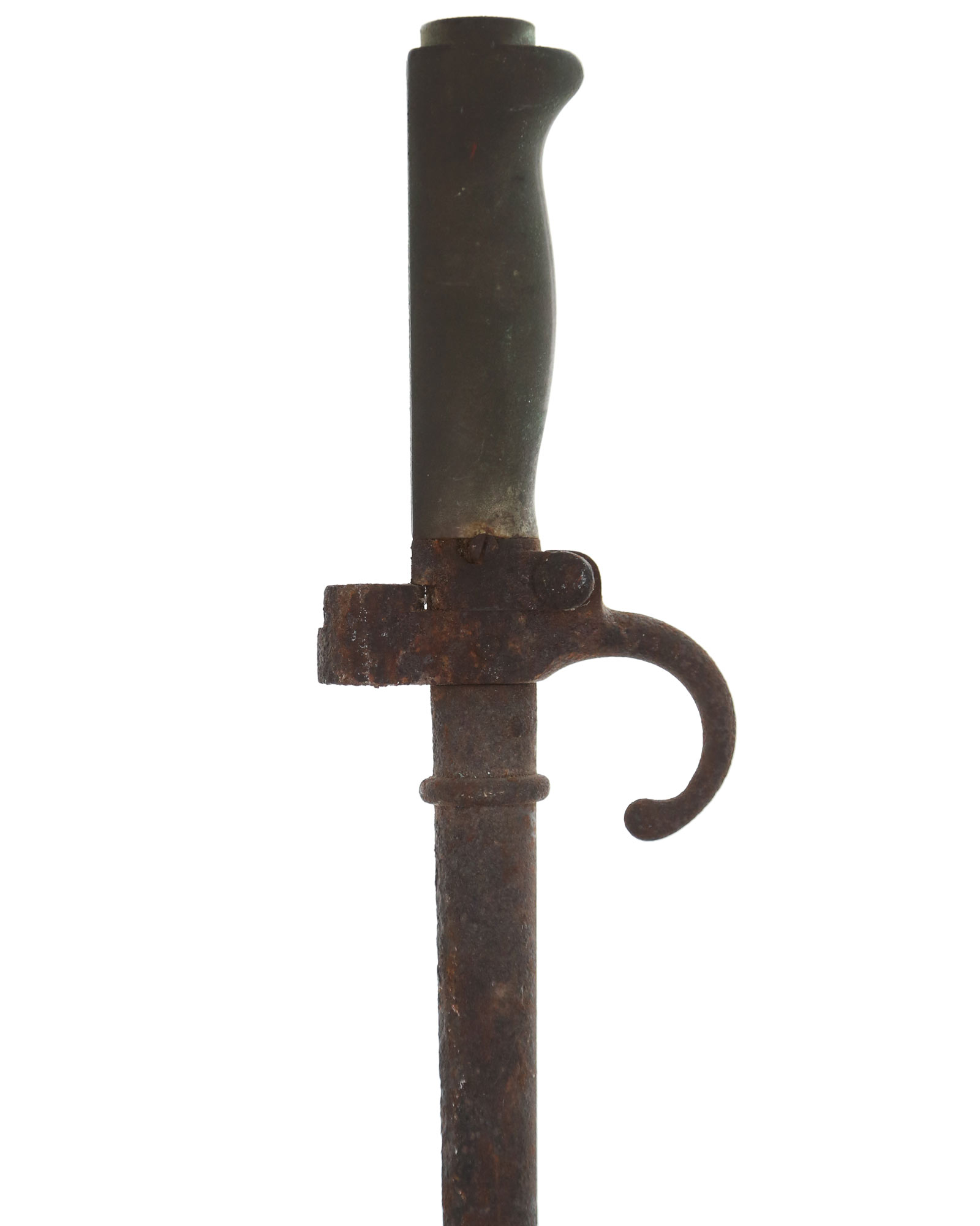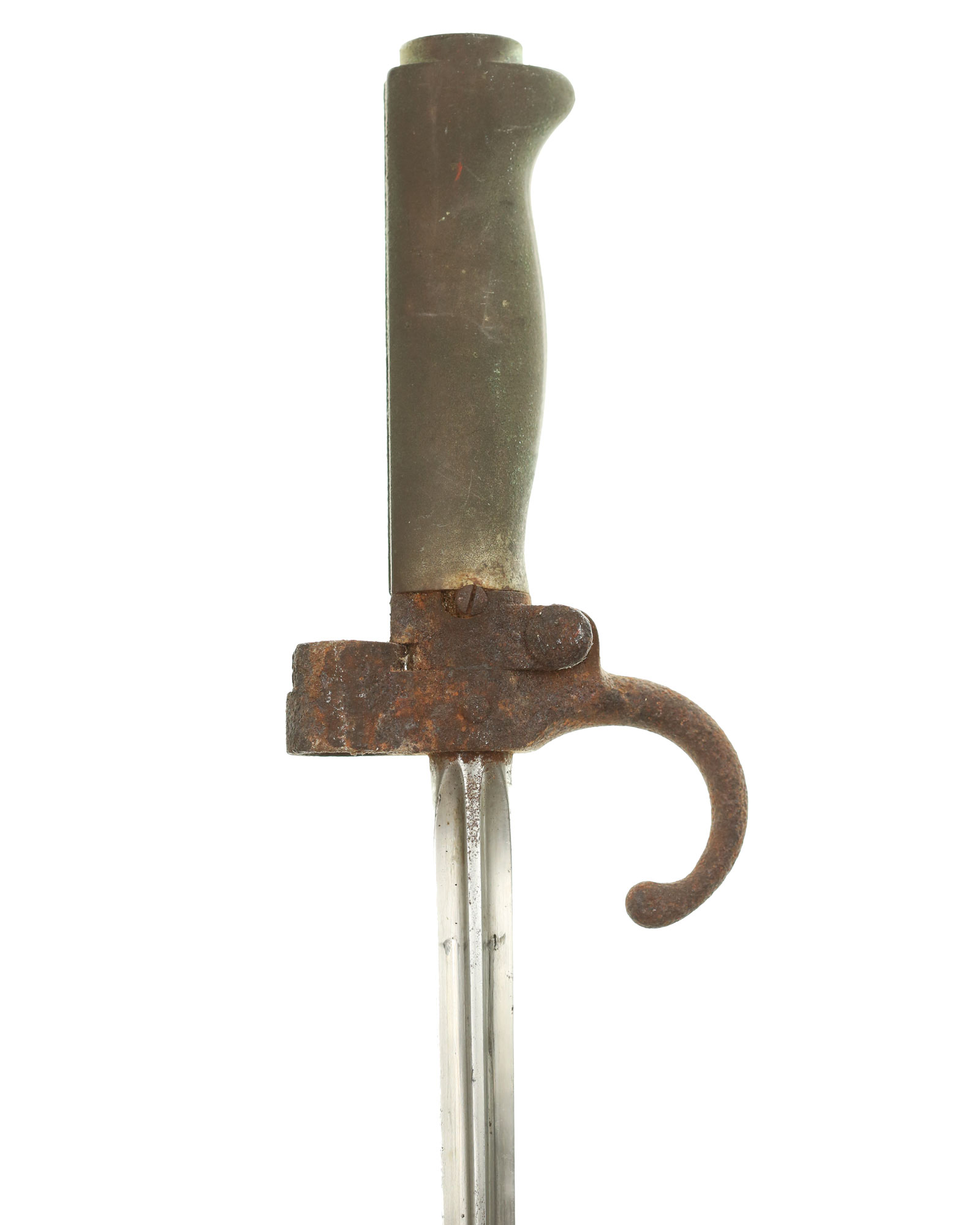 French M1886 Lebel Bayonet with cruciform "epee" blade. With an original scabbard. 52 cm cruciform blade with a silver alloy handle. Overall good original condition showing some age, uncleaned.
