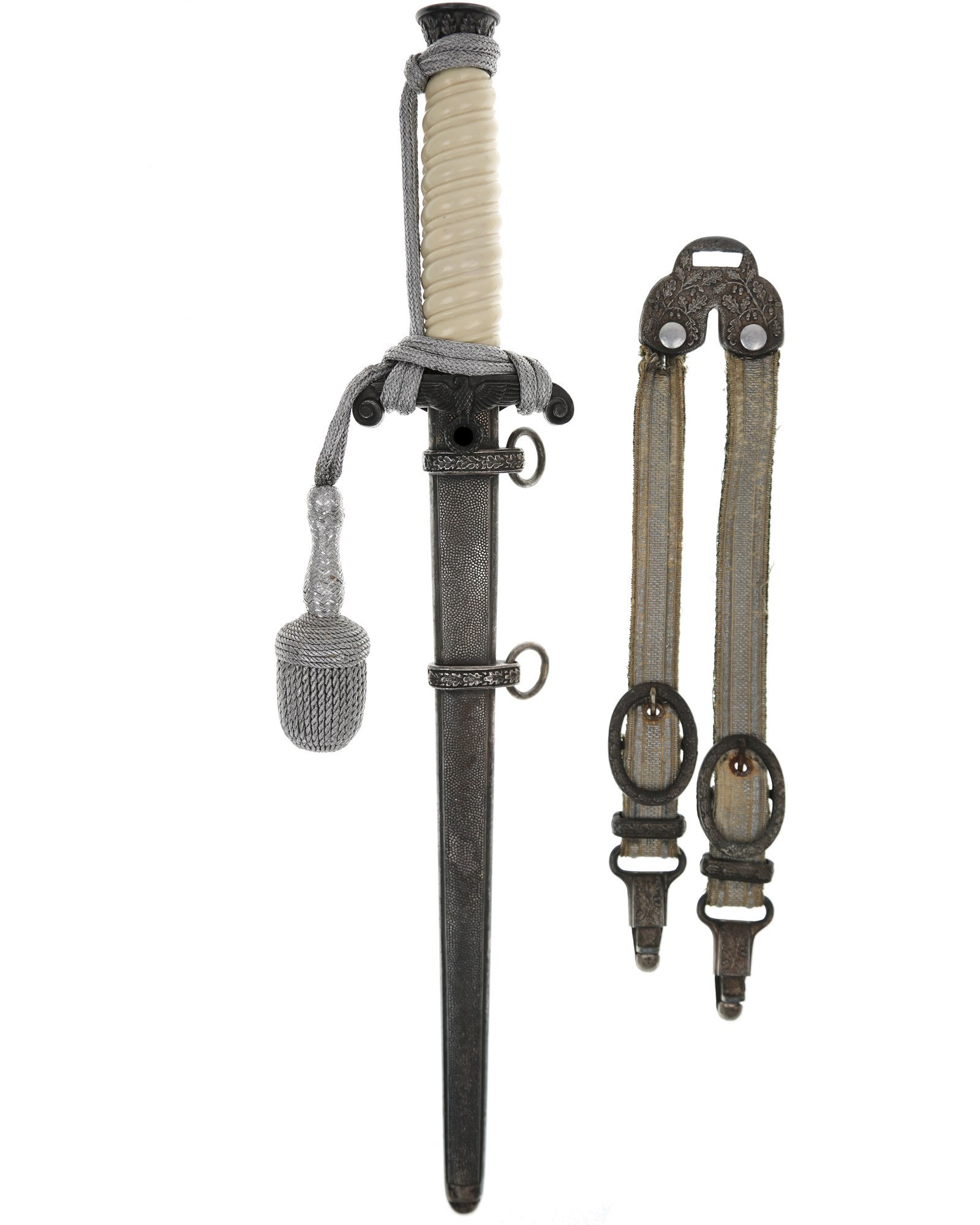 Silver-plated hilt fittings show age patina with much factory darkening remaining in the recesses of the well detailed oak leaf embellished pommel. Off-white grip is perfect with no chips or damage. Blade with no pitting or nicks to cutting edge and is complete with brown leather blade buffer pad. Dent-free, silver-plated scabbard is complete. Carl Eickhorn, etched squirrel holding sword TM. Dagger is complete with an EX+ 42cm portepee showing dark (almost brown) aging to the cord and minor wear to the stem and acorn. Deluxe hangers grade EX+ showing wear/age to the fabric with some separation of the facing from the backing, and are complete with silver plated oak leaf embellished upper tabs, heavy buckles, slides, and lower clips with raised oak leaves.