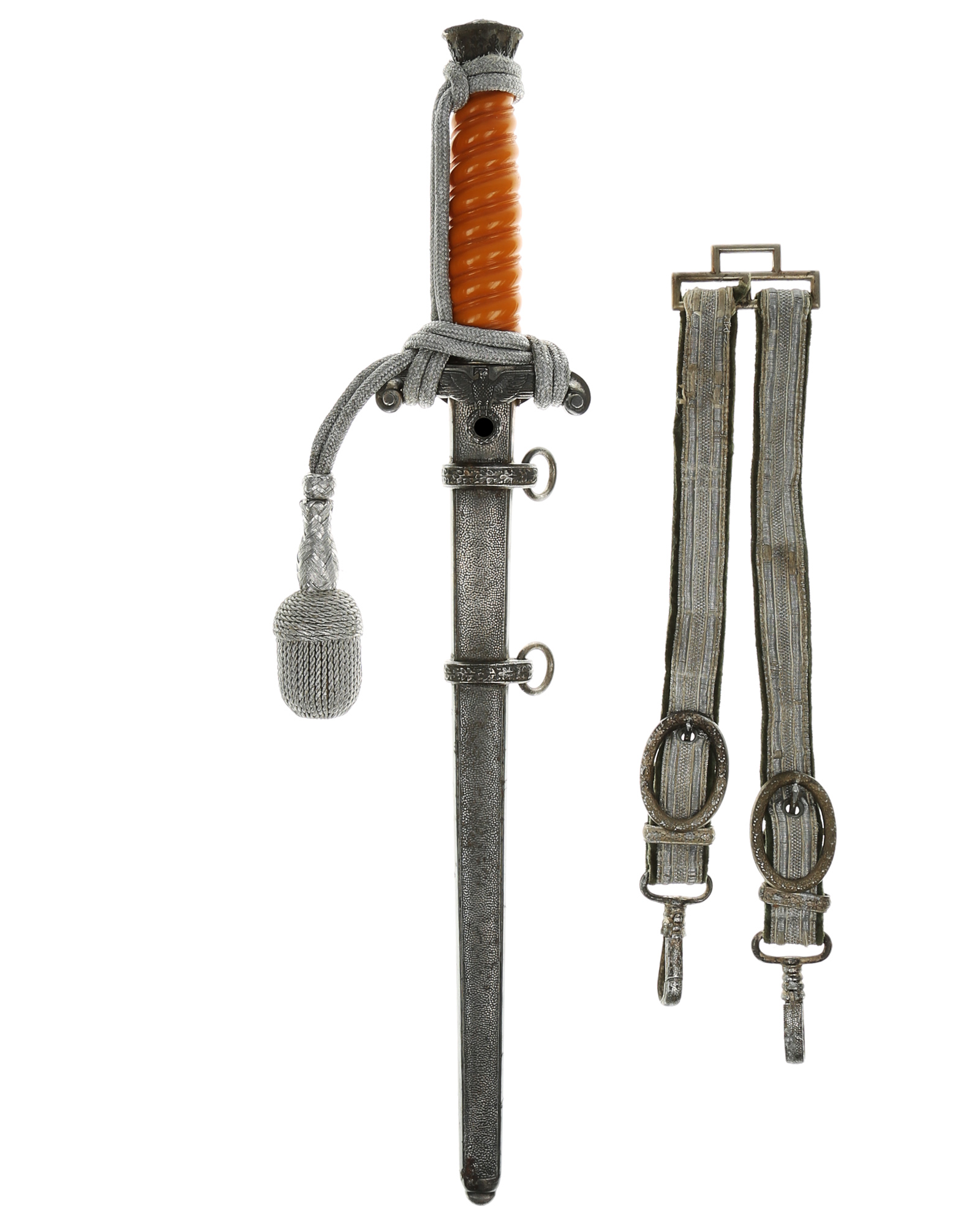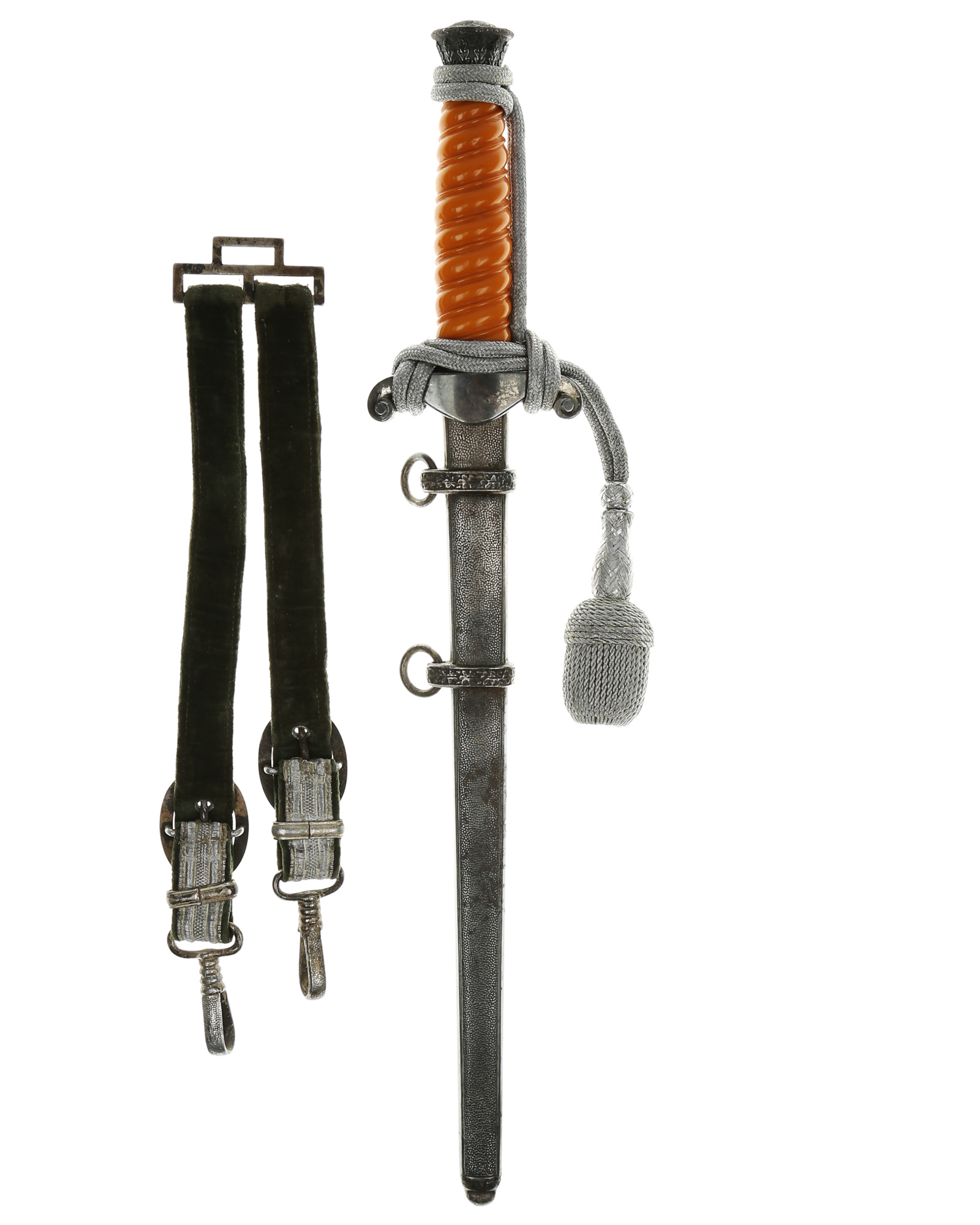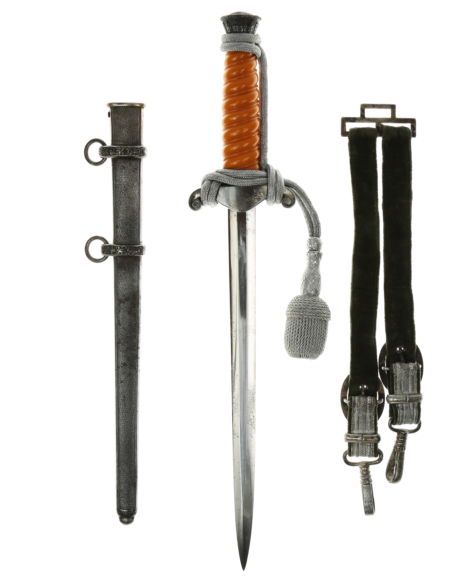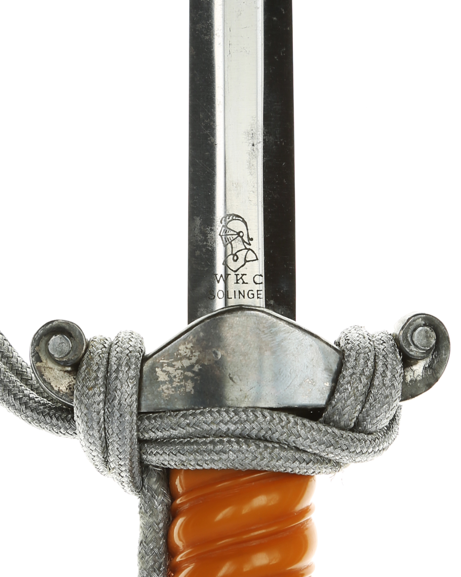 This WKC produced Army Officer's piece was done late in the war, and as such has the wartime gray finish. There were no plating materials left to finish these pieces by 1942 so they were issued with the finish of the metal itself. The crossguard and pommel are standard WKC mounts. The pommel has a good smooth rim and features the twelve standing oak leaves separated by acorns around the outside circumference. The ferrule matches the gray finish. The crossguard features the hatchet style beak. This eagle has excellent detail to his head, breast feathering, wing feathering, talons, wreath and raised swastika. The grip is a fine orange color being in perfect condition. This grip is wrapped with the original army portepee. The scabbard is a classic WKC variety also finished with the gray look. The scabbard has good pebbled surfaces and is nice and straight. The throat is retained by a single flatter head screw on the right side. The blade is a fine example having 100% of the factory grain and needleike tip. The reverse ricasso is etched with the logo consisting of the knighthead positioned over the firm’s name and location, WKC Solingen. The brown leather washer is in place. A good example of a late produced piece. Dagger is complete with set of hangers which show light wear to fabric straps and loss of silver wash to fittings.