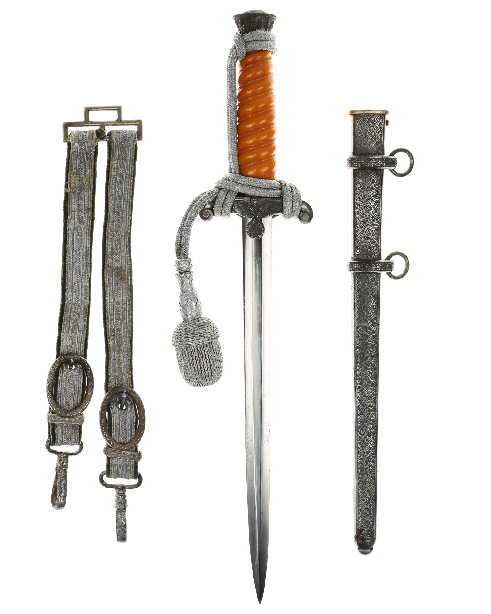 Heeres Offiziersdolch der Wehrmacht wurde ursprünglich von dem Berliner Künstler PAUL CASBERG (Pseudonym) entworfen. Das Tragen des Heeresdolches wurde am 4. Mai 1935 offiziell genehmigt. Für den Dolch wurde auch ein Aluminium Portepee und 7 unterschiedliche Gehänge entwickelt. Die Herstellung des Heeresdolches war am 27. Mai 1943 und das Tragen des Dolches am 05. September 1944 eingestellt worden. Ab dem 24. Dezember 1944 wurden den Offizieren befohlen, anstelle des Heeresdolches eine andere Waffe zu tragen. Da der Heeresdolch ein persönlicher Gegenstand der Offiziersbekleidung war, kauften meistens die Offiziere den Dolch für ihr eigenes Geld. Ein Heeresdolch hat damals ca. 11,50 RM (Reichsmark) gekostet.