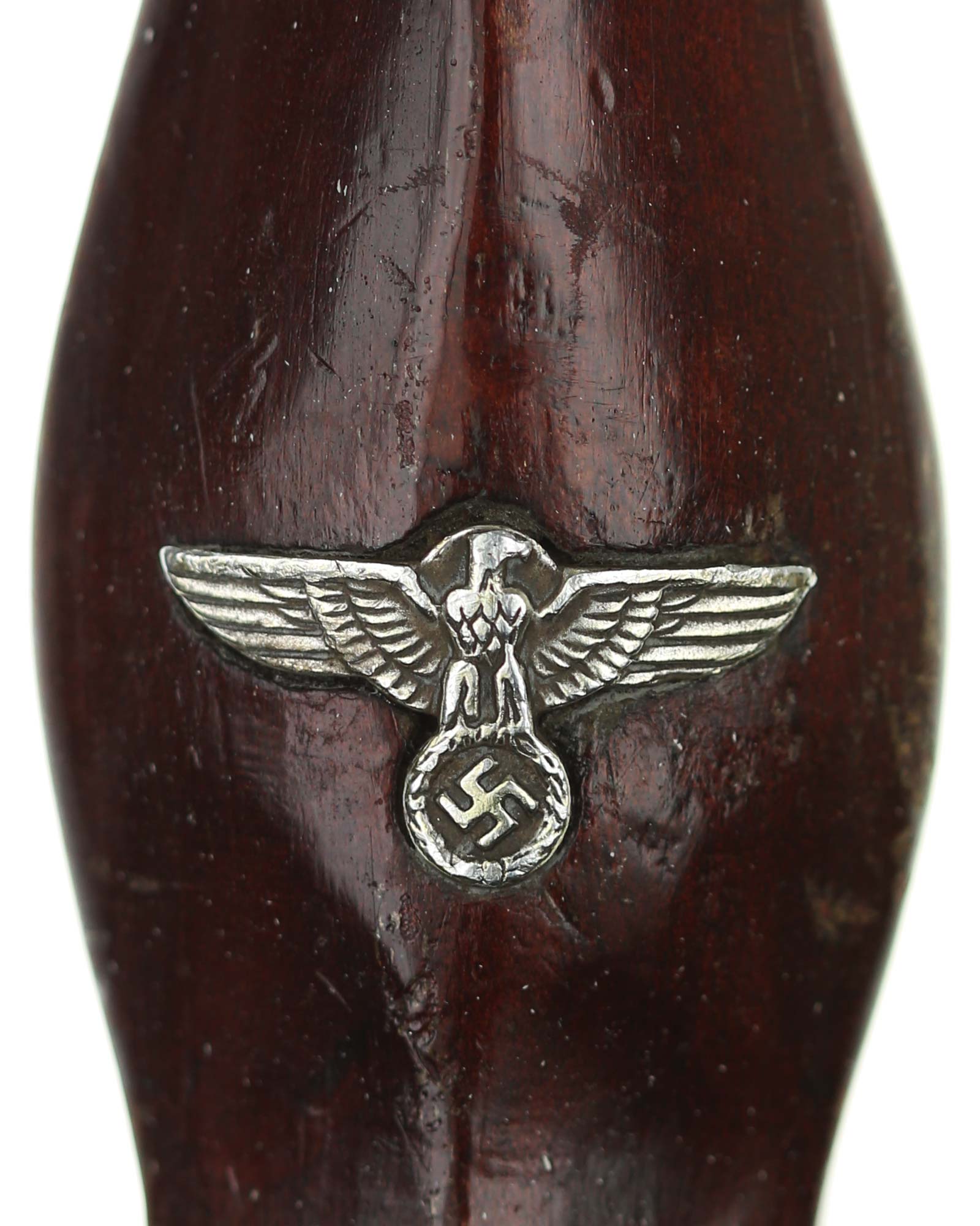 NSKK Chained Dagger by WMW - Waffenfabrik Max Weyersberg, Solingen. The blade is clean with Inscription Everything for Germany «Alles für Deutschland» and the other side RZM M7/12. Fittings are nickel plated, excellent condition. The grip is a dark reddish mahogany colour having a sharp contour ridge. Chain hanger is maker marked «NSKK Musterschutz Korpsführung».