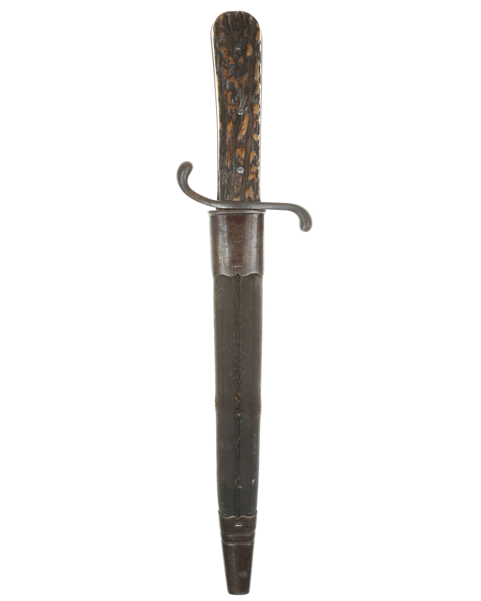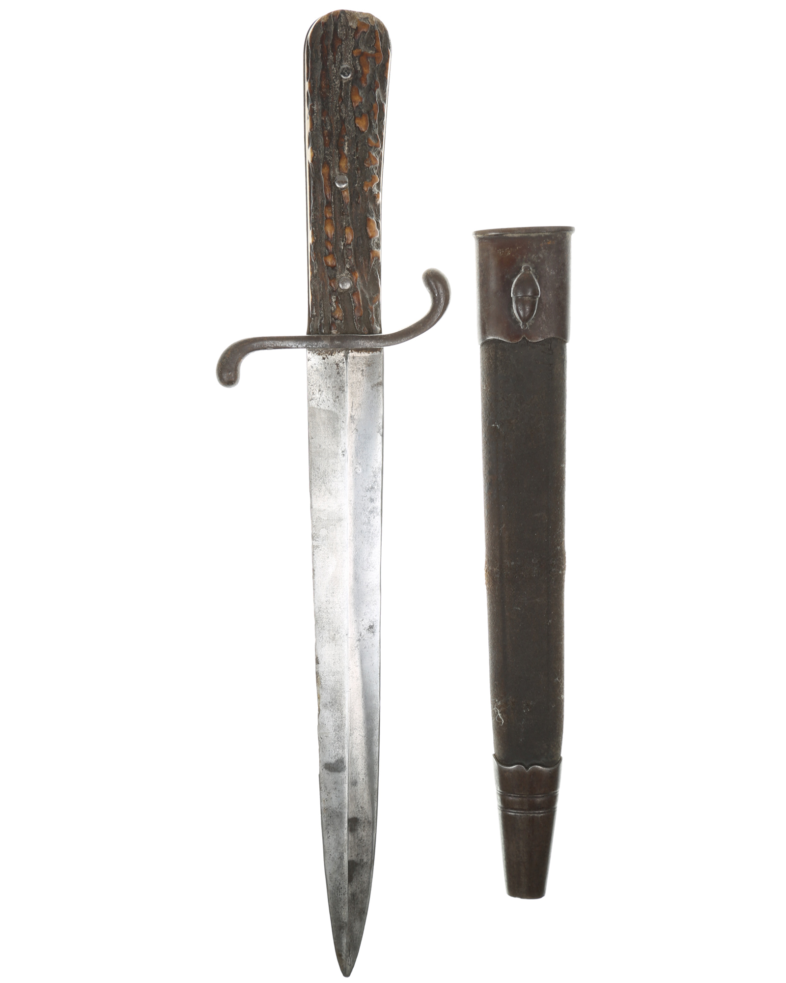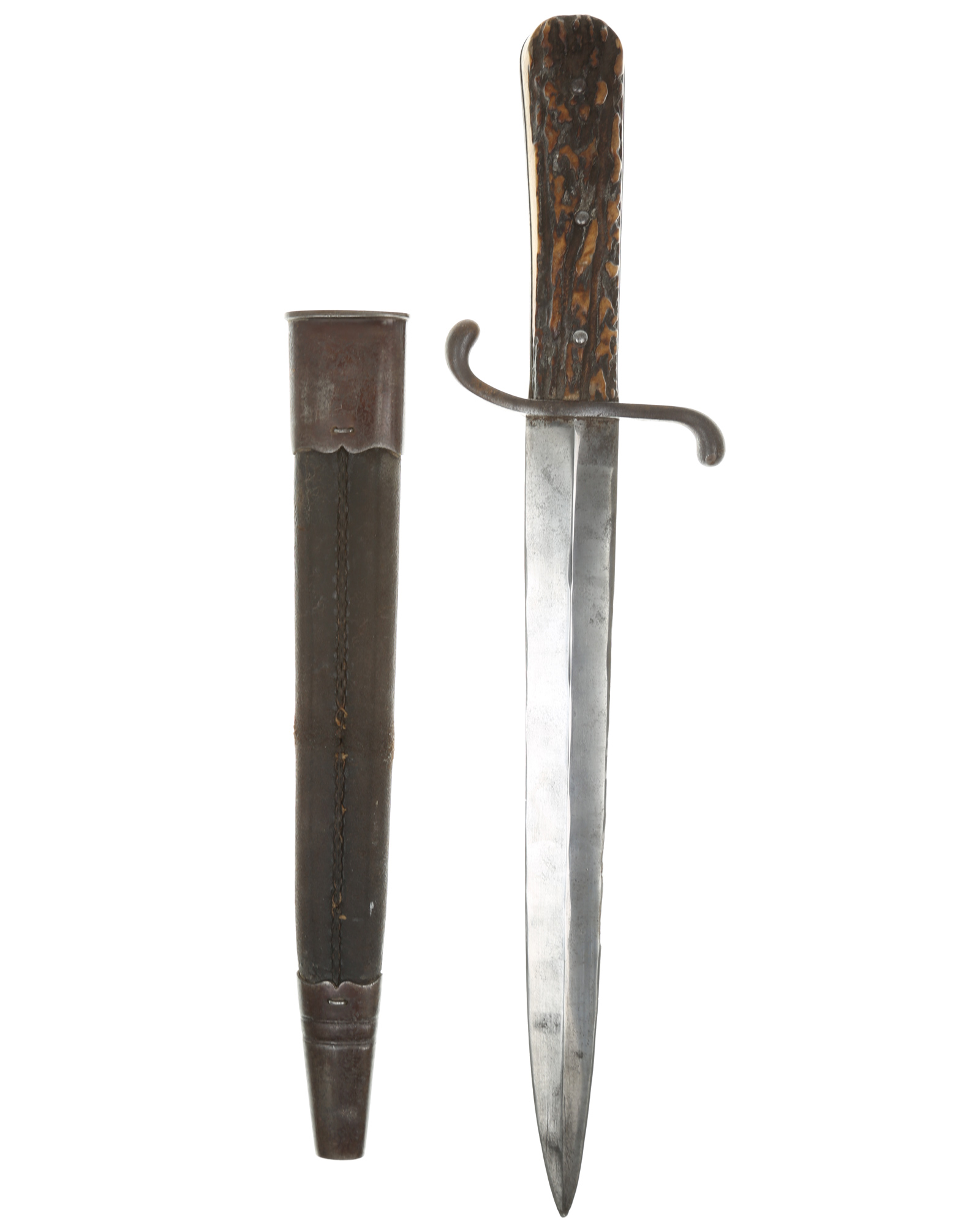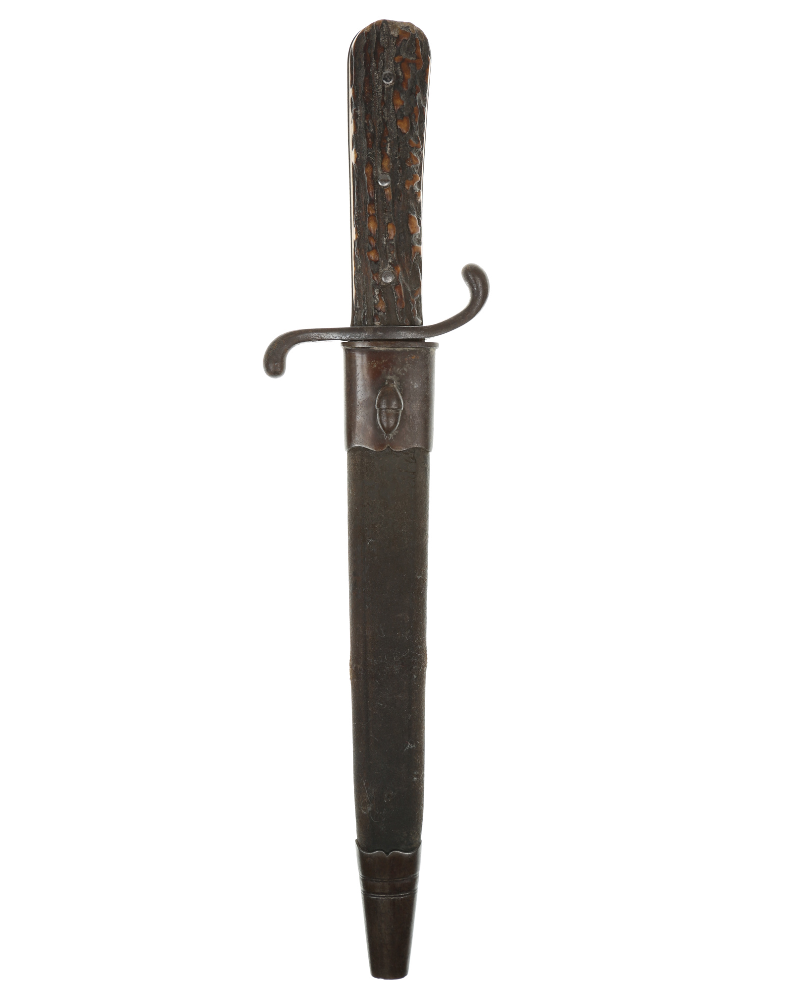 Hirschfanger for hunters. The blade is 27 cm long. No manufacturer on the blade. The grip has two stag scales. The leather of the scabbard is well preserved. Forged blade with polished finish. The overall length is 40.2 cm.