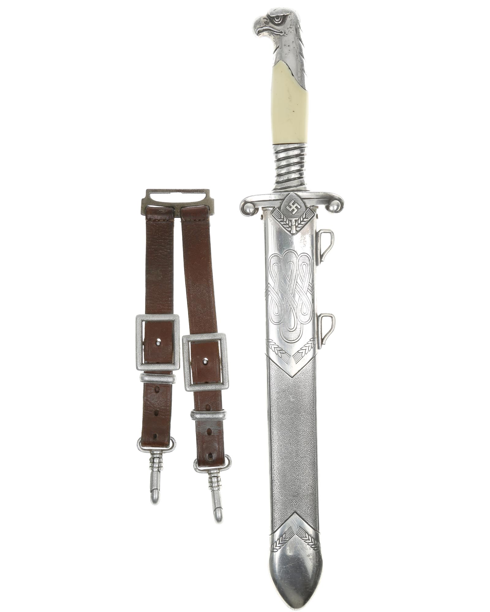 This Alcoso produced RAD piece remains in outstanding condition throughout. All of the silvering remains throughout the bird's head, ferrule, obverse crossguard, and almost all of the reverse crossguard, having only a little slight wear on the lower lip of the guard edge. The pommel details are outstanding, having the original factory blackening deep in the bird's eyes, nasal area, beak area, and into the four decorative slots, which are equally positioned down the back strap of the bird's head. The ferrule has the angled accent lines, which also have a good part of the factory darkening in the backgrounds. The crossguard has outward running quillon arms which end in curls. The reverse is plain and the obverse depicts the RAD symbol in the center. It is a spade which has a lined surface with a raised out plain mobile swastika contrasting nicely with the backgrounds lines. The spade is resting between two wheat shafts. The grip plates are also outstanding, both being in totally perfect condition and being an attractive off white color.