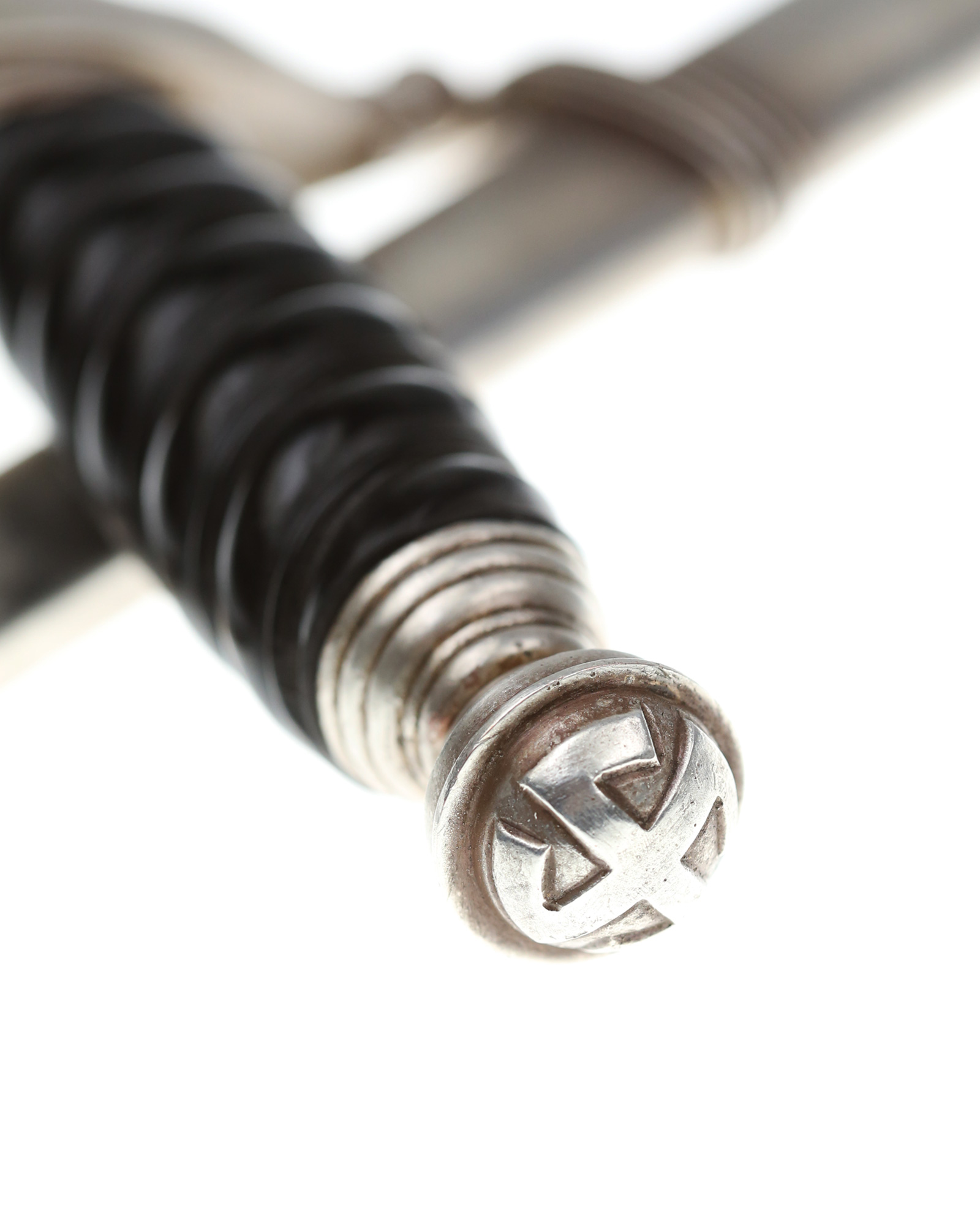 Grip: Aluminum hilt fittings show minor surface wear with much frosting remaining to the spherical pommel with raised sunwheel swastika, ribbed ferrule and crossguard with winged railcar wheel Bahnschutz insignia on the obverse langet. The crossguard winged insignia has a casting flaw in the right wing as found on Eickhorn produced 2nd model Bahnschutz daggers. Black solid celluloid ridged grip is perfect.