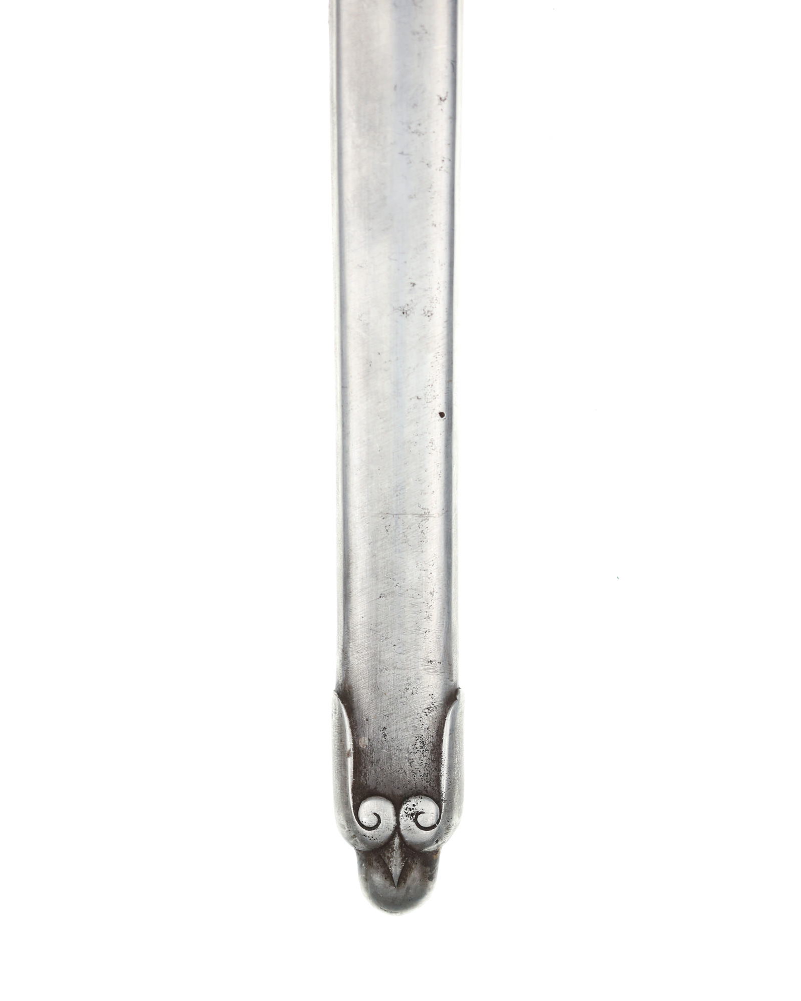 Scabbard: Dent-free, polished, frosted-steel scabbard shows some minor surface wear. The scabbard has two ribbed aluminium suspension rings fitted; a small scrolled ornate feature completed the bottom of the scabbard tip.