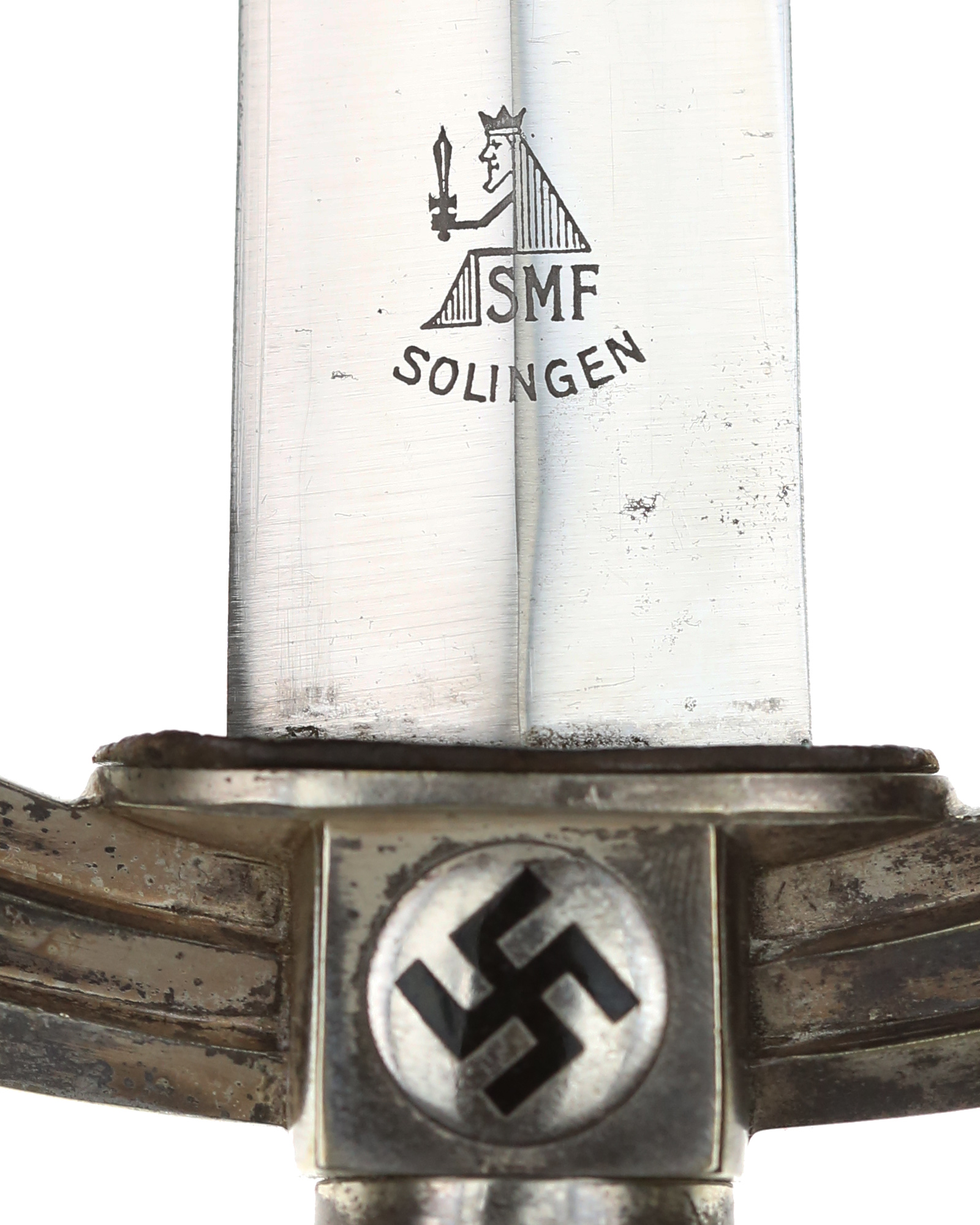 Blade: The blade is absolutely outstanding. This blade is still factory mirror bright and retains its needlelike tip. The blade has 100% grain in the surfaces. A true mint blade here! The producer etching is on the reverse ricasso. The etched trademark consists of a seated king which is holding an upward pointing sword. The king is sitting on the firm’s initials, SMF - Stöcker & Co. (Solinger Metallwaffenfabrik), Solingen. This fine blade is protected by the original matching blue grained leather washer.
