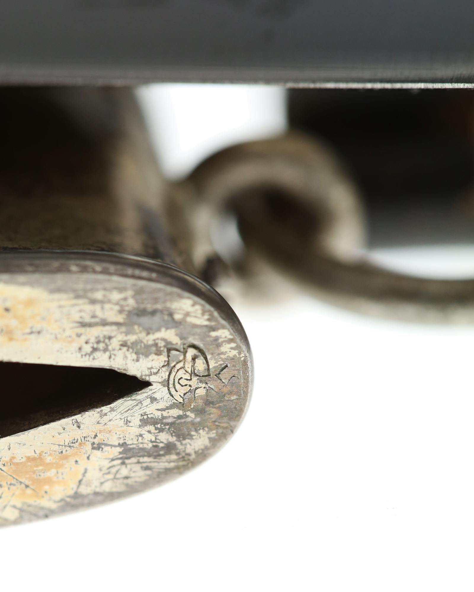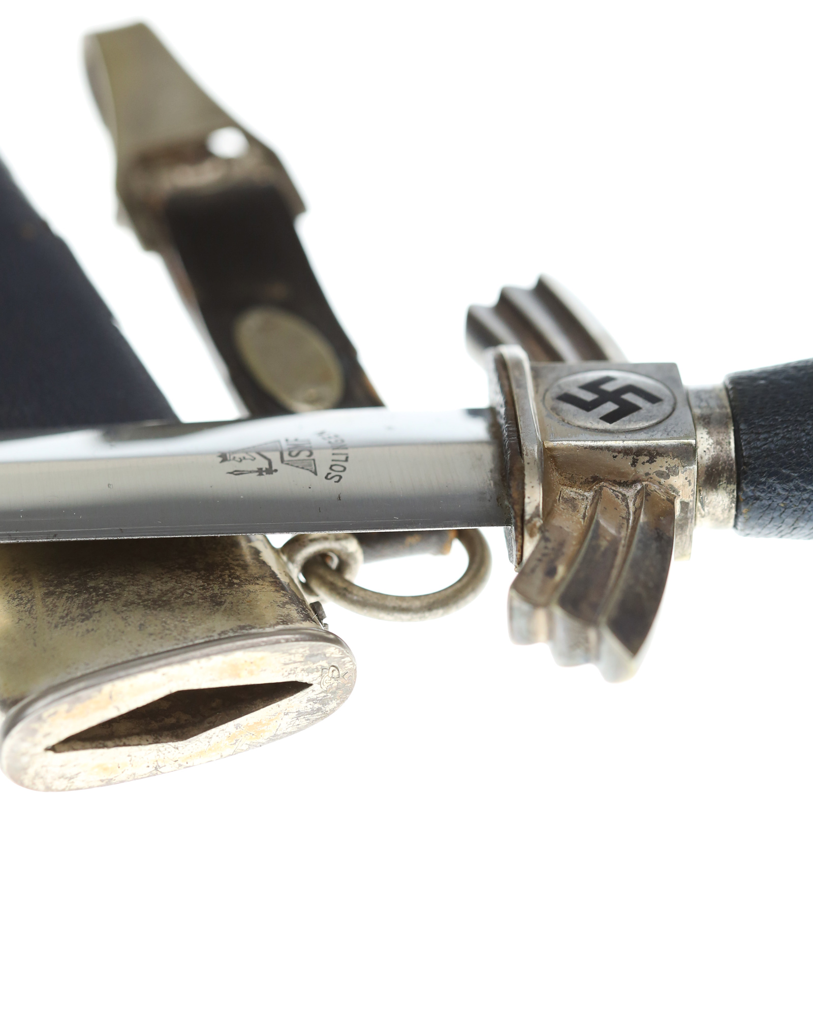 Grip: The pommel cap has the standard three segments and shows no damage from hits. There is some old frosting that remains on the ferrule below. The center block still has crisp rectangular squares having the separate added medallions which are complete with mobile black enamel swastikas. The crossguard arms are the three segment type which go downwards slightly. The letter “K” is stamped into one end quillon. There is also frosting evident in the recesses of these quillon arms. The grip is a wood base being bulbous in the center and tapering on both ends. This grip is covered with fine Moroccan leather being two-piece construction. The leather retains is full grain and is 100% throughout.