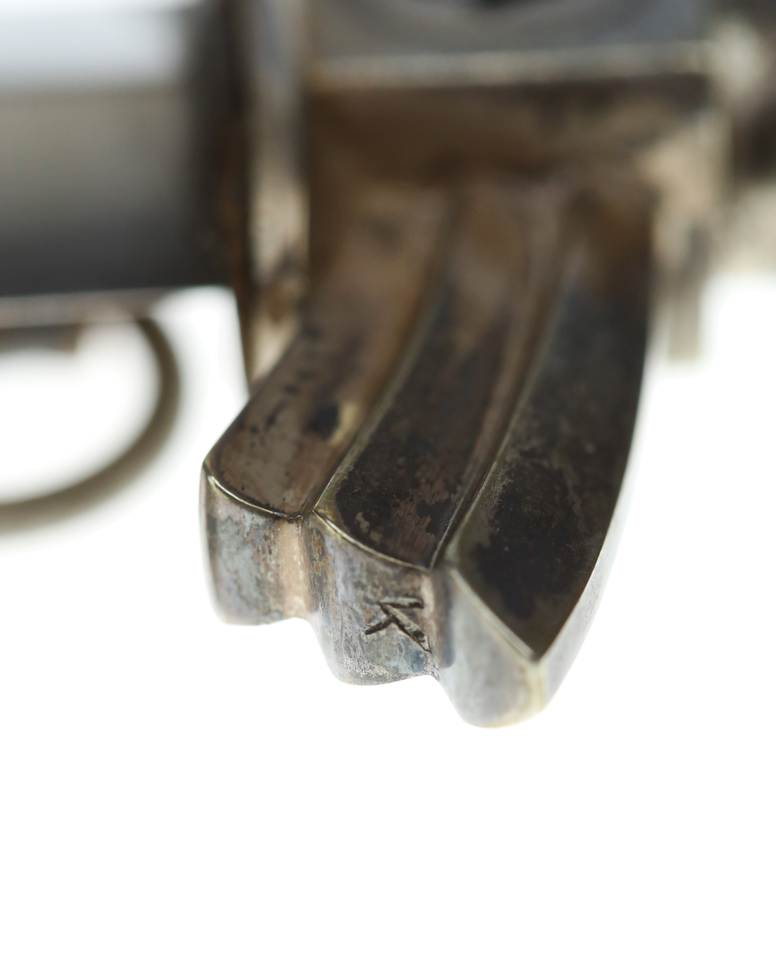 Scabbard: The scabbard shell is nice and straight. This shell is covered with matching Moroccan leather. This leather is perfect except for a couple of areas along the right edge. We put a couple of small matching leather patches in the area which covers most of the flaw. It is not bad however and is really a natural occurrence one would expect to see on a dagger which is some seven decades old. The scabbard mounts are the solid nickel type and both are in outstanding condition to include the lower ball. The flatter style screws are in the sides and are all in place and are not turned. The carrying ring is complete with the original short hanger.
