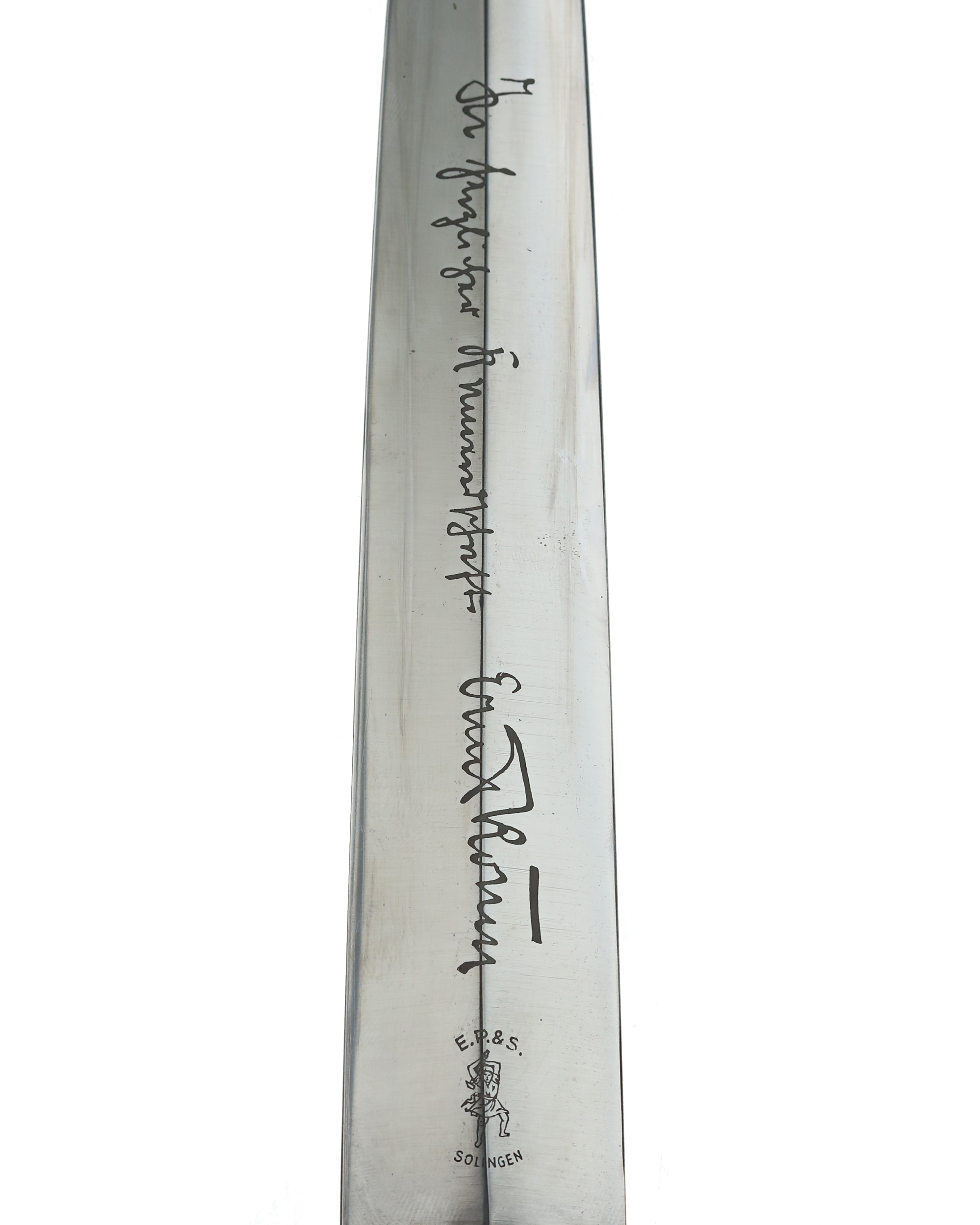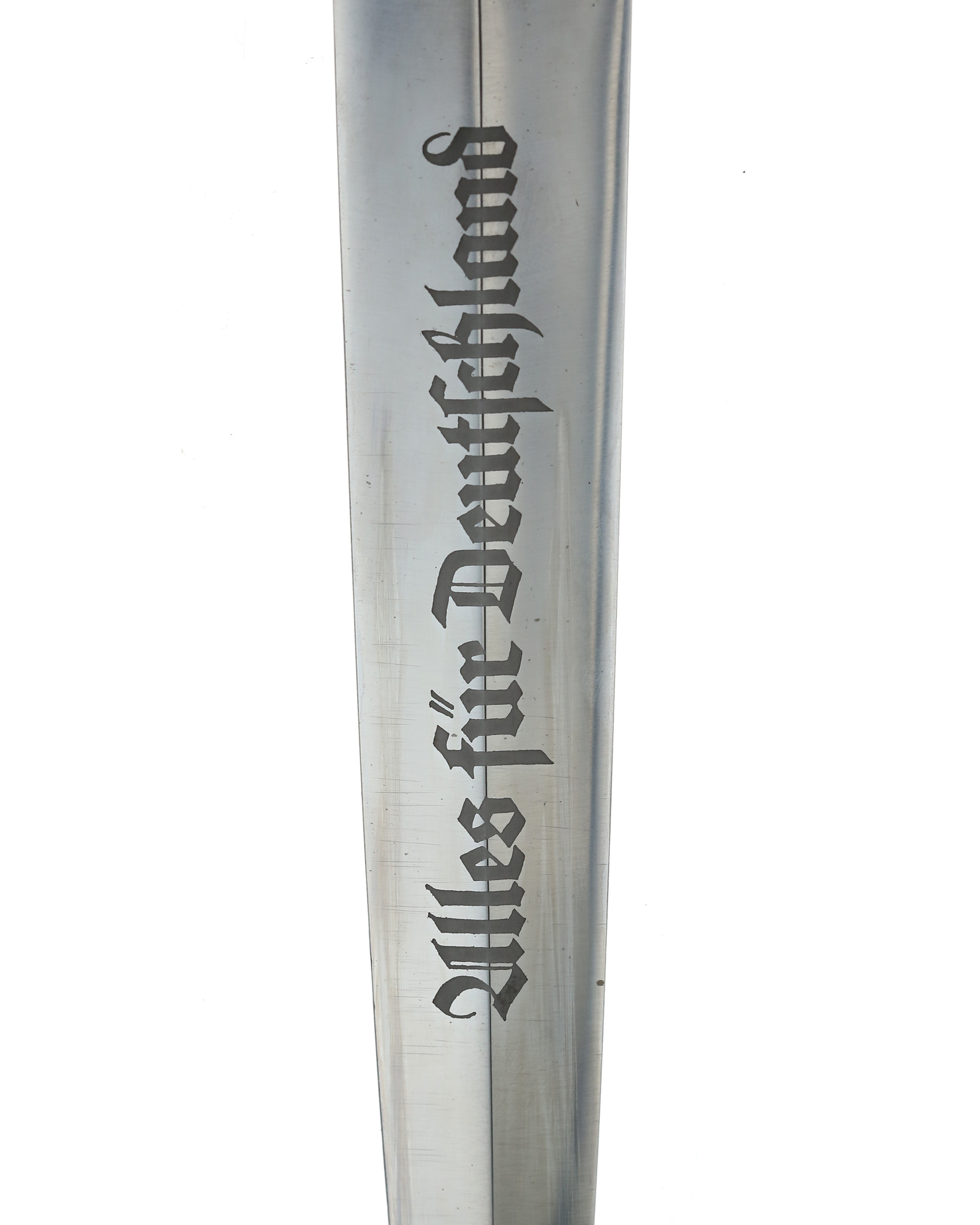 This SA [Sturmabteilung] Honor Dagger in fine condition. Model 1933. The total length is 37.2 cm. Early Nickel fittings, lower guard with "Nrh" stamp. The Dagger has the full rohm inscription: In herzlicher Kameradschaft Ernst Rohm. Maker mark on the blade: E.P.&S. in Solingen.