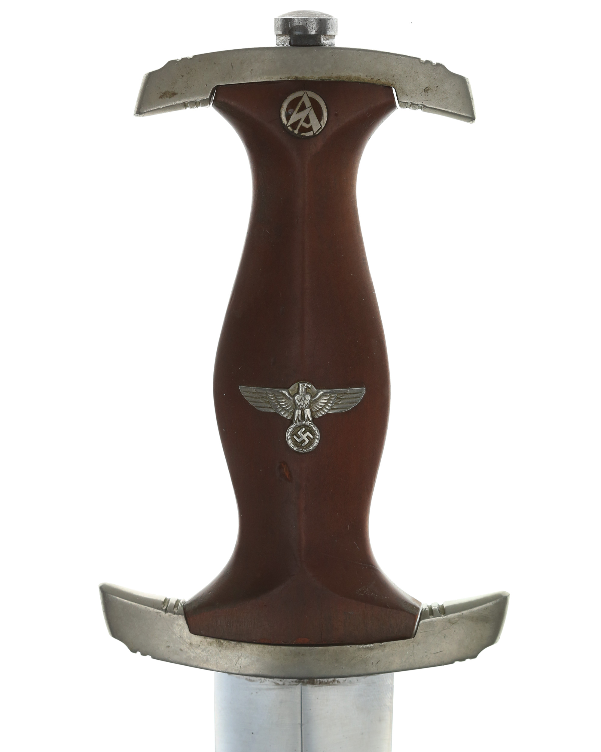Grip: The mounts on this example are all solid nickel. The lower crossguard is Gruppe marked, “Nrh”. The grip is a fine furniture-like wood. This grip is of medium contour construction and is in nice condition. The SA runes button has good enamel and is perfectly placed. This eagle is in fine condition throughout having full details to its head, eye, breast and wing feathering, talons, wreath and mobile swastika.