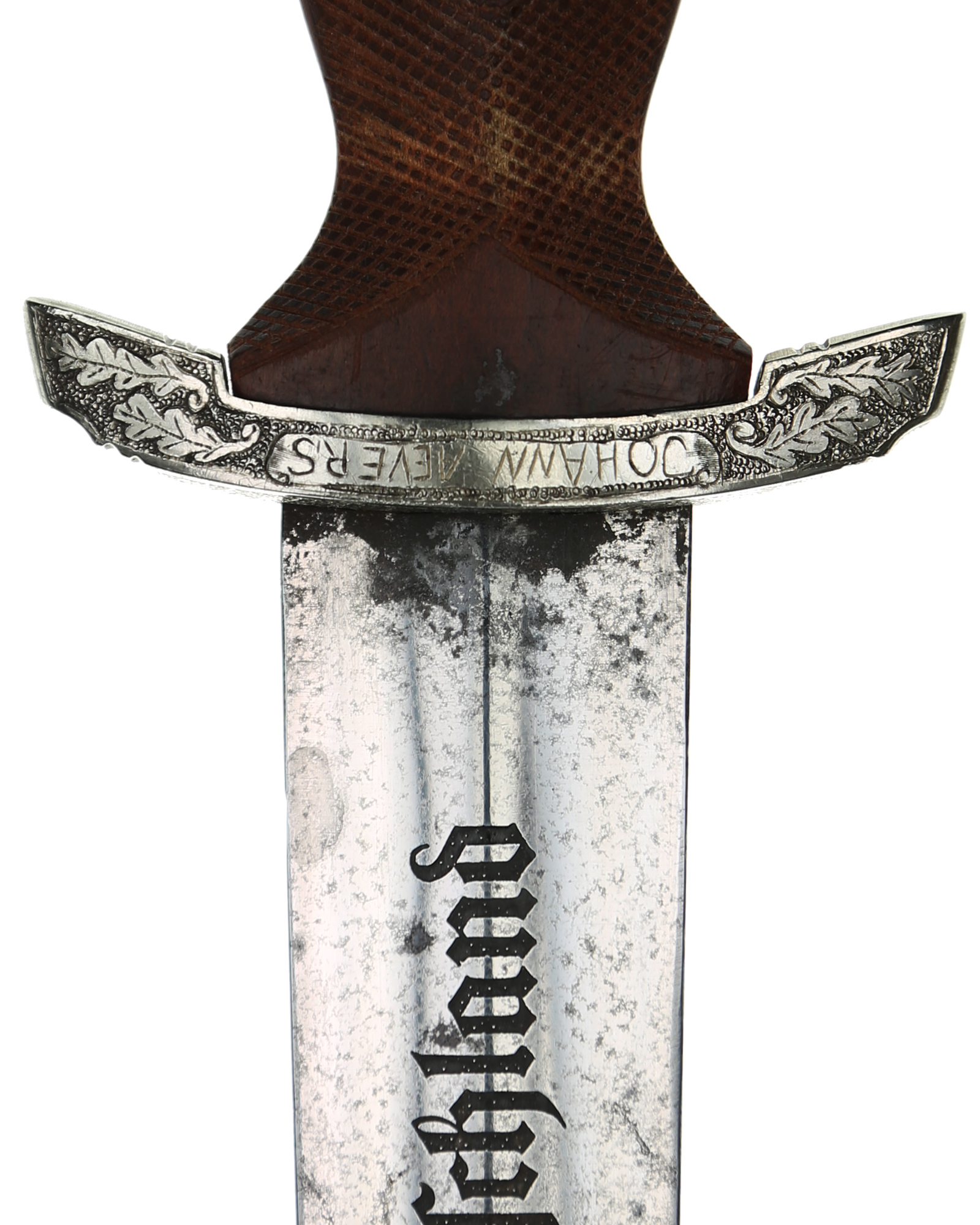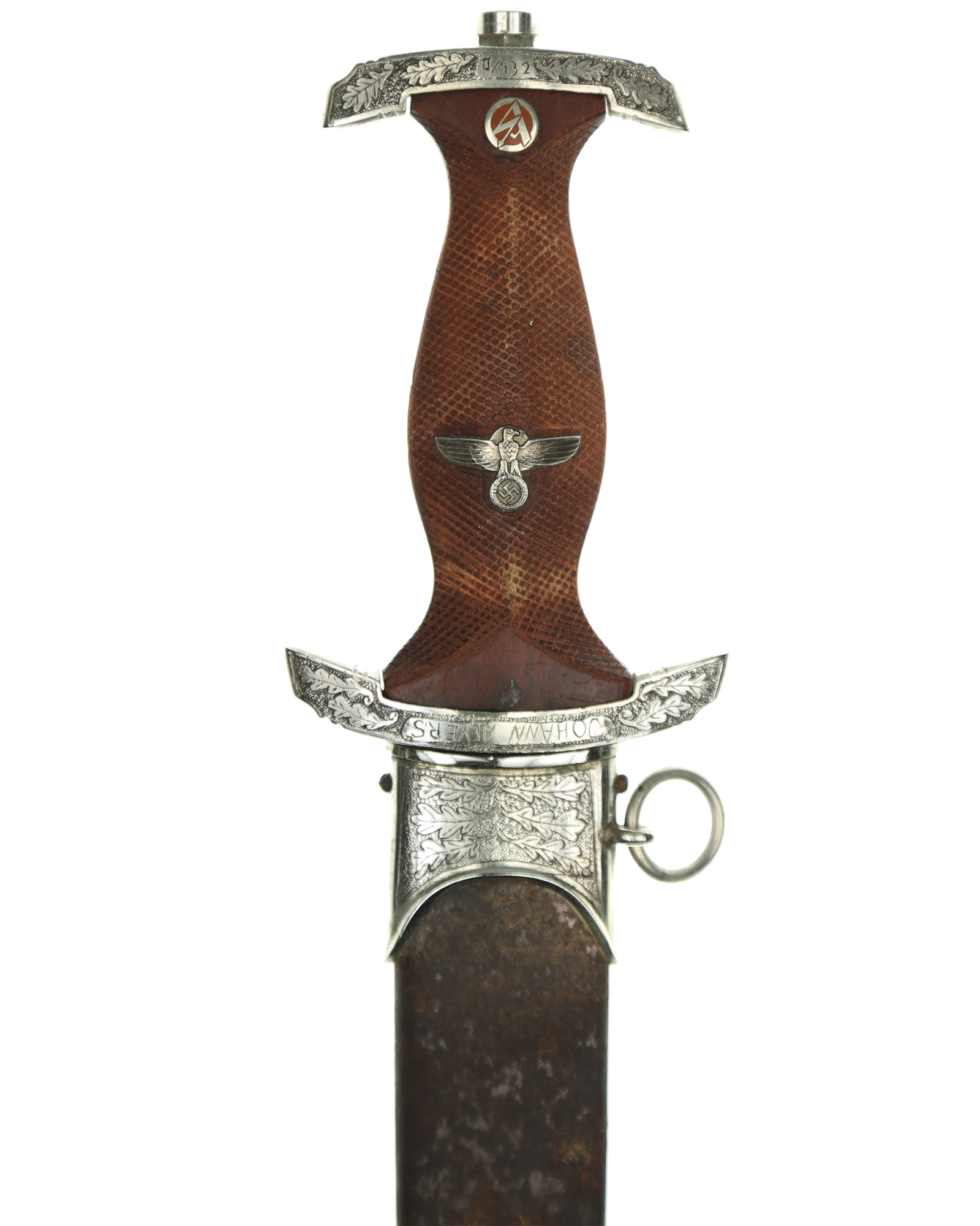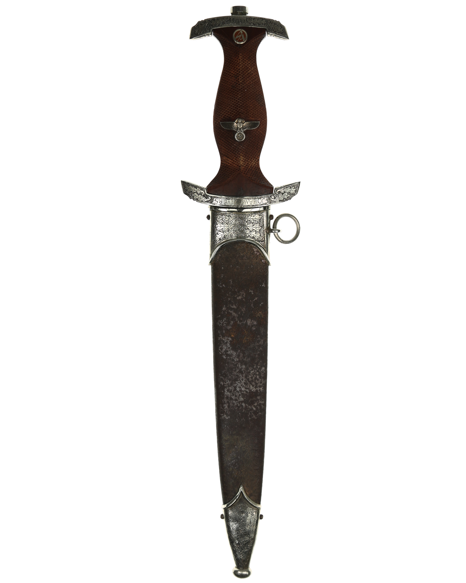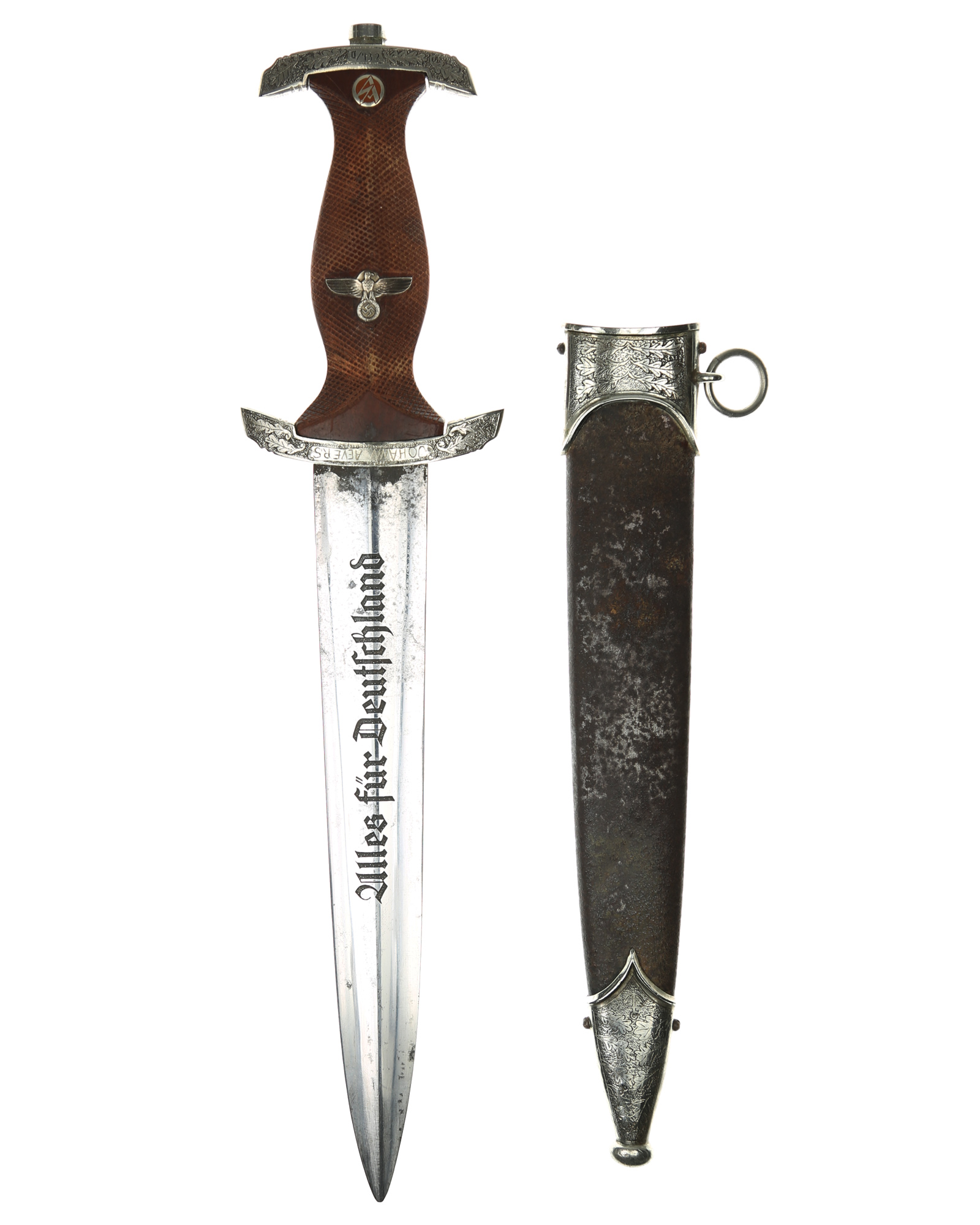 This Heller SA Presentation Dagger is a completely customized 1933 SA dagger belonging to Johann Aevers. A custom piece like this was manufactured under an individual contract and quite expensive. SA Dress dagger by Gebr. Heller, Schmalkalden with engrave hilt and scabbard fittings. The fittings feature a deeply engraved oak leaf motif while retaining one hundred percent of the dark gray background frosting and reflect the very finest German craftsmanship. The underside of the lower crossguard bears the benchmark BO - Bayrische Ostmark and inscription on the obverse crossguard «Johann Aevers». SA Dagger is with checkered grip, the quality of the checkering is consistent with the work found on high quality rifle and shotgun grips. The woodcarver´s technique of leaving the raised portions of the grip, i.e., above and below the crossguards and surrounding the grip eagle, perfectly plain and without the checkered design. The blade is in EXC++ example having that real dark motto that we often see on the Heller product. This blade has the original crossgrain. The reverse ricasso is matching dark etched with a double circle logo. Contained within is the firm’s name and location, Gebrüder Heller Schmalkalden. Inside the circles is depicted an anchor. The fit of the blade shoulders to the crossguard contours is perfect. A nice interesting dagger here.