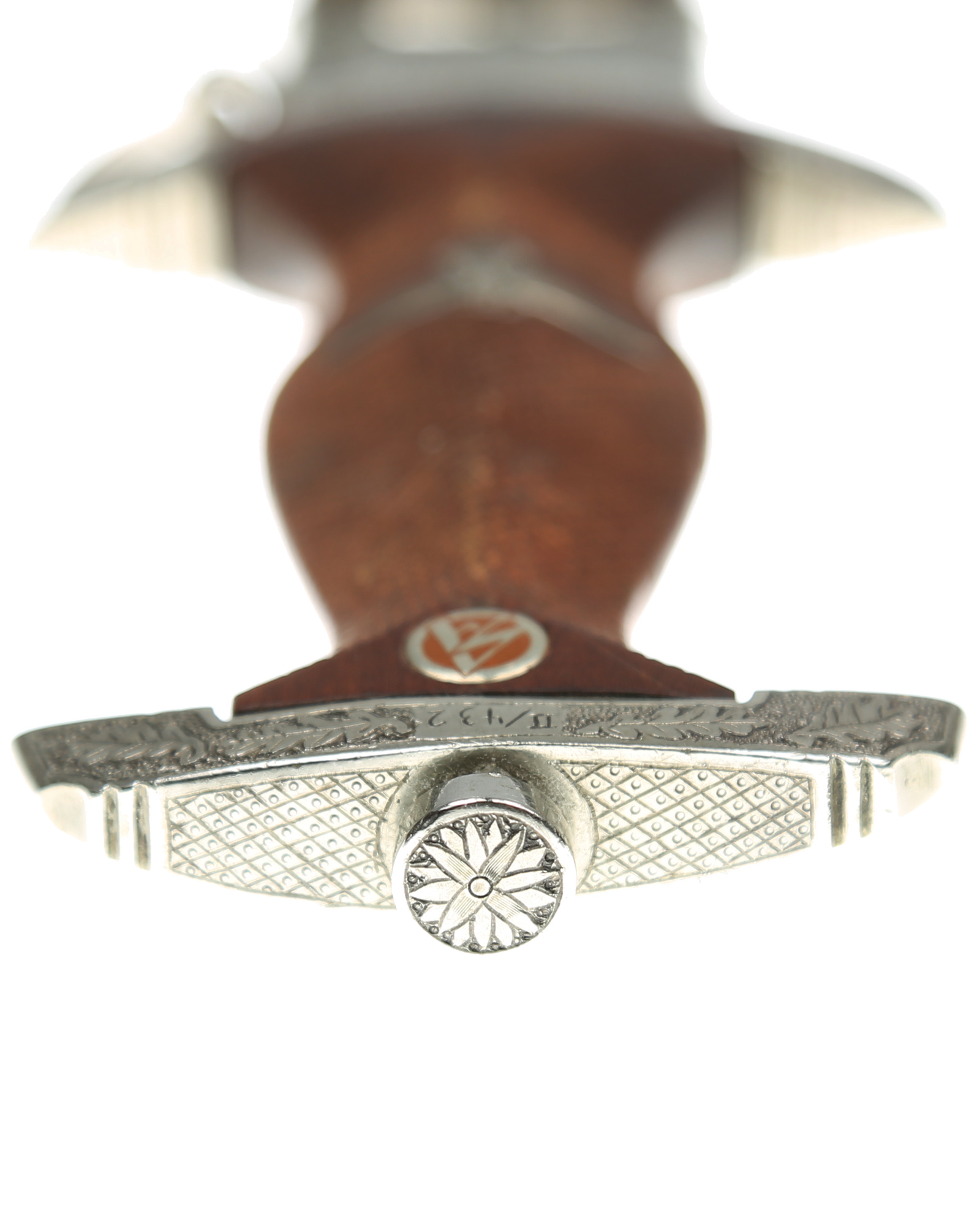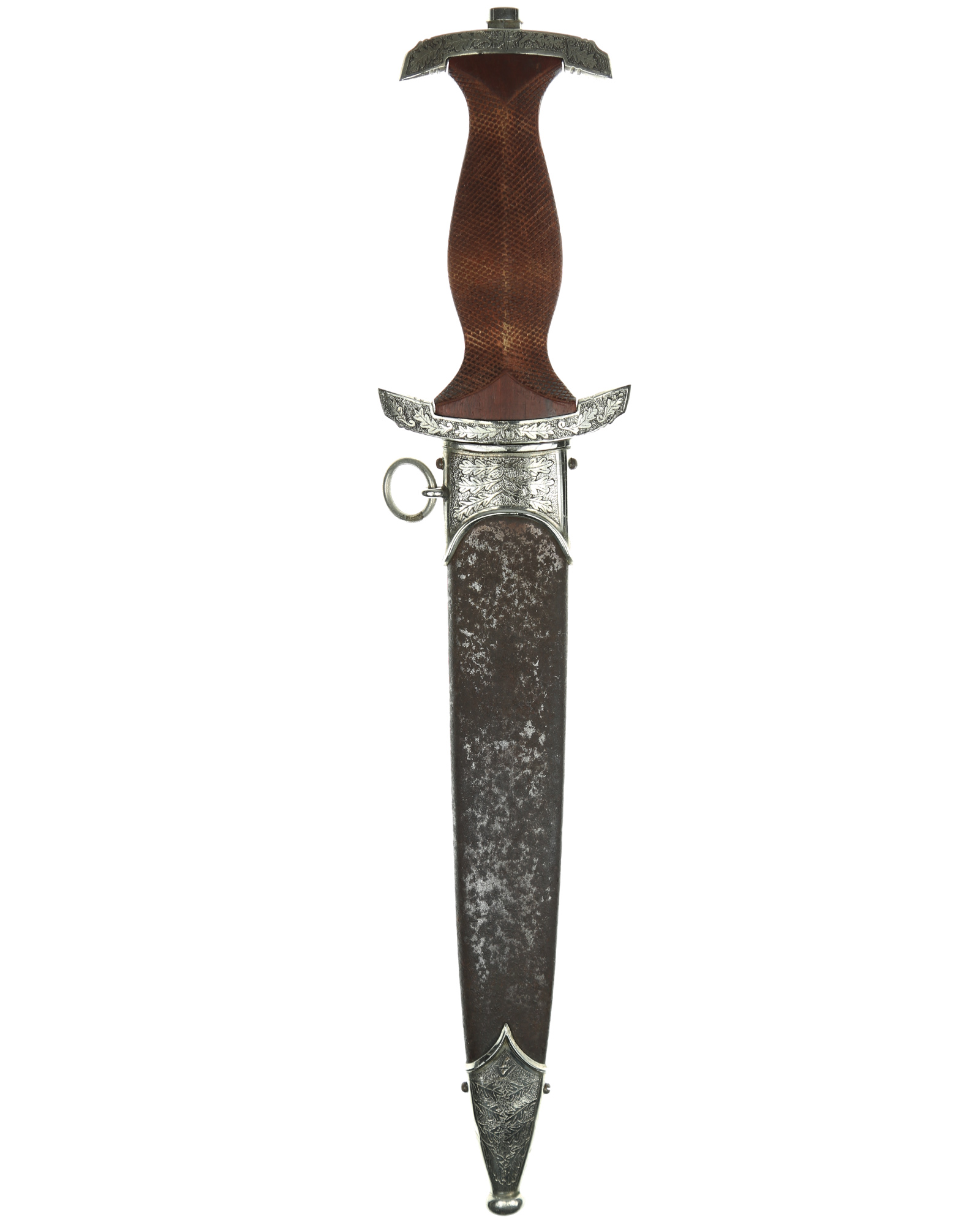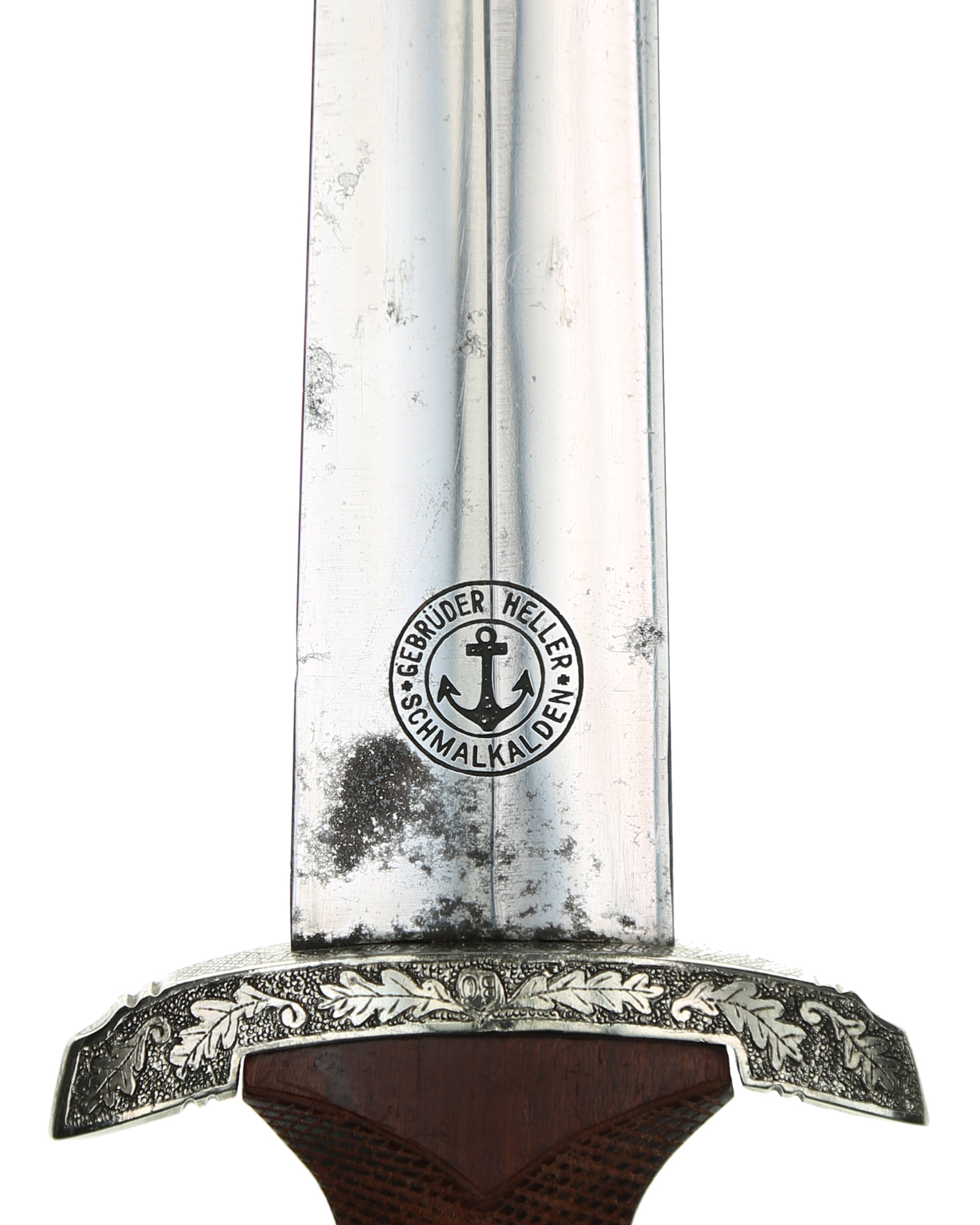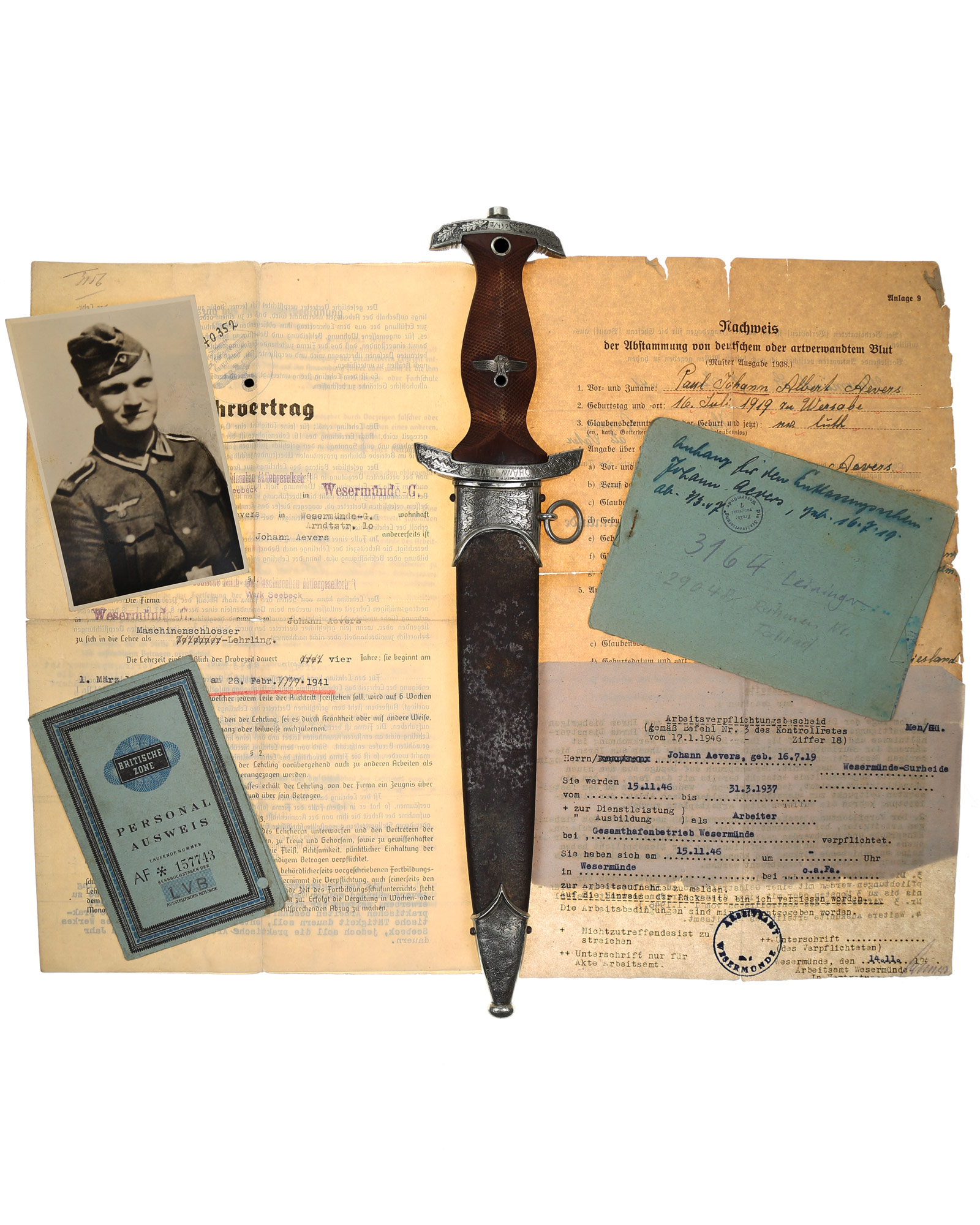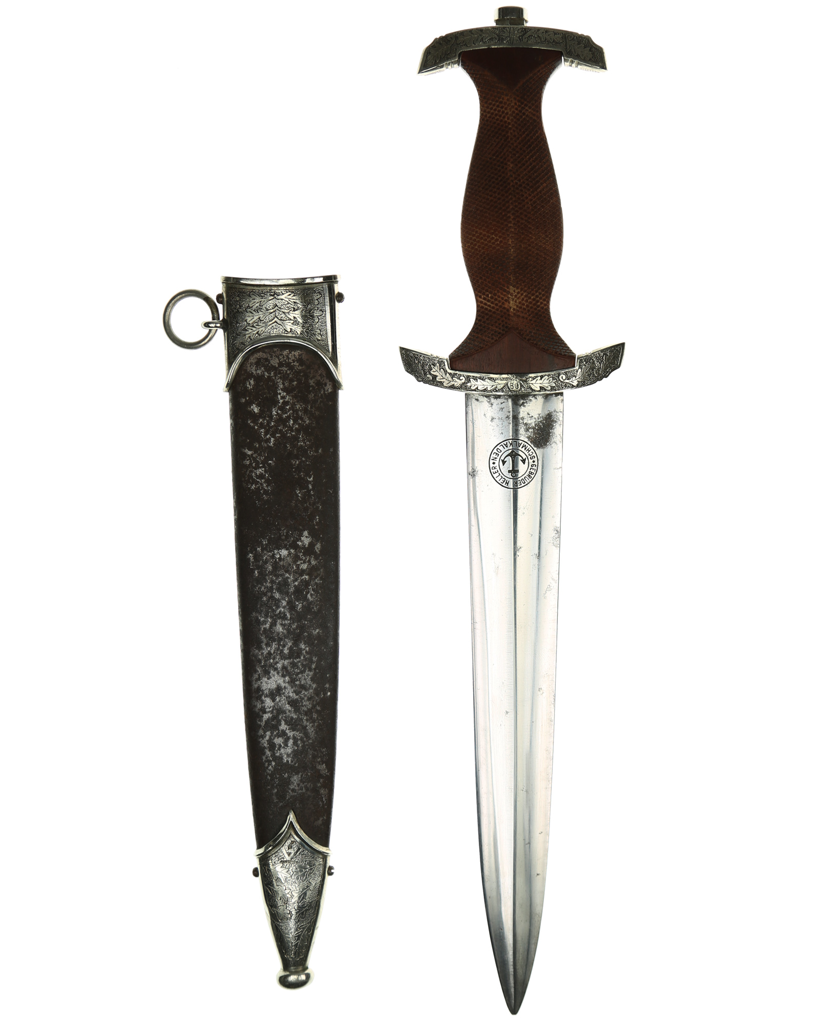 This Heller SA Presentation Dagger is a completely customized 1933 SA dagger belonging to Johann Aevers. A custom piece like this was manufactured under an individual contract and quite expensive. SA Dress dagger by Gebr. Heller, Schmalkalden with engrave hilt and scabbard fittings. The fittings feature a deeply engraved oak leaf motif while retaining one hundred percent of the dark gray background frosting and reflect the very finest German craftsmanship. The underside of the lower crossguard bears the benchmark BO - Bayrische Ostmark and inscription on the obverse crossguard «Johann Aevers». SA Dagger is with checkered grip, the quality of the checkering is consistent with the work found on high quality rifle and shotgun grips. The woodcarver´s technique of leaving the raised portions of the grip, i.e., above and below the crossguards and surrounding the grip eagle, perfectly plain and without the checkered design. The blade is in EXC++ example having that real dark motto that we often see on the Heller product. This blade has the original crossgrain. The reverse ricasso is matching dark etched with a double circle logo. Contained within is the firm’s name and location, Gebrüder Heller Schmalkalden. Inside the circles is depicted an anchor. The fit of the blade shoulders to the crossguard contours is perfect. A nice interesting dagger here.