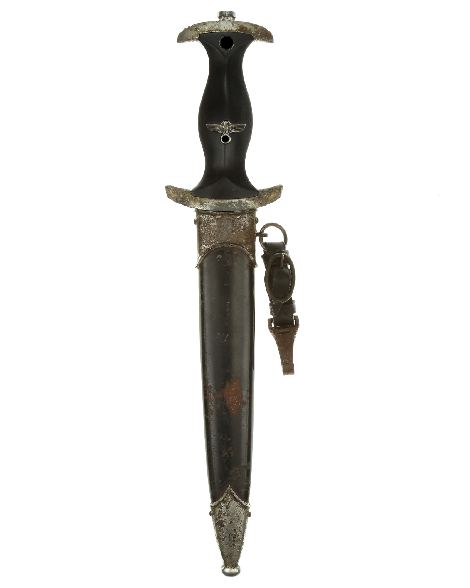 This Mid-period SS Dagger shows some, period wear. The dagger does not look to have been cleaned since the war. This SS example is equipped with all nickel mounts to the hilt and scabbard. The grip has a medium ridge contour construction, showing mild usage signs here and there. The reverse grip is still in fine condition.The runes button is placed straight from north to south. It has perfect enamel surfaces. The runes are enclosed with two matching silvered circles. A decent hilt here; one that is indistinguishable from the early initial production types. The scabbard shell is straight throughout. At first glance it appears to have an aged anodized finish. The mounts are both in good condition, to include the lower ball. These mounts are retained with the original screws, which are the early nickel type. The blade is a used condition and can be eventually improve. The sword and the dagger are not yet cleaned. The reverse ricasso is matching etched with the SS contract code and production date, 807/37. Above the code, is a double circle containing SS runes, and below, is a double RZM circle. The blade shoulders perfectly meet the lower cross guard contour.