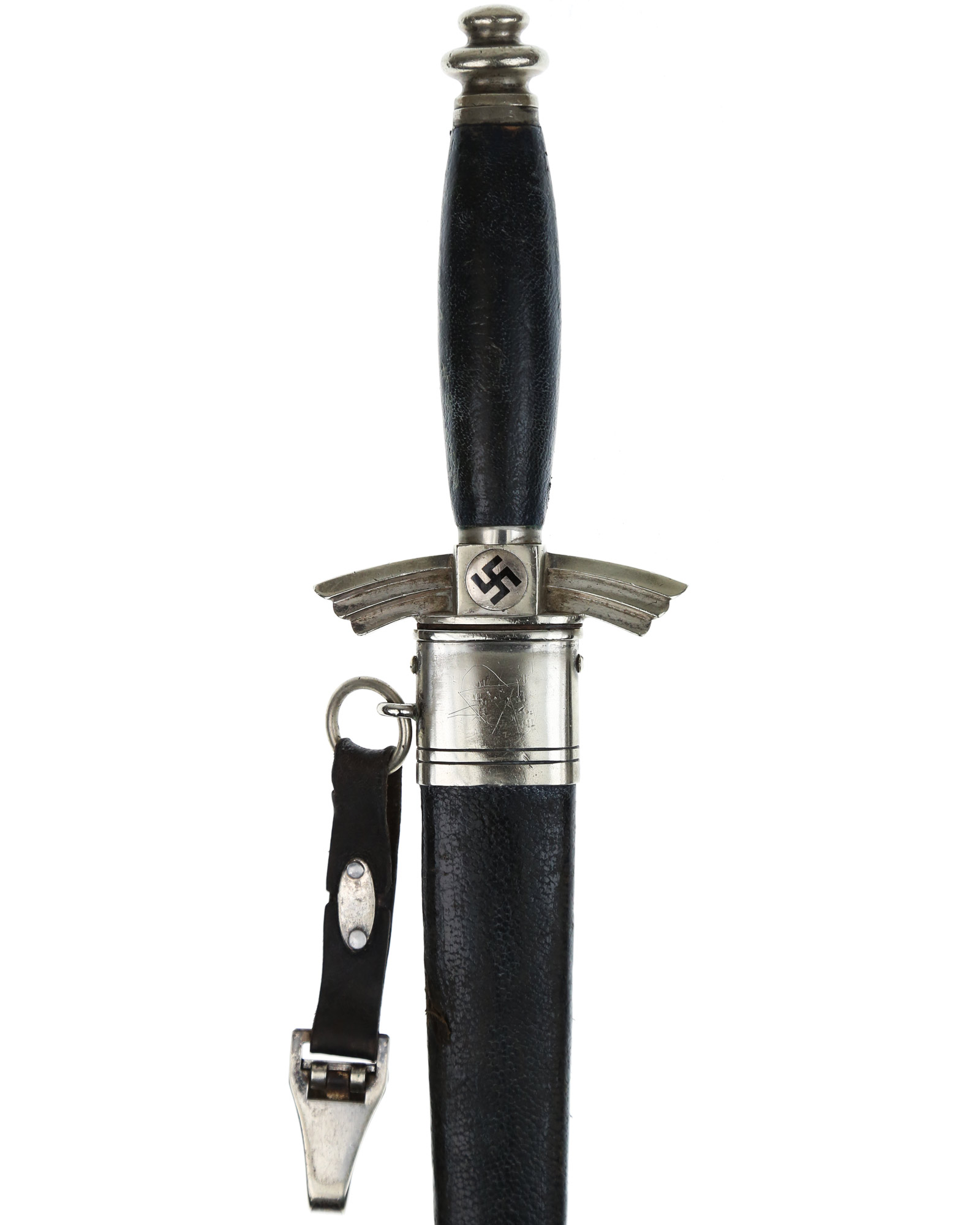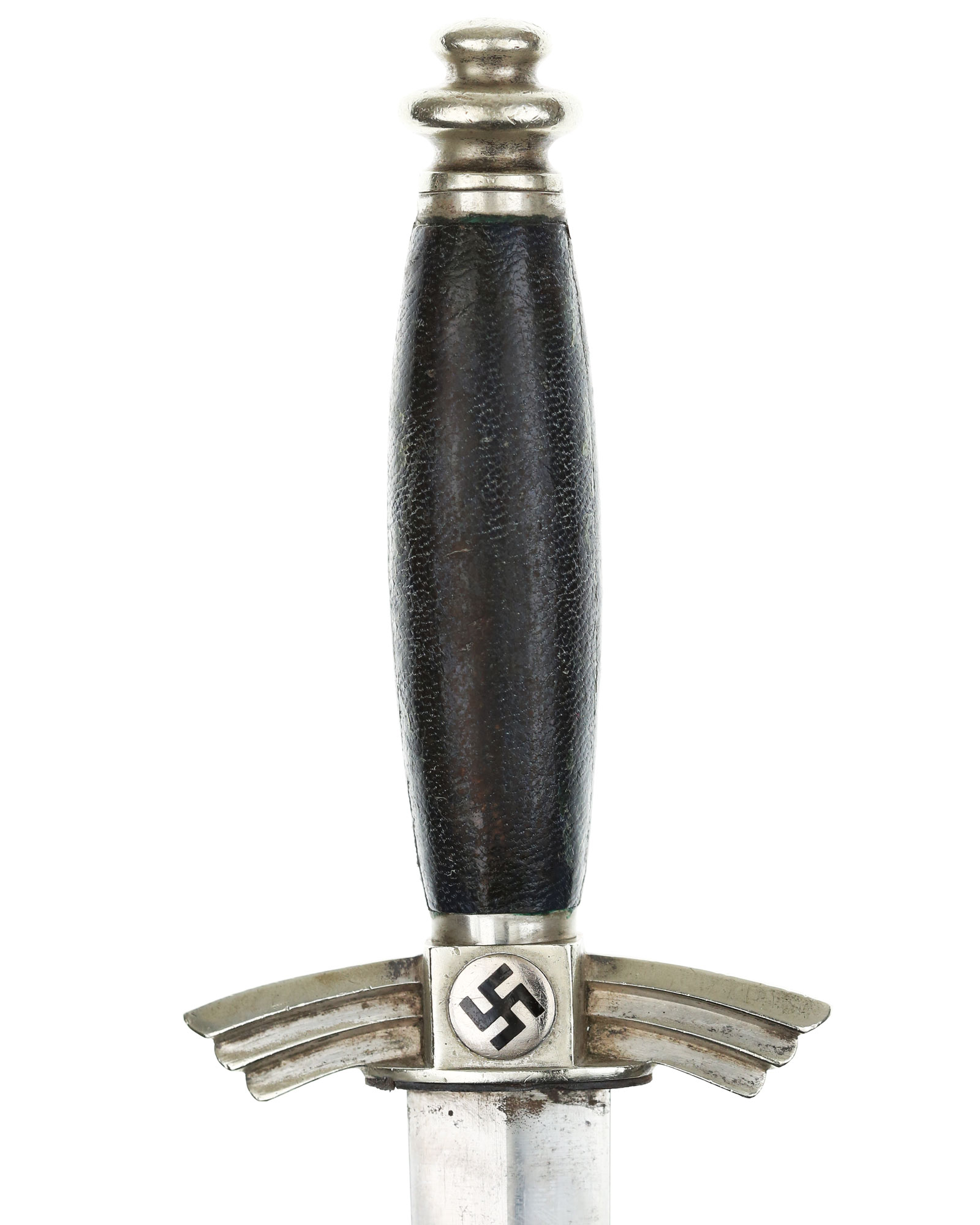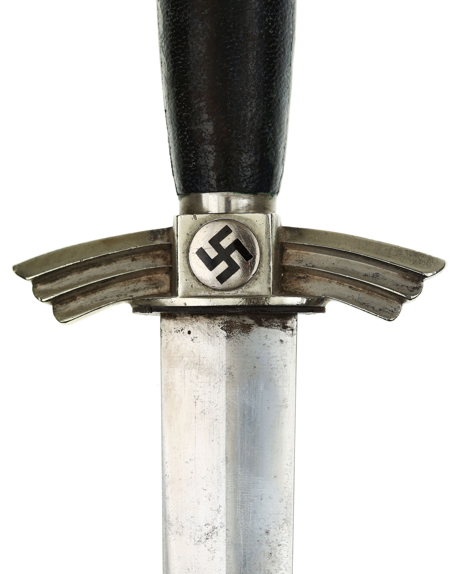 German DLV [Deutscher Luftsportverband] Glider Pilot´s Dagger. Model 1934 - 1st version. This DLV Glider Pilot's Dagger is a real beauty, being in EXC+ condition. The dagger has the early, solid nickel mounts which have good silvered surfaces. The Dagger has the maker mark on the blade: SMF Solingen.