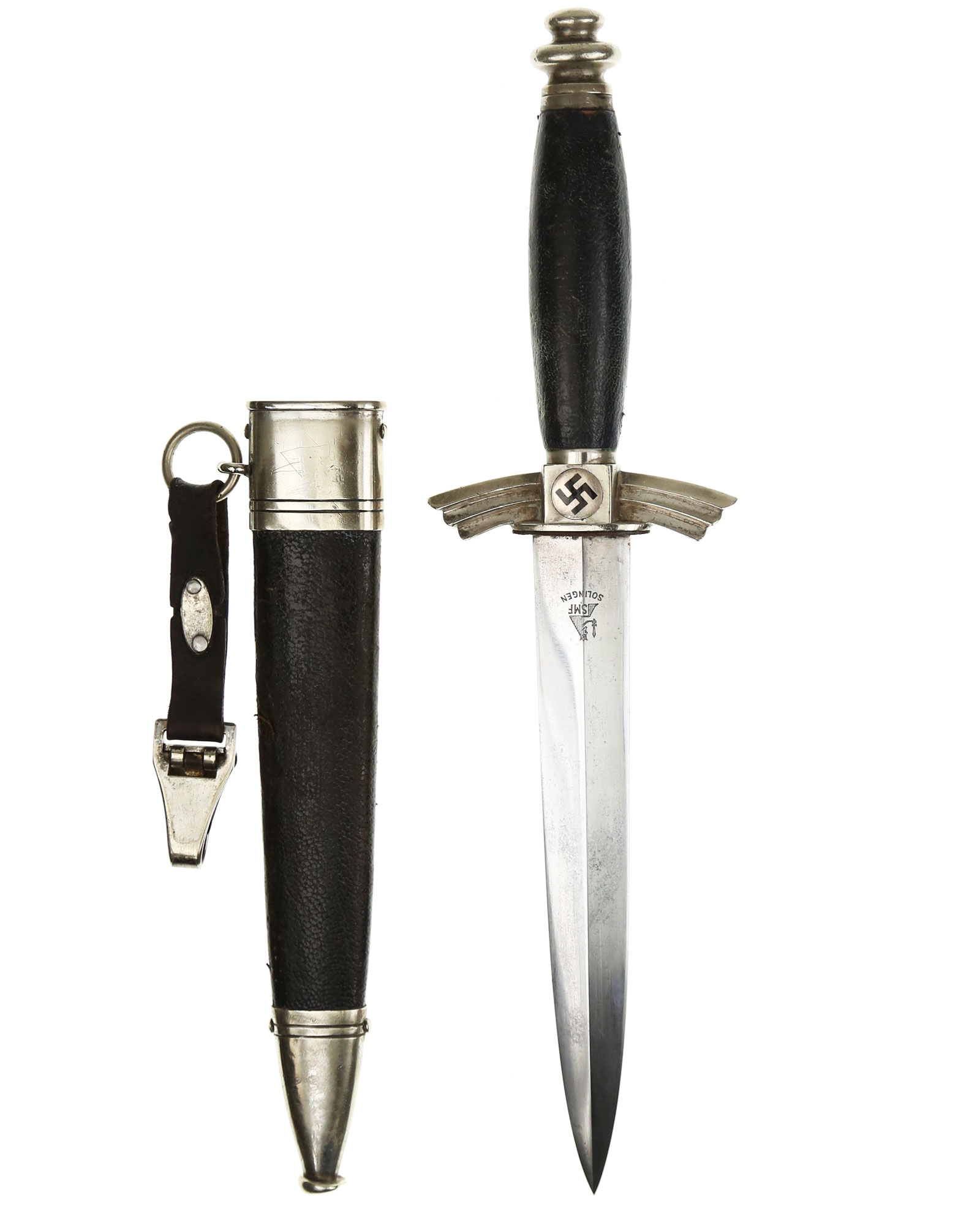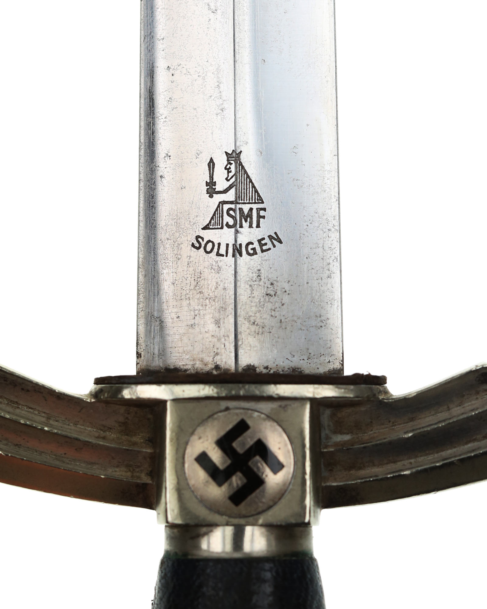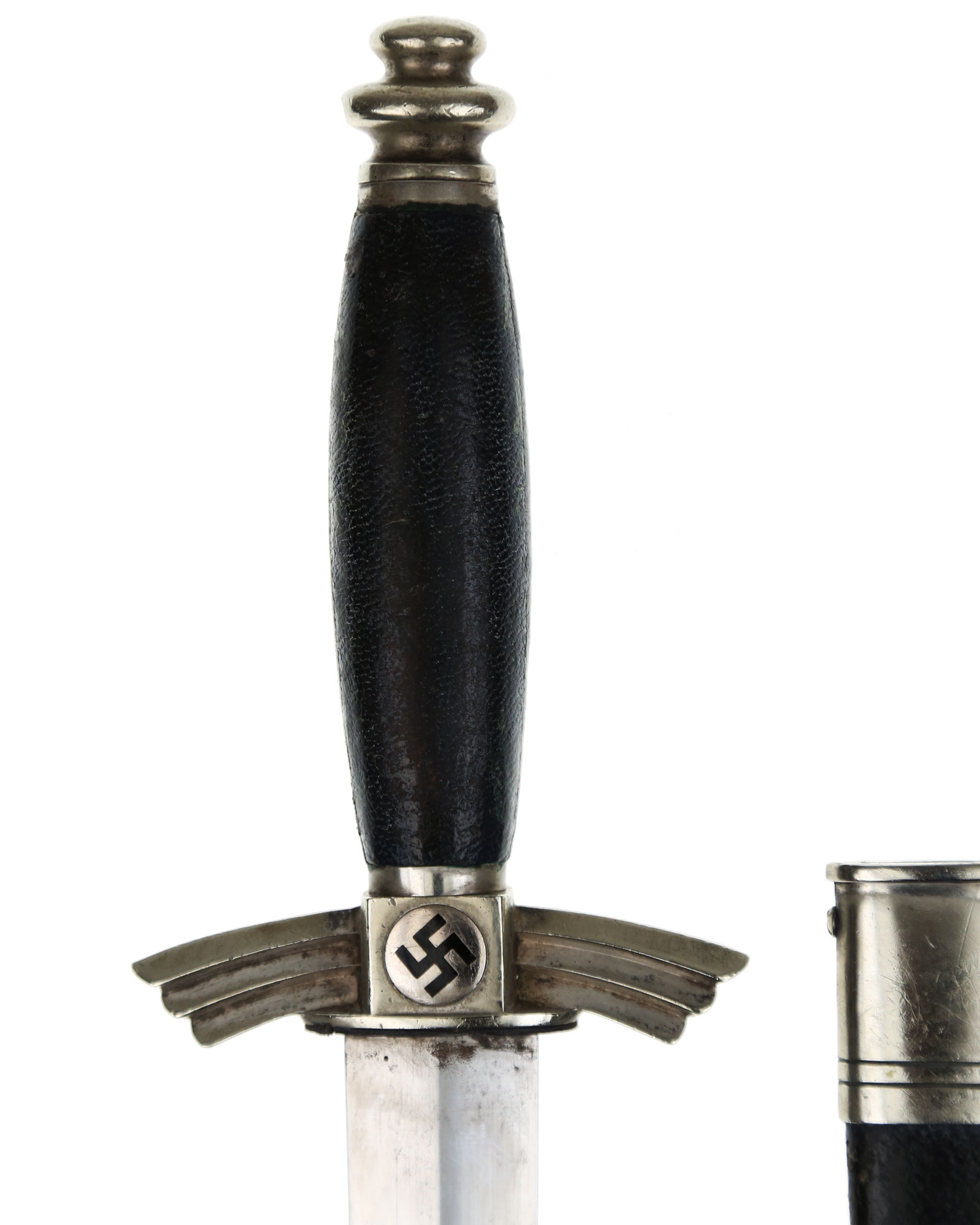 German DLV [Deutscher Luftsportverband] Glider Pilot´s Dagger. Model 1934 - 1st version. This DLV Glider Pilot's Dagger is a real beauty, being in EXC+ condition. The dagger has the early, solid nickel mounts which have good silvered surfaces. The Dagger has the maker mark on the blade: SMF Solingen.