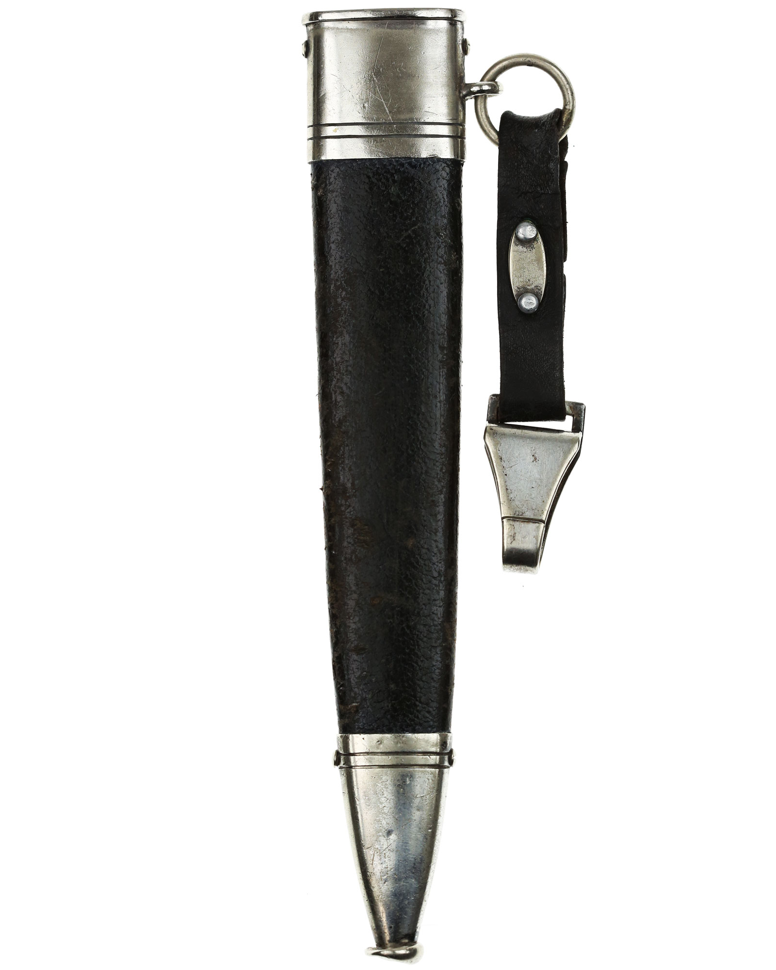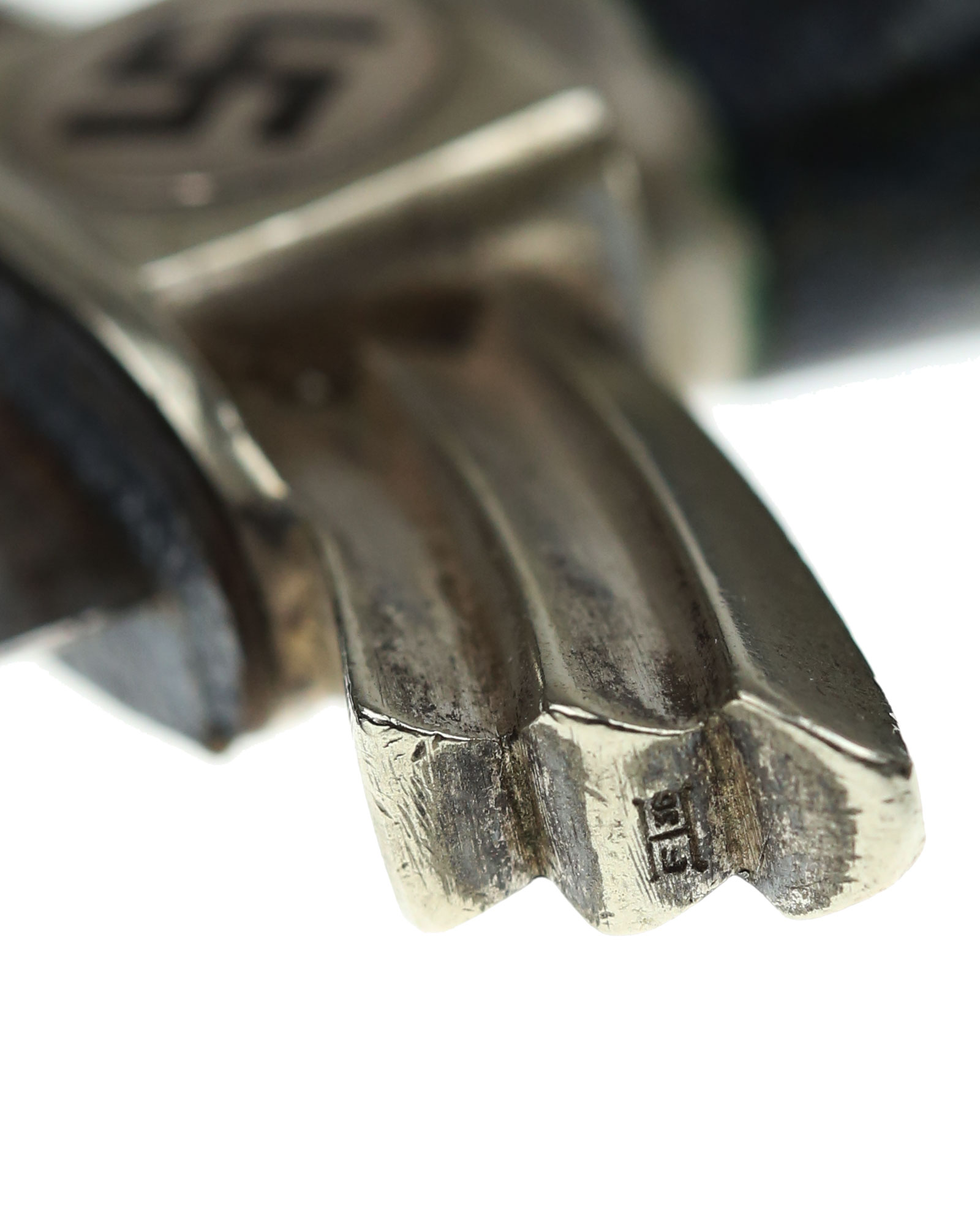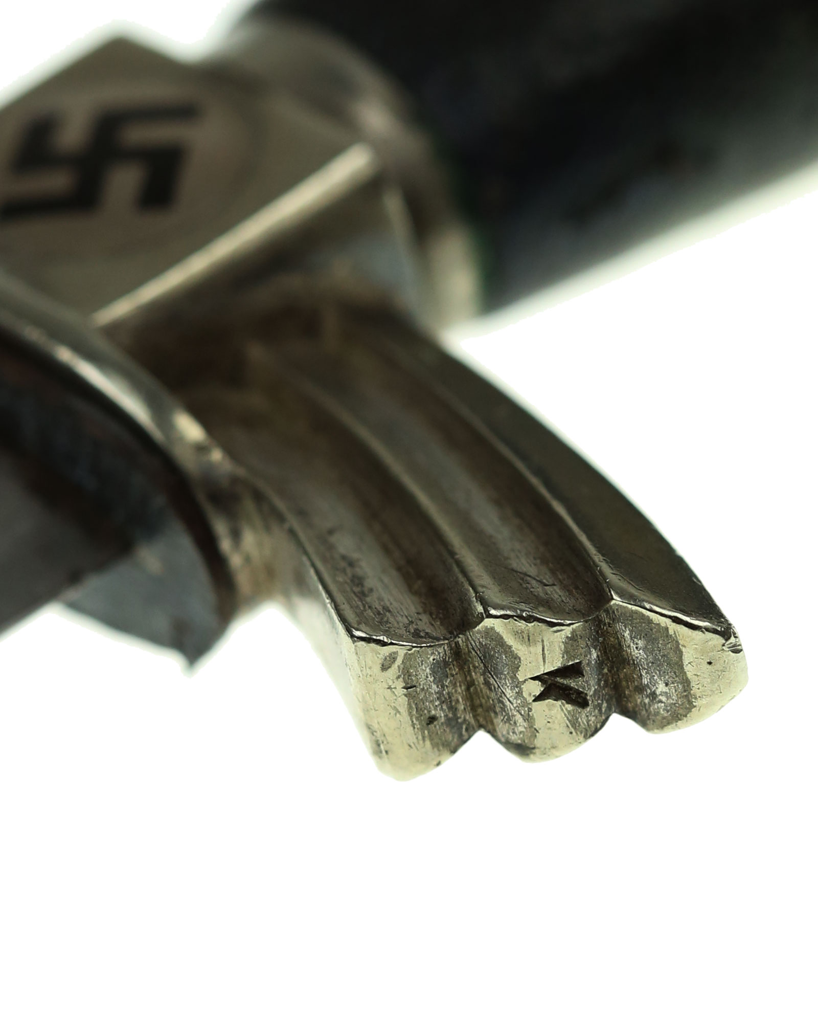 Grip: The Dagger has fine heavy nickel mounts throughout. The crossguard has a square center mount with an inserted medallion on both sides. This medallion is decorated with enameled mobile swastikas, both of which are in perfect condition with no hits. The quillon arms slope downward and are in the characteristic tripartite design, evoking the image of a set of wings. The usual “K” stamping can be seen on one of the crossguard ends, which no doubt is the initial of the producer of these mounts. One the opposite crossguard end is a "H".