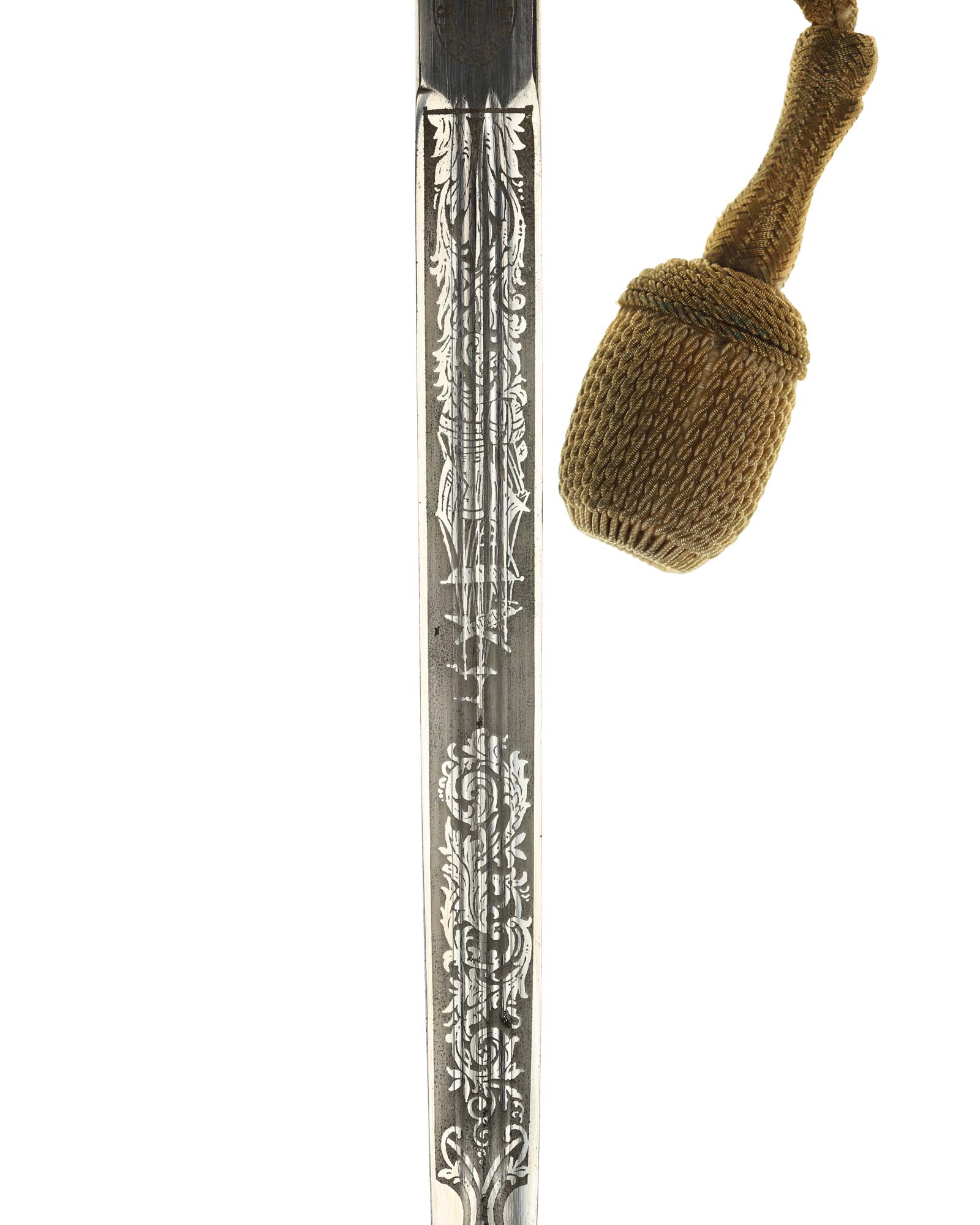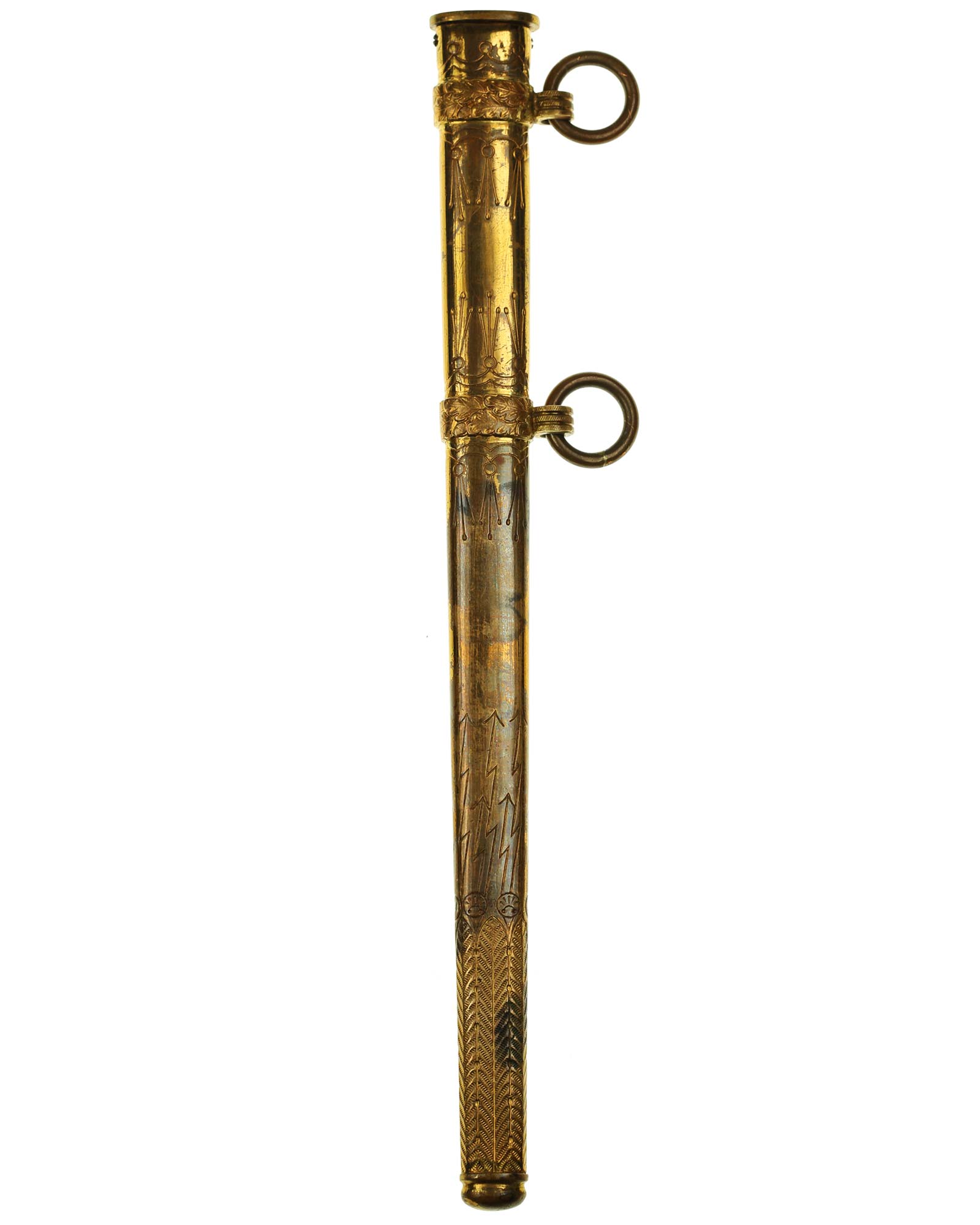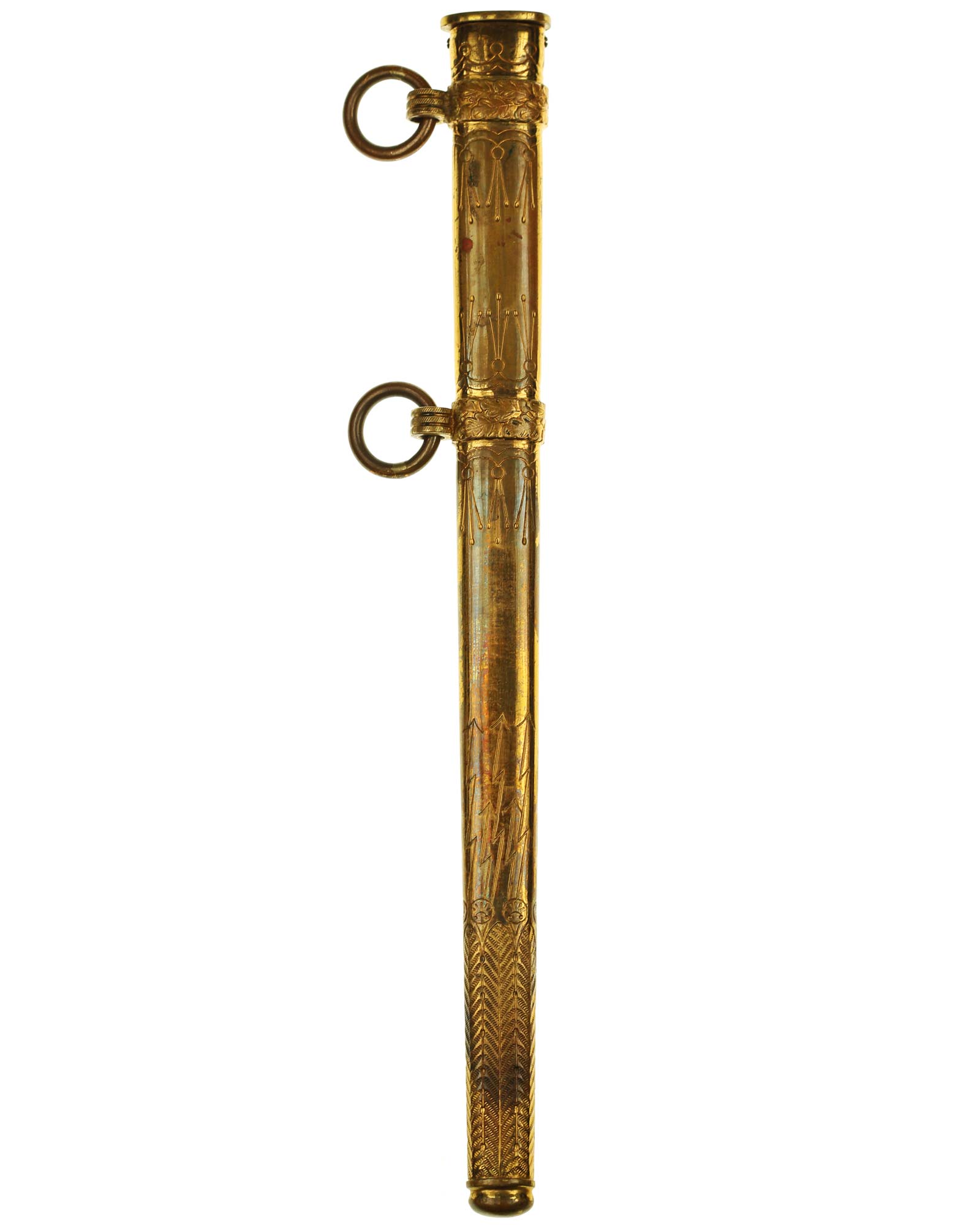 Scabbard: The scabbard is the lightning bolt type. This scabbard has good detail to the palmettes around the bands, and to the lower lightning bolts, ermine feet, and acanthus leaves. The carrying bands show a little minor wear to the surfaces but the detail to the overlapping oak leaves and acorns is still there. The eyelets have triple serrations, also showing some minor wear. The throat is retained by two headless brass side-screws.