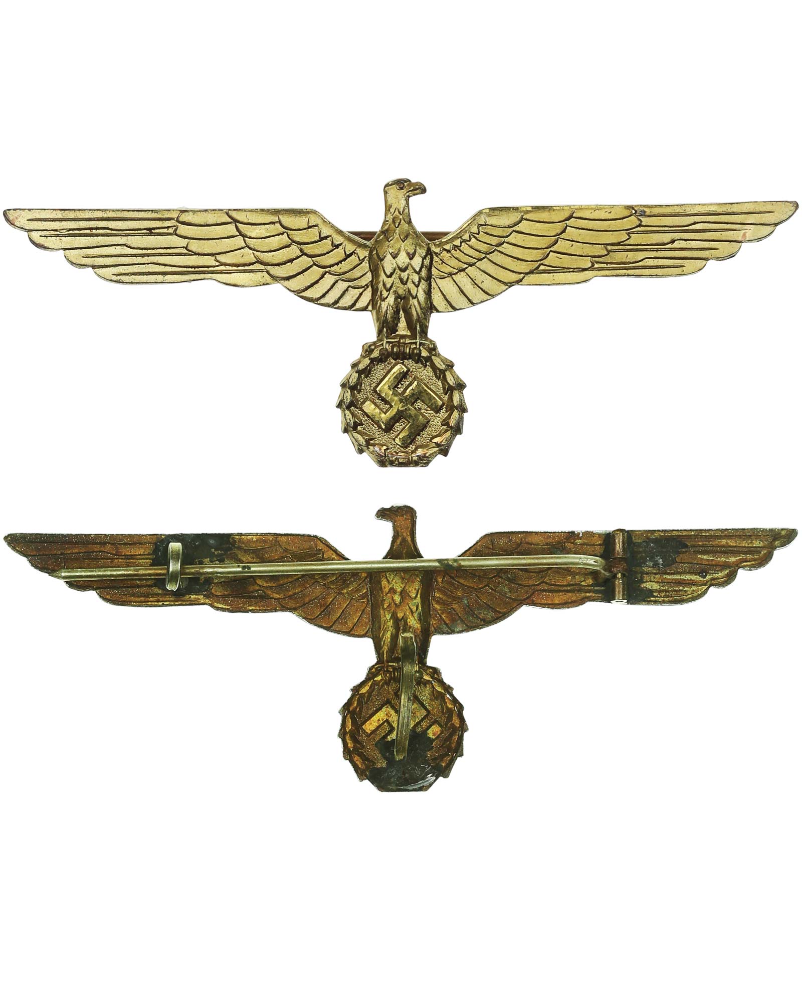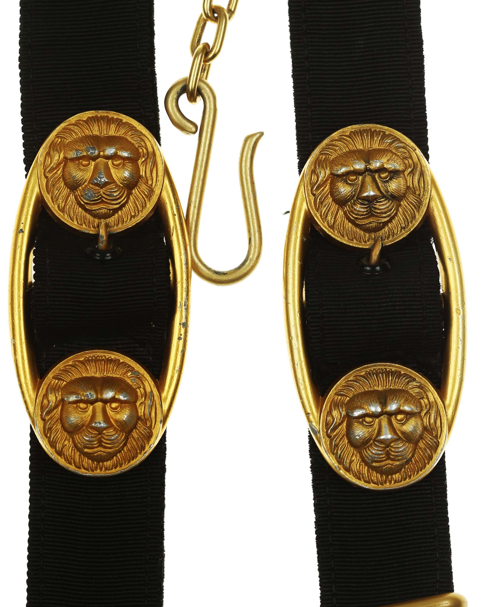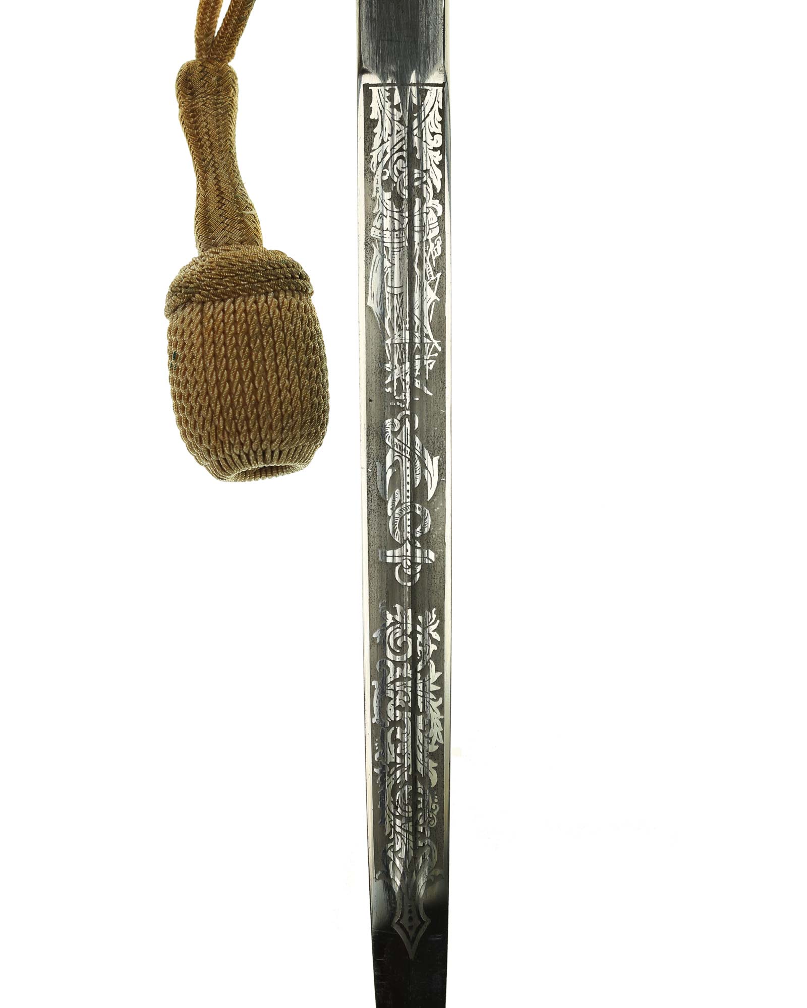 Scabbard: The scabbard is the lightning bolt type. This scabbard has good detail to the palmettes around the bands, and to the lower lightning bolts, ermine feet, and acanthus leaves. The carrying bands show a little minor wear to the surfaces but the detail to the overlapping oak leaves and acorns is still there. The eyelets have triple serrations, also showing some minor wear. The throat is retained by two headless brass side-screws.