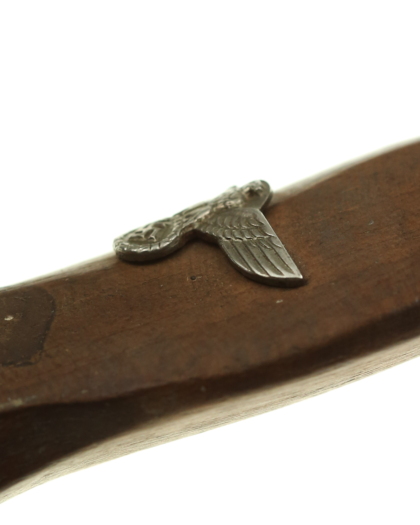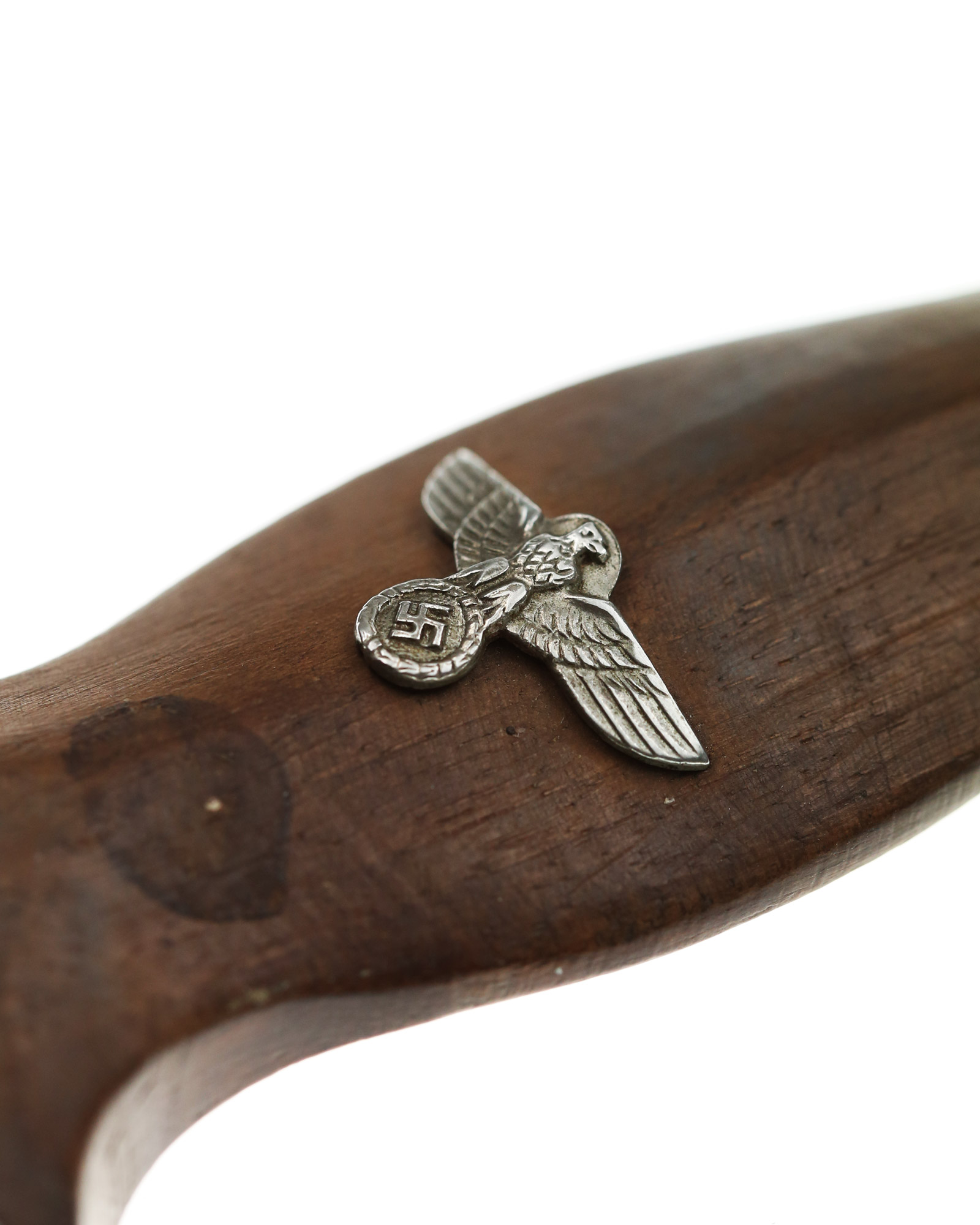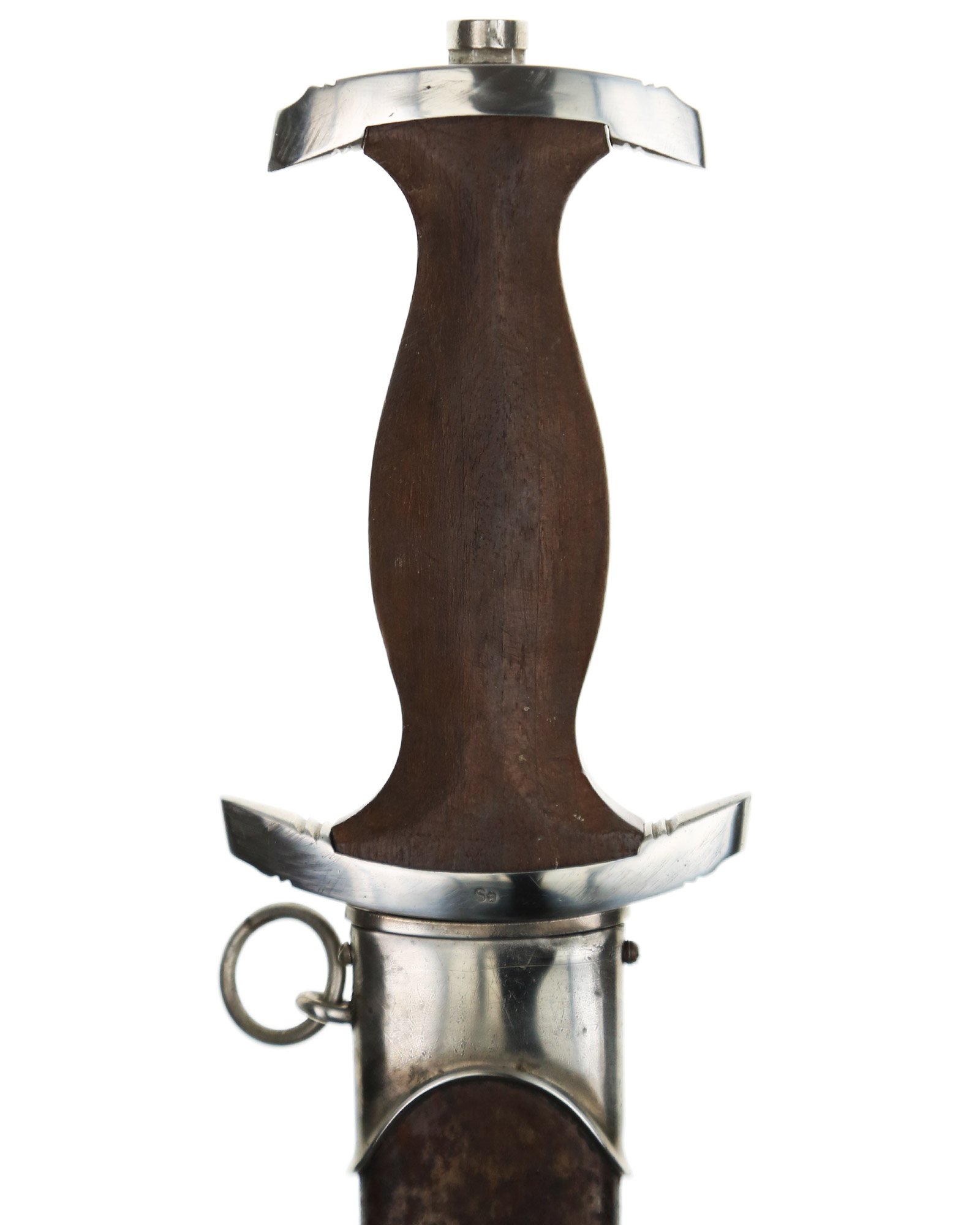 Grip: This Suhl-produced dagger is in nice condition. The nickel crossguards are in good condition as is the nickel tang nut. The lower reverse crossguard is Gruppe marked "Sa". The grip has medium to high ridge construction with nice, pleasing, grain running vertically throughout. The grip fits the crossguards like a rubber glove. The SA runes button is perfectly placed. The enamel appears to have a small rub, just next to the "a Sigrunne".