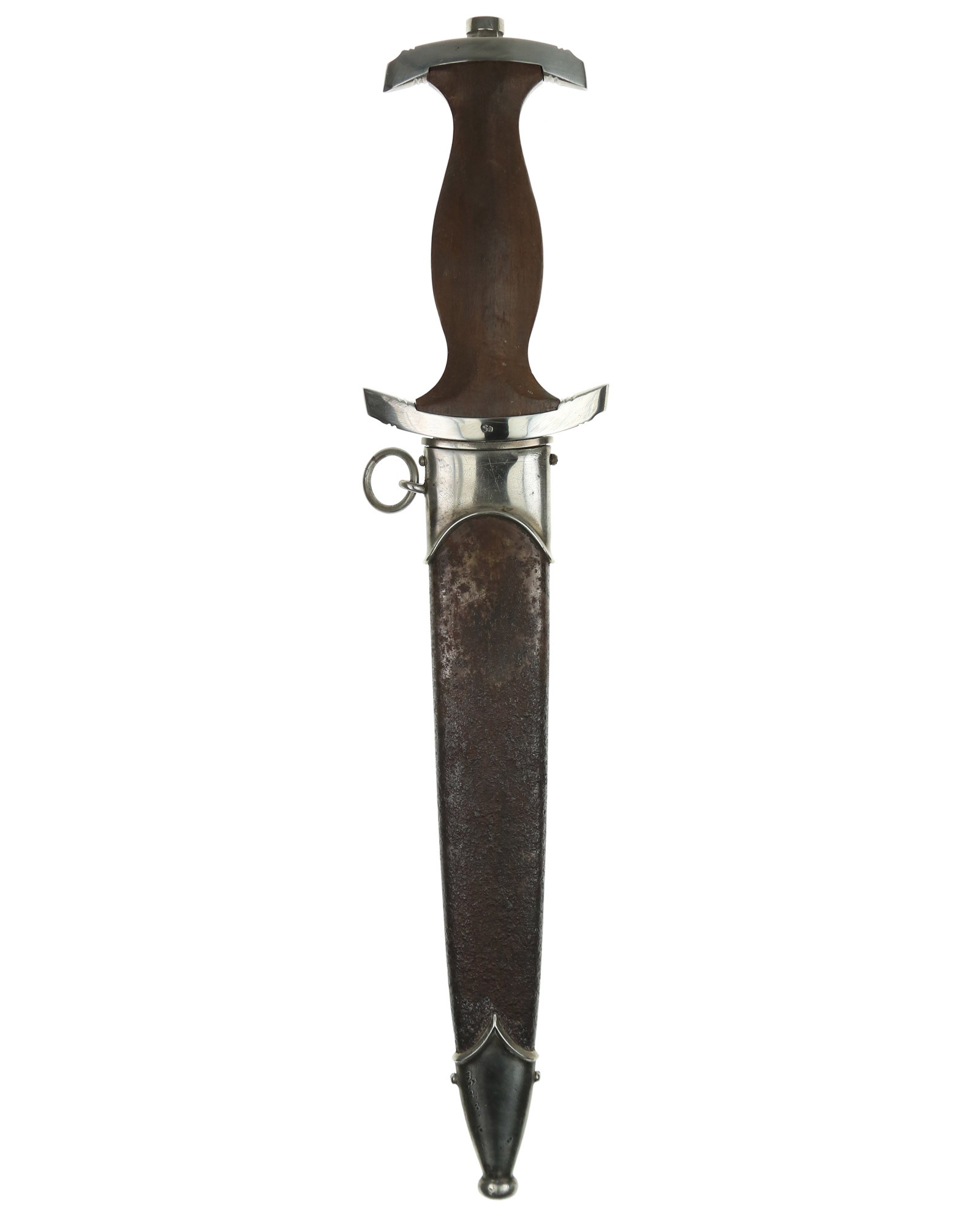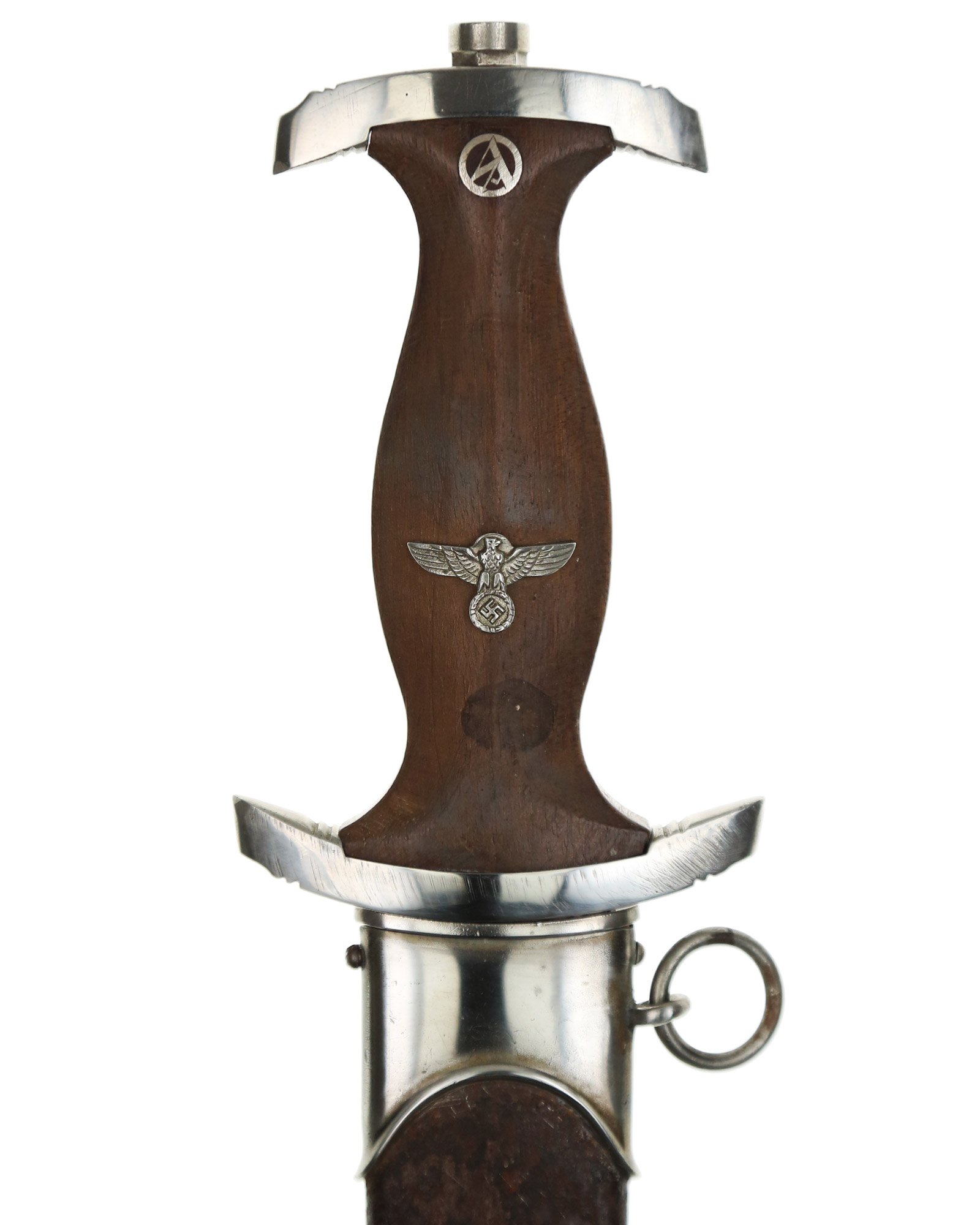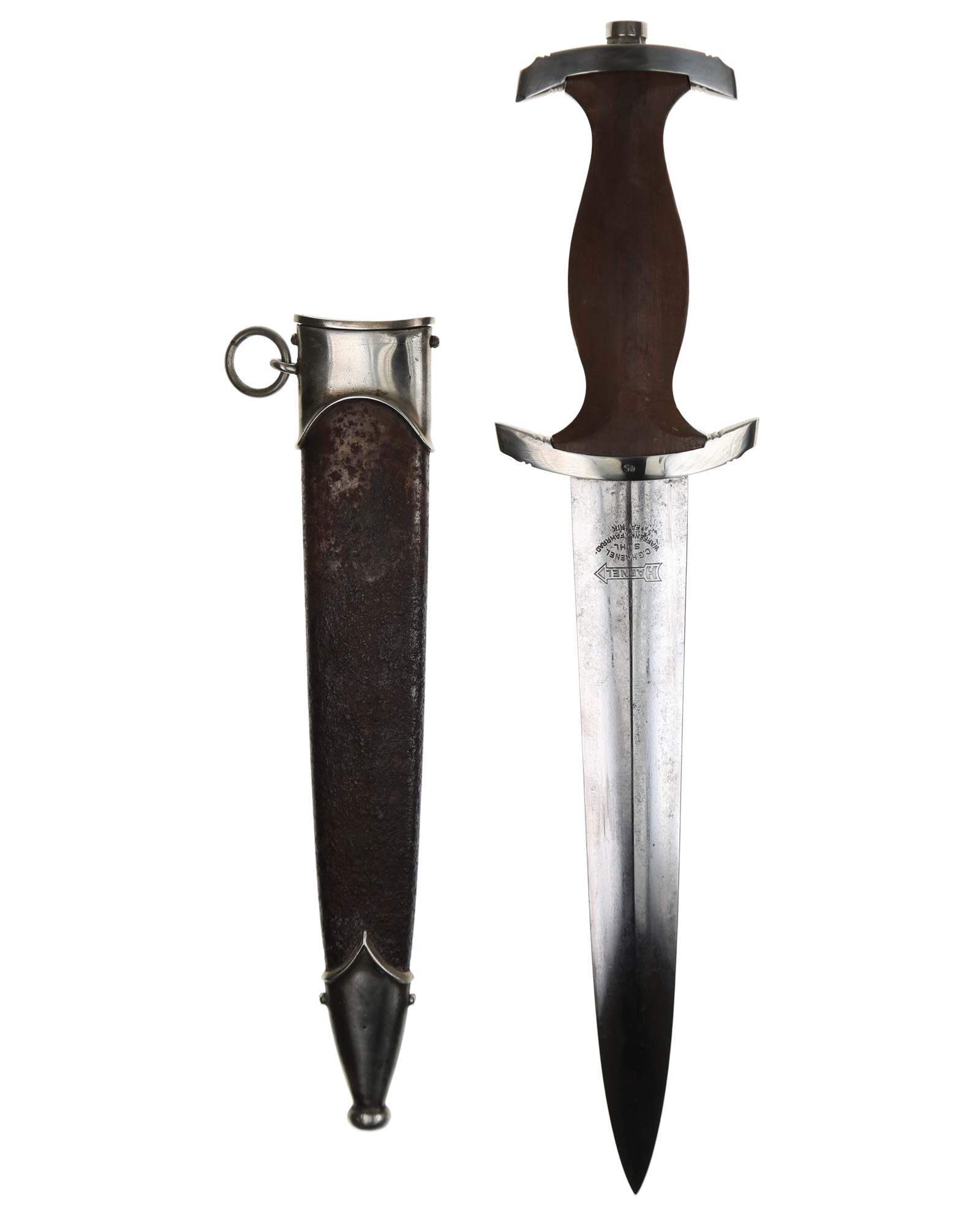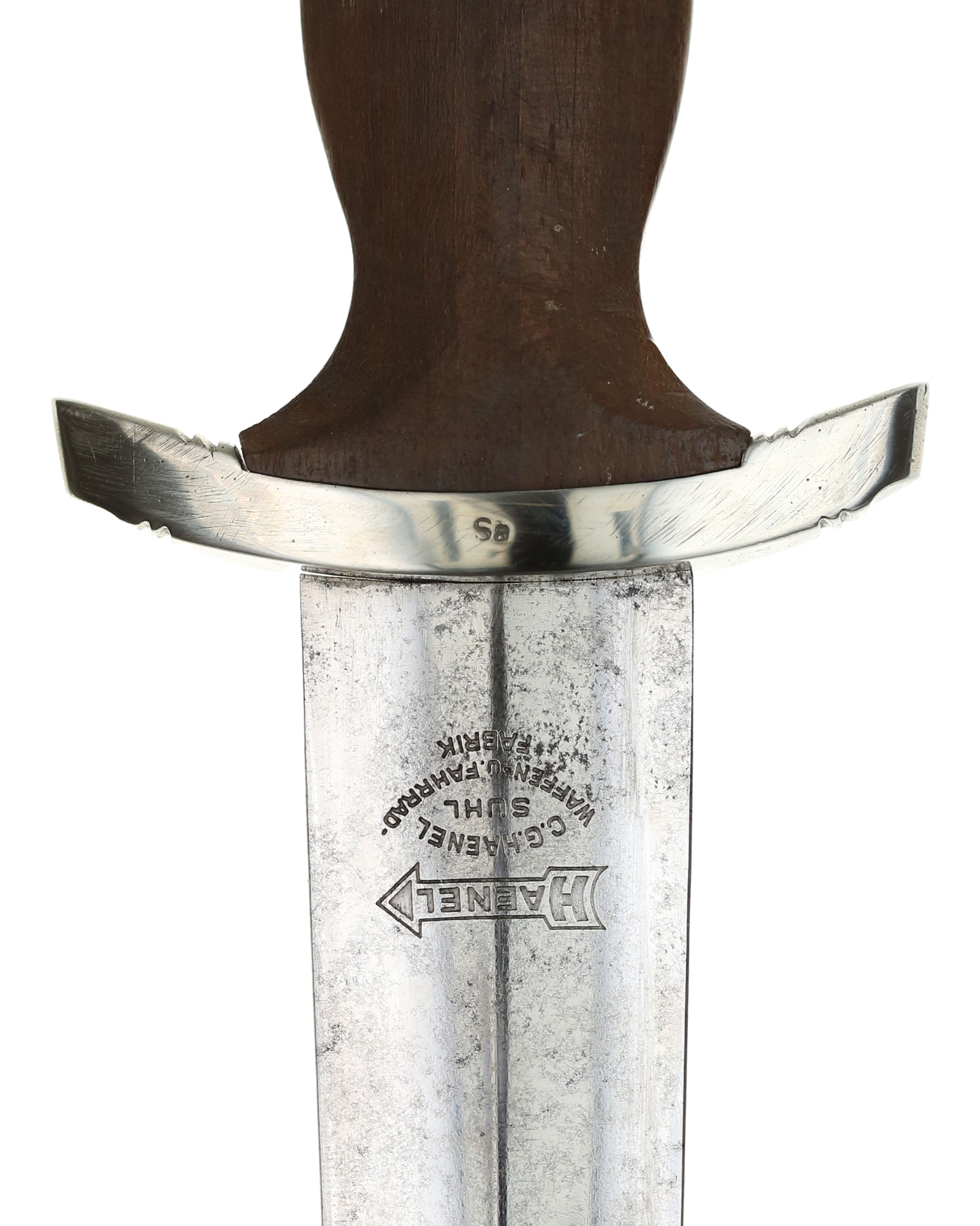This SA [Sturmabteilung] Haenel Dagger is in EXC+ condition. Model 1933. The total length is 37.3 cm. Early Nickel fittings, lower guard with "Sa" (Sachsen) stamp. The Dagger has the maker mark on the blade: C. G. Haenel, Suhl.