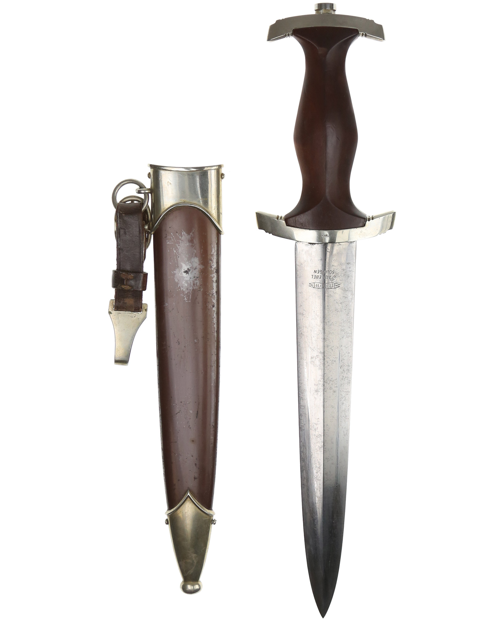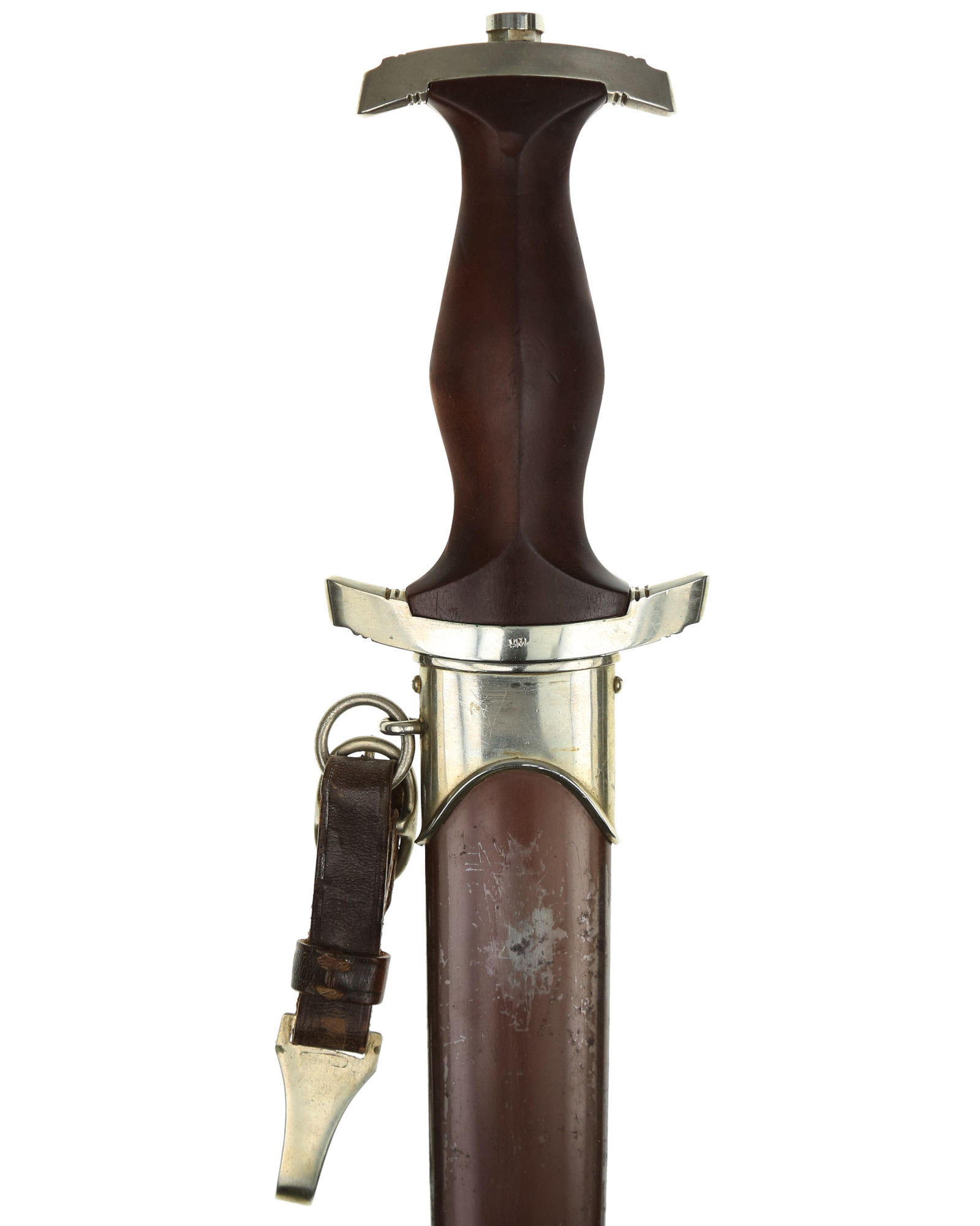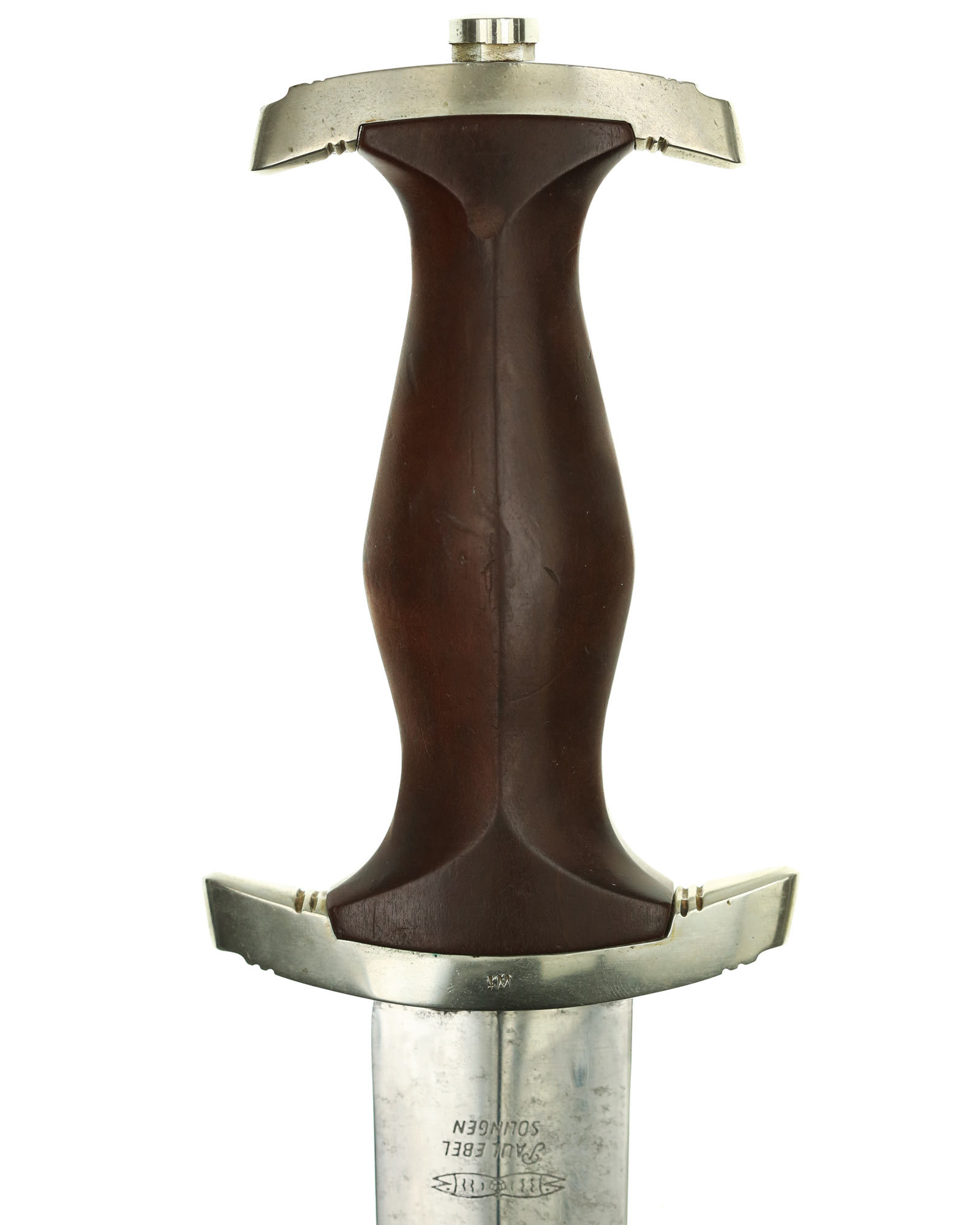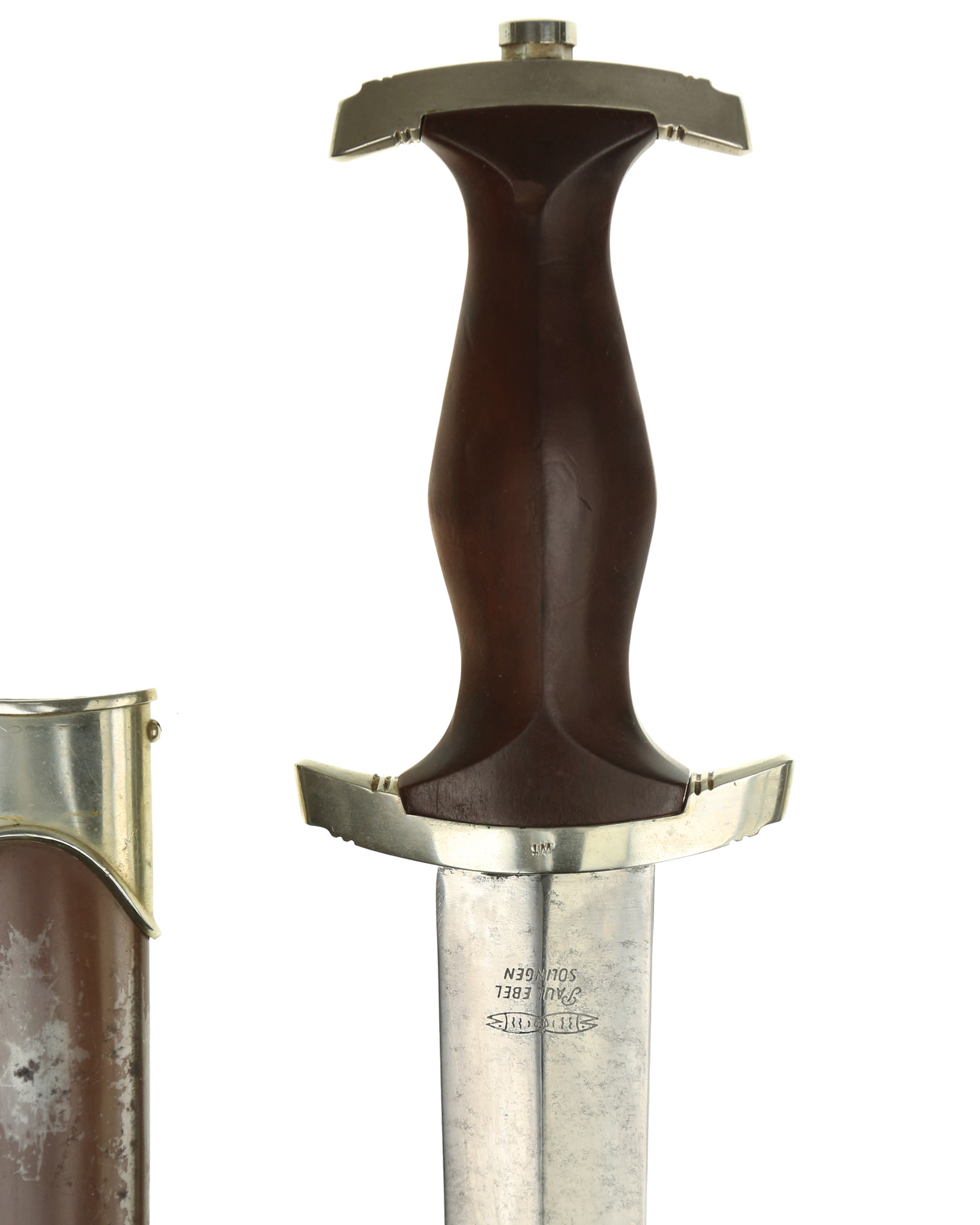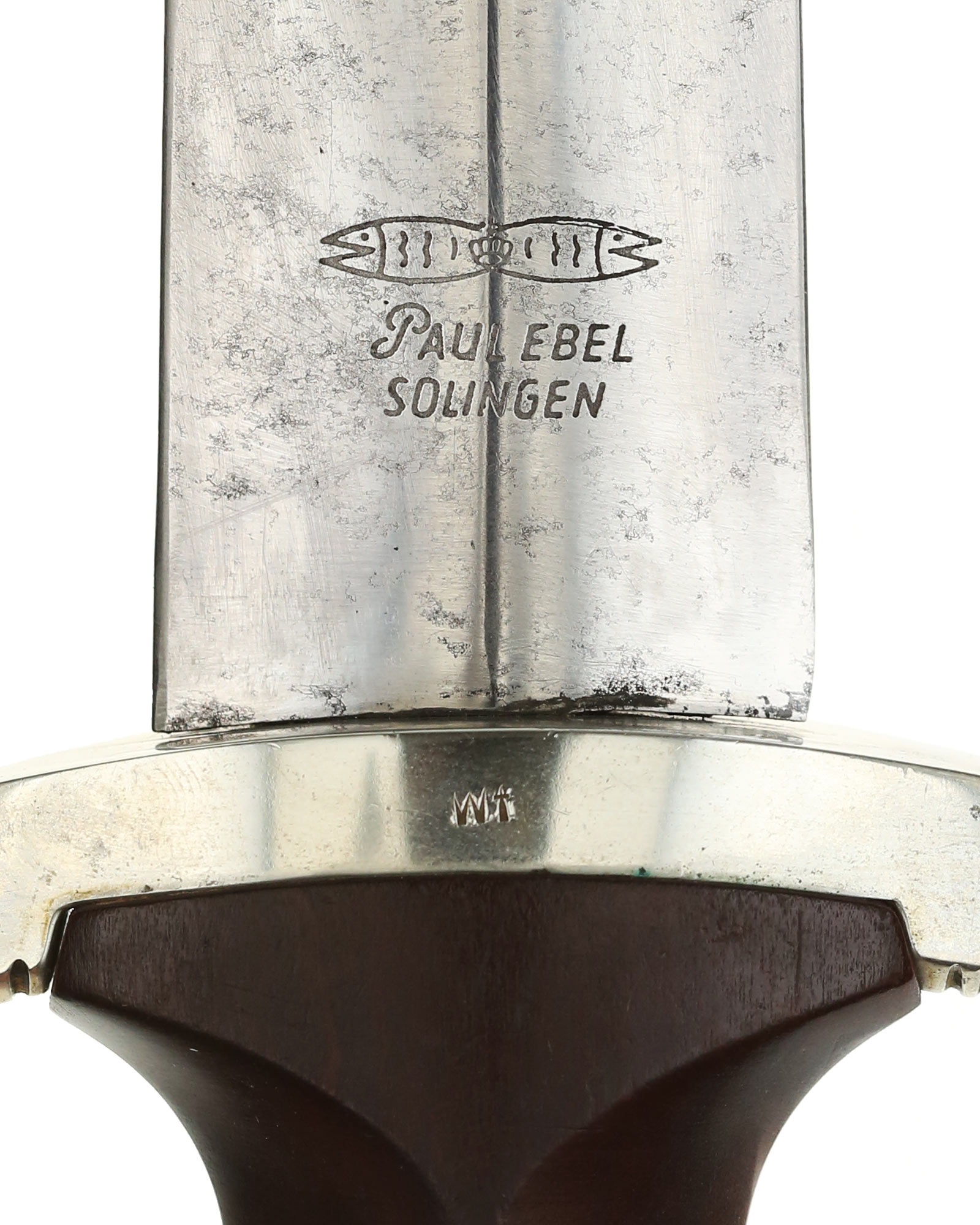 This SA [Sturmabteilung] Ebel Dagger in NEAR MINT condition. Model 1933. The total length is 37.4 cm. Early Nickel fittings, lower guard with "Wf" stamp. The Dagger has very rare maker mark on the blade: Paul Ebel, Solingen.