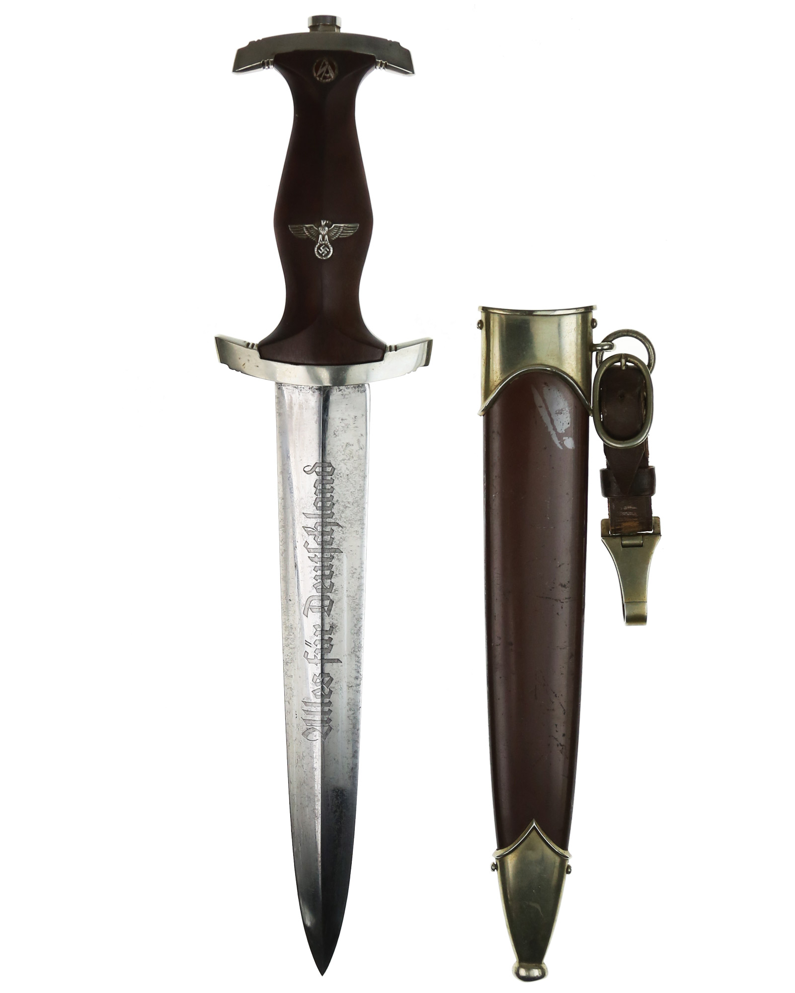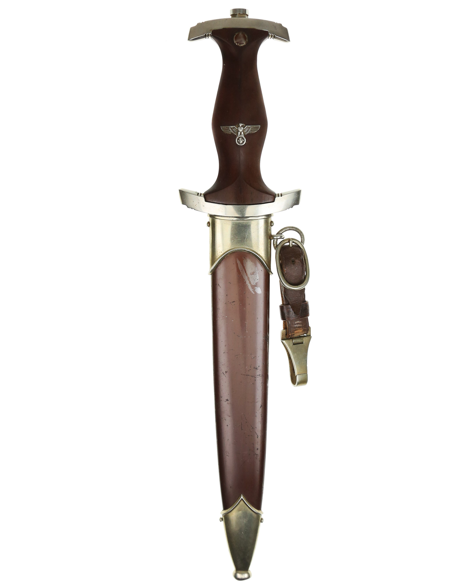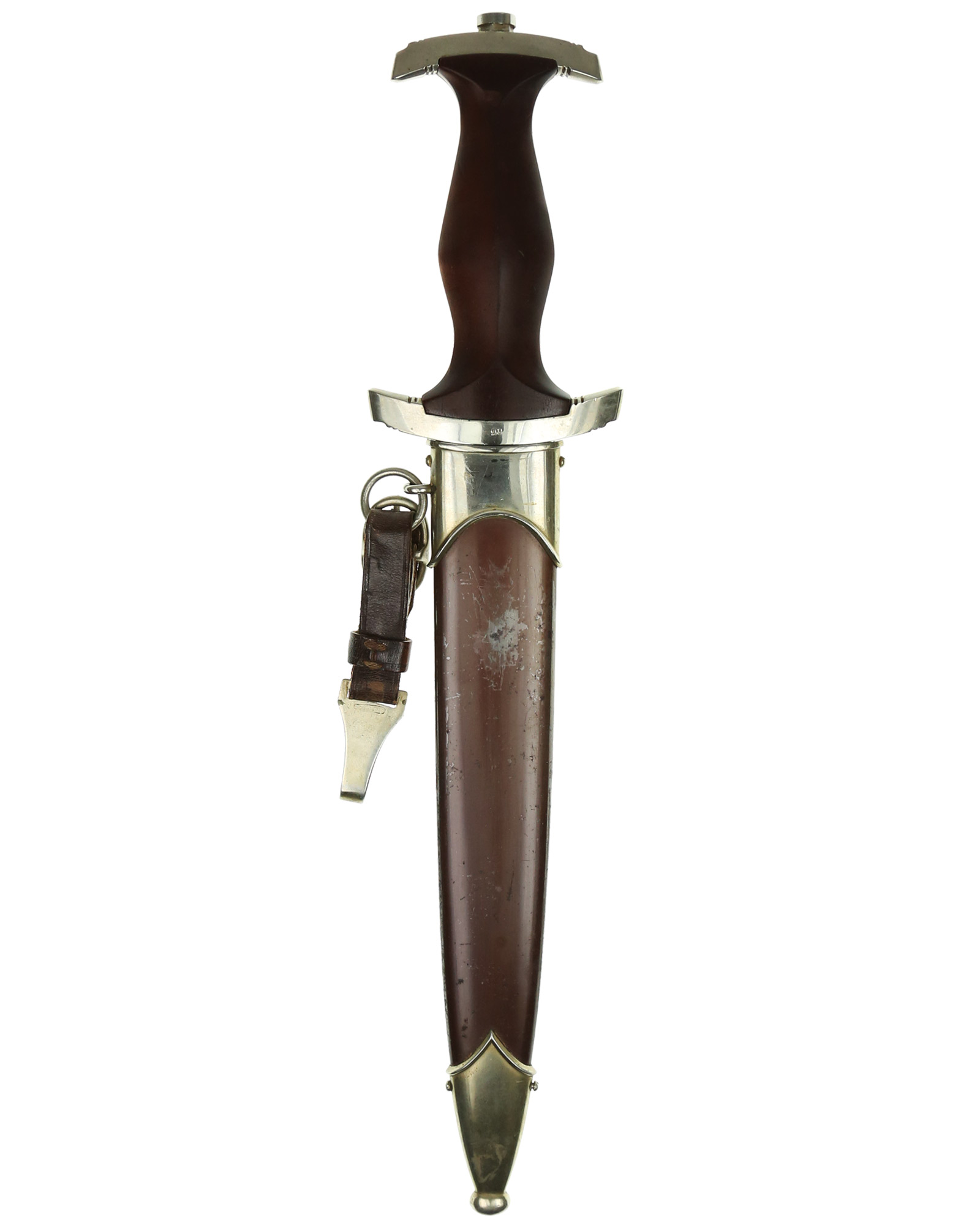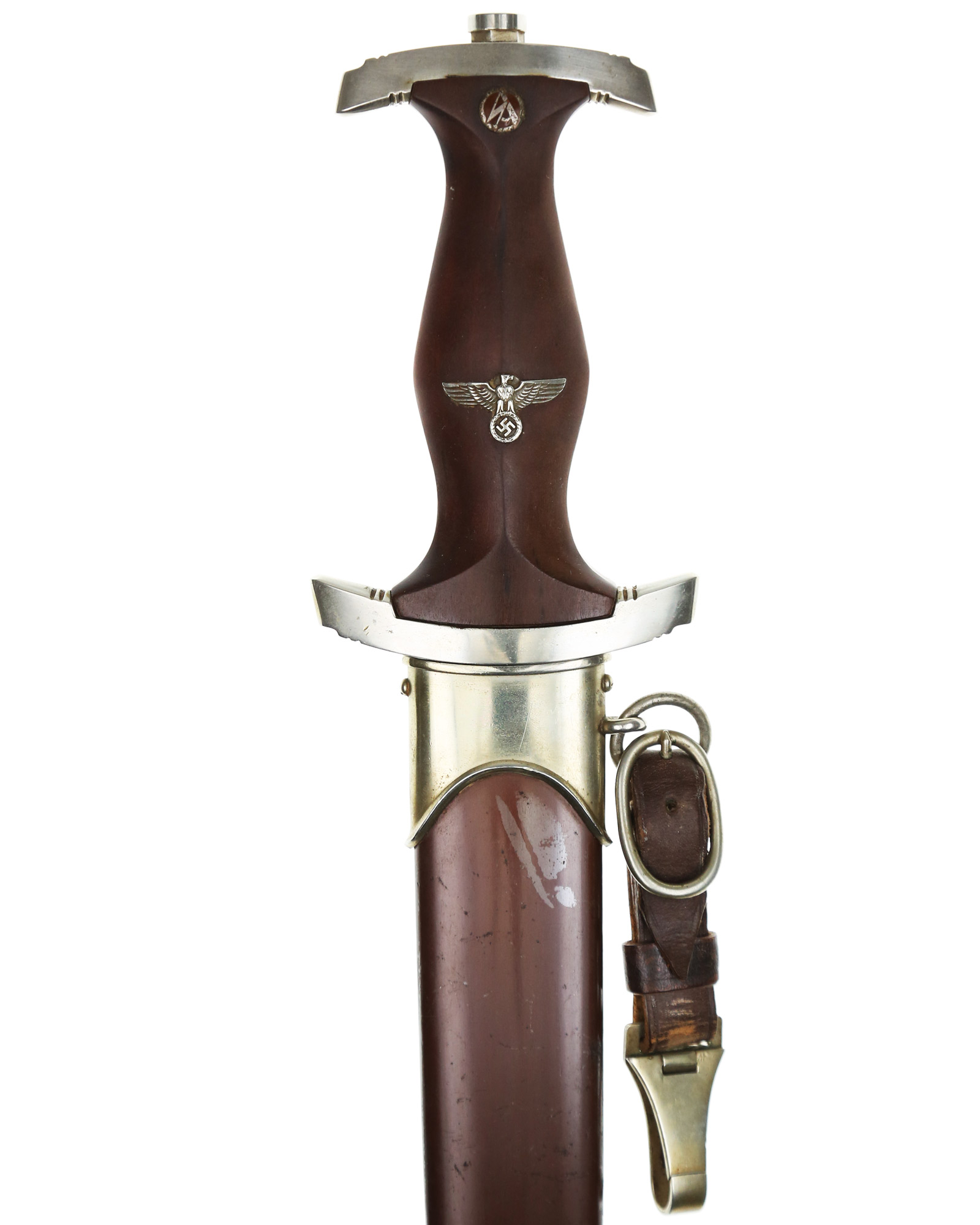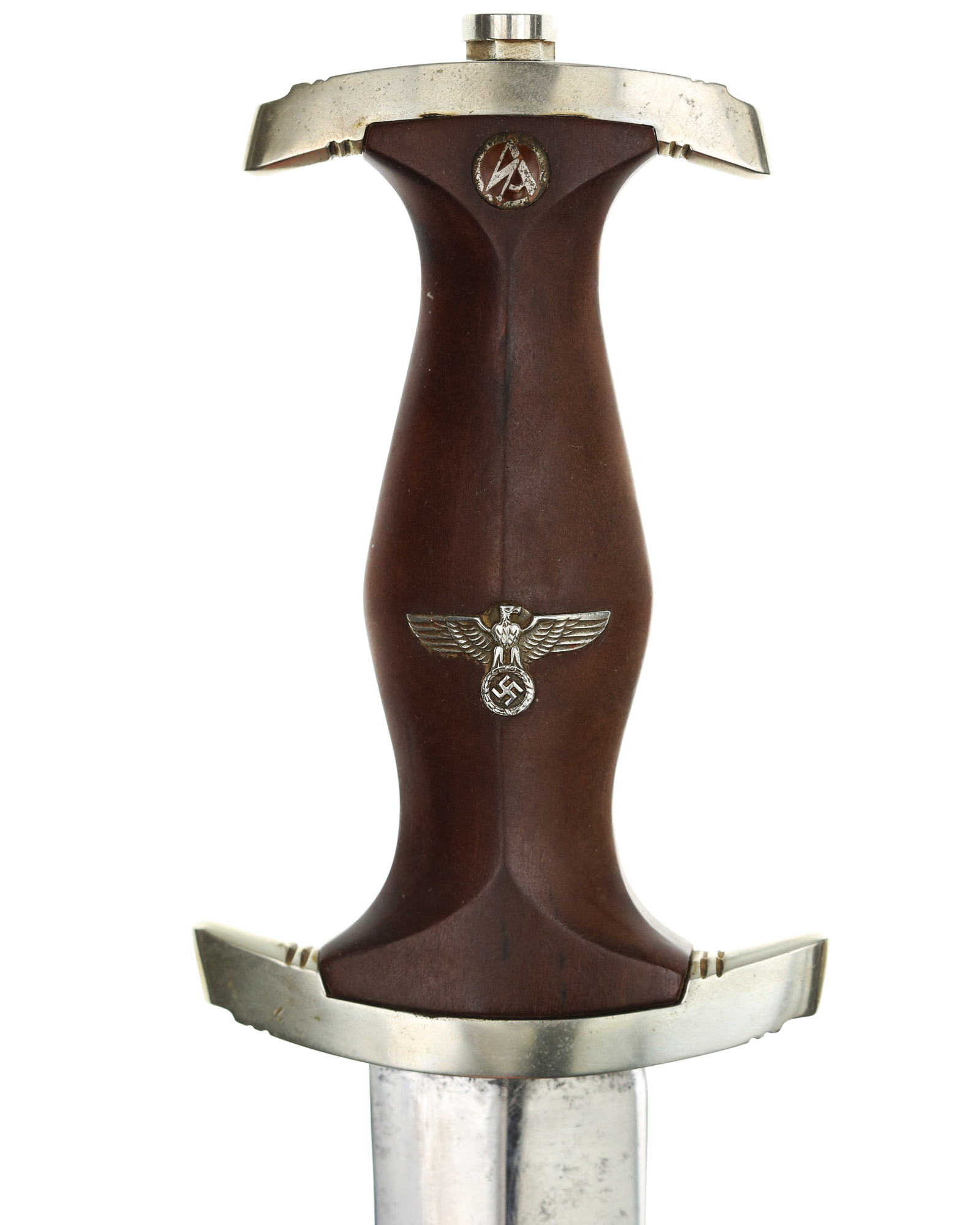 This SA [Sturmabteilung] Ebel Dagger in NEAR MINT condition. Model 1933. The total length is 37.4 cm. Early Nickel fittings, lower guard with "Wf" stamp. The Dagger has very rare maker mark on the blade: Paul Ebel, Solingen.