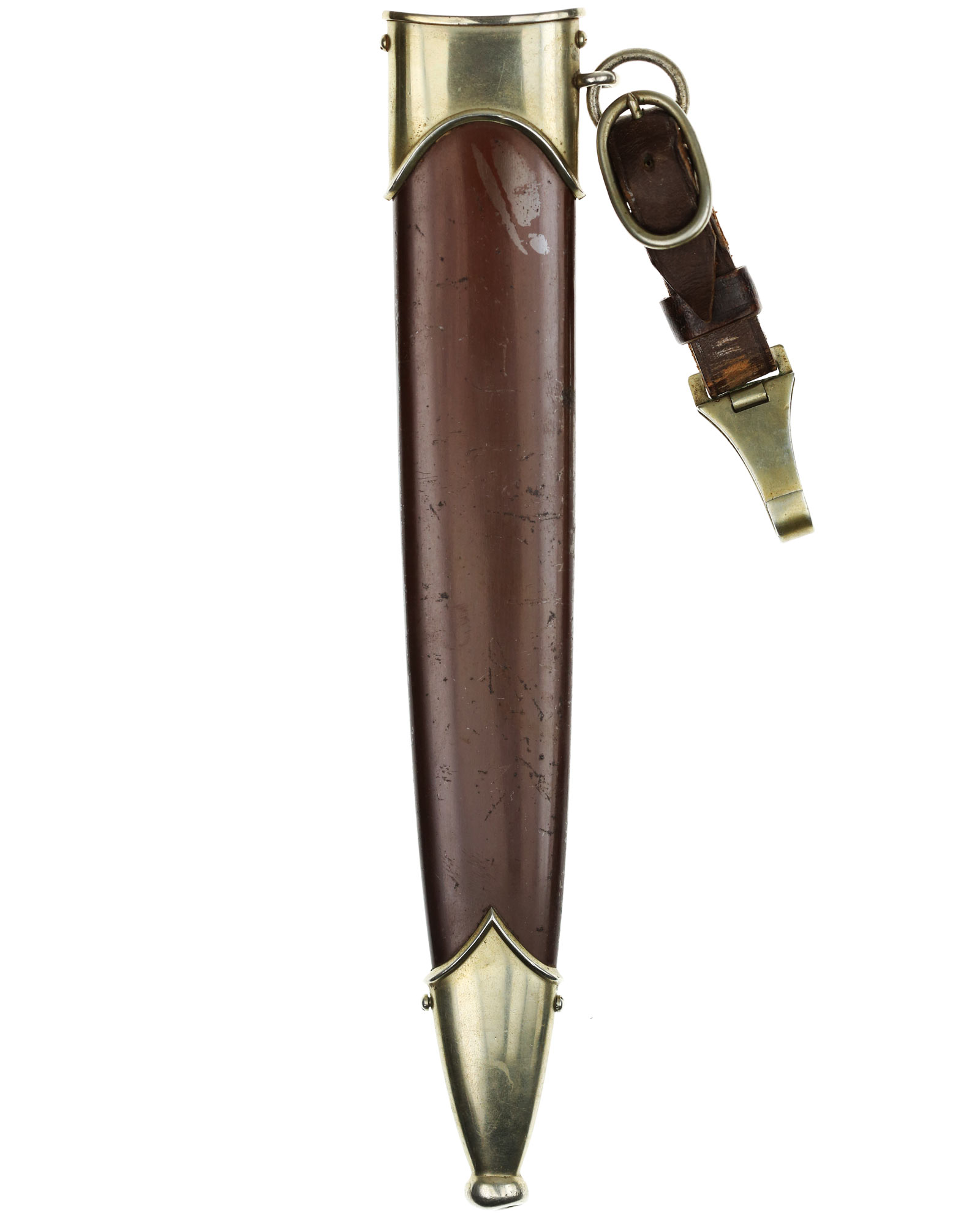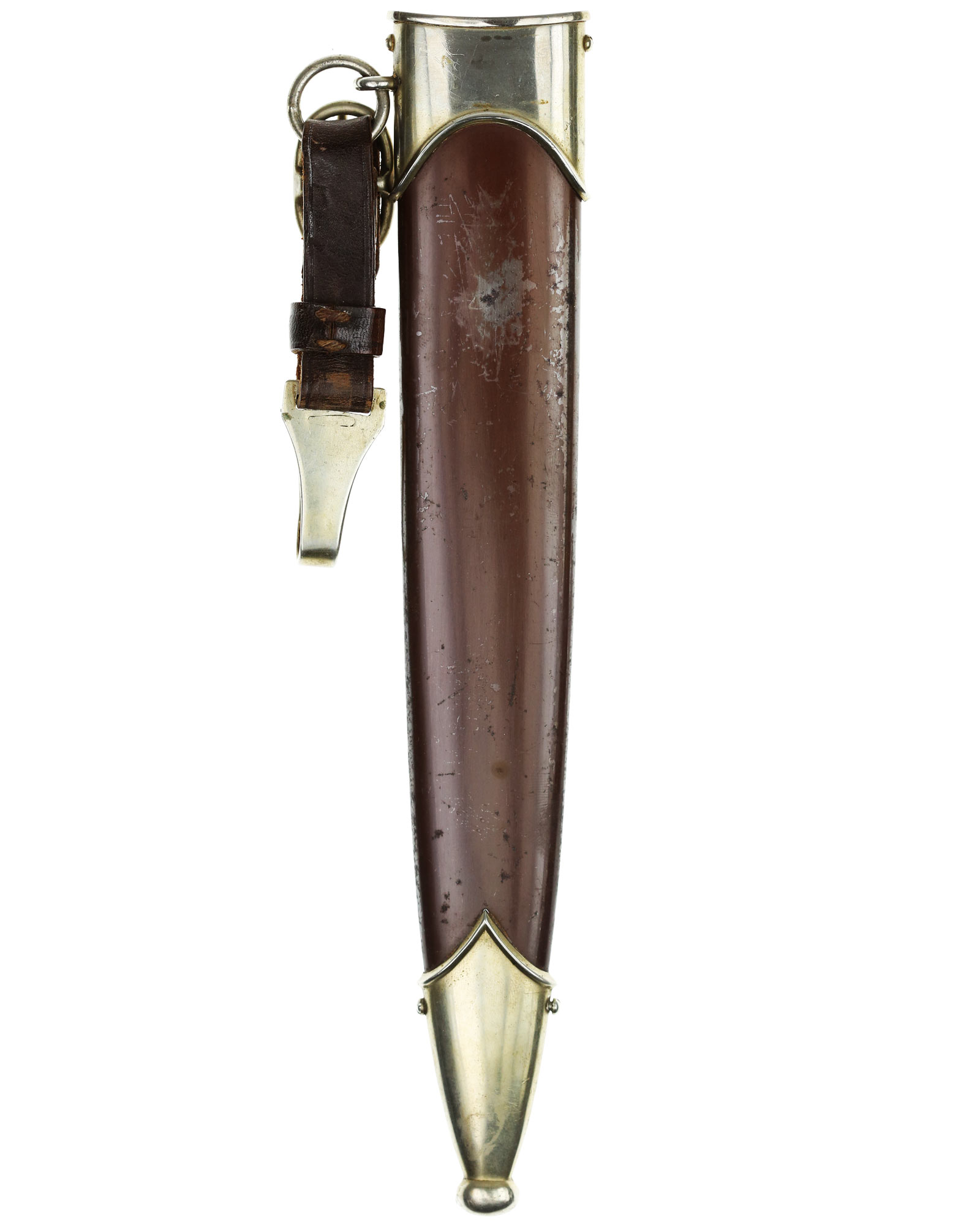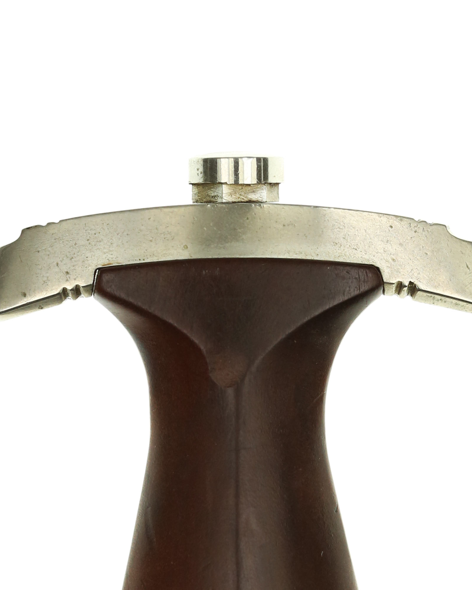 Grip: The crossguards of this fine dagger have a dull nickel patina. The crossguards have good smooth surfaces, crisp edge and precise accent grooves. The gruppe mark is “Wf”. The grip is a very dark red mahogany wood. It is of medium to sharp ridge construction. It has an excellent look about it and if you focus deeply in the recesses there is some nice grain in the wood. The grip is a slightly odd shape as it is more narrow at the bulbous point than usual. This grip is in near mint condition. It just shows normal usage. The SA runes button is still good showing age in the surfaces but no hits to the enamel. The nickel grip eagle is a fine example having a high-necked variety bird and details are still there to the head, breast feathering, wing feathering, legs, wreath and mobile swastika.