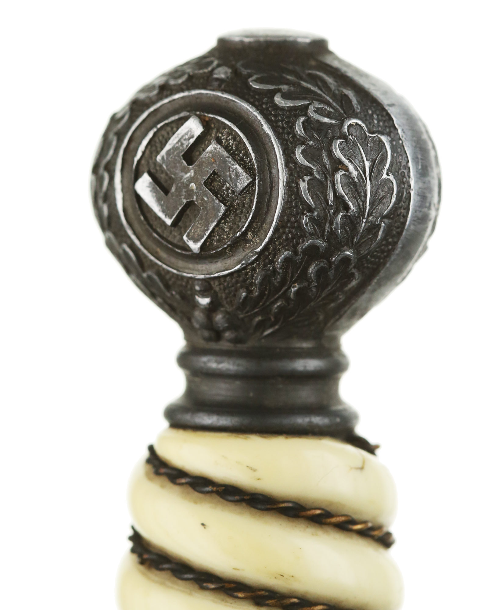 Grip: The grip of this dagger is an off-white example. It is wrapped with a thin twisted brass wire. The crossguards have matching toned aluminum, featuring an eagle which flies to the viewer's left and clutches a mobile swastika in his talons. This bird shows only modest signs of usage on the feathering. The reverse pebbled pattern is still good, with most of the factory blackening intact. The upper quillon arms have the engraved oak leaves and acorns, with good treatment over the leaves, being a shaded style rendering. The ferrule matches the other hilt fittings. Setting off the fine hilt is an original luftwaffe short portepee.