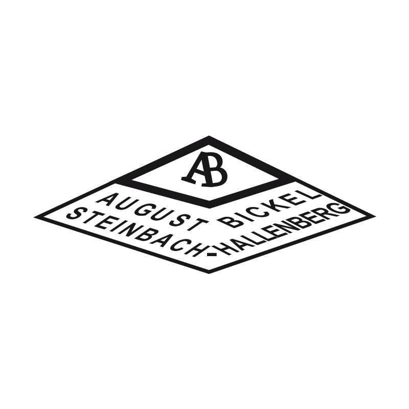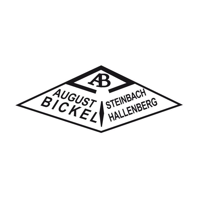 The logo of August Bickel consists of a diamond-shaped emblem with "AB" in the center. The text "AUGUST BICKEL" is on the left, "STEINBACH HALLENBERG" on the right. The logo is in dark gray on a transparent background, symbolizing tradition and quality, typically etched on blades.