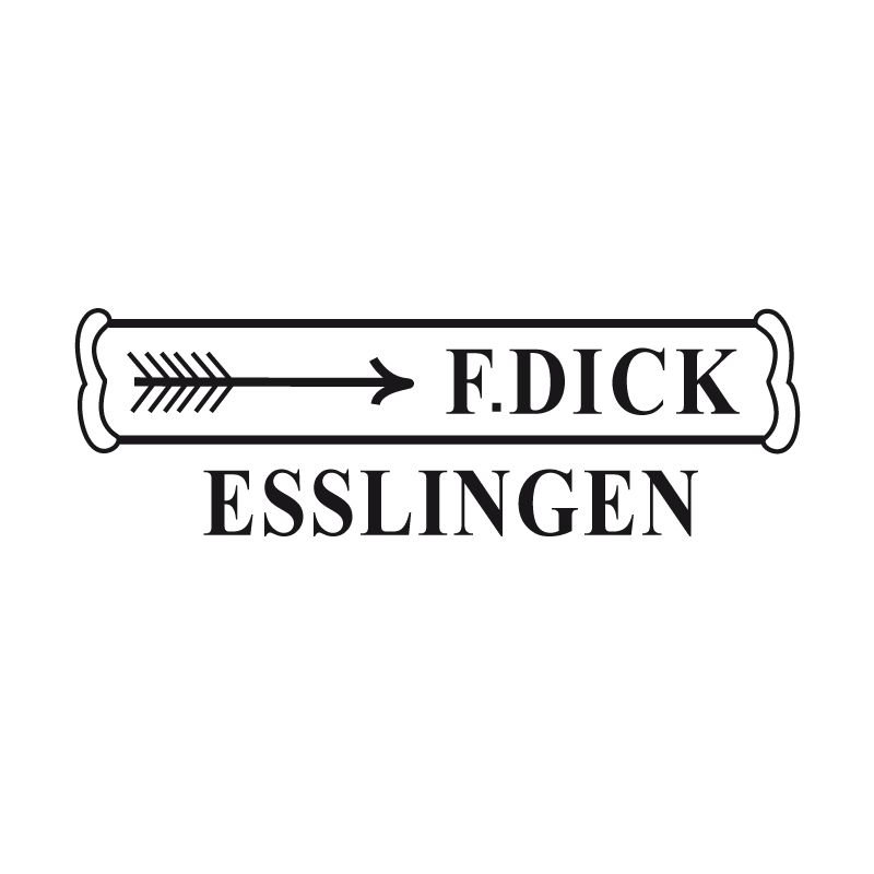 The logo of Dick Friedrich features a rectangular frame with an arrow pointing to the text „F. Dick Esslingen“, as depicted on the daggers' blades. The design conveys precision and tradition, typically etched on blades.