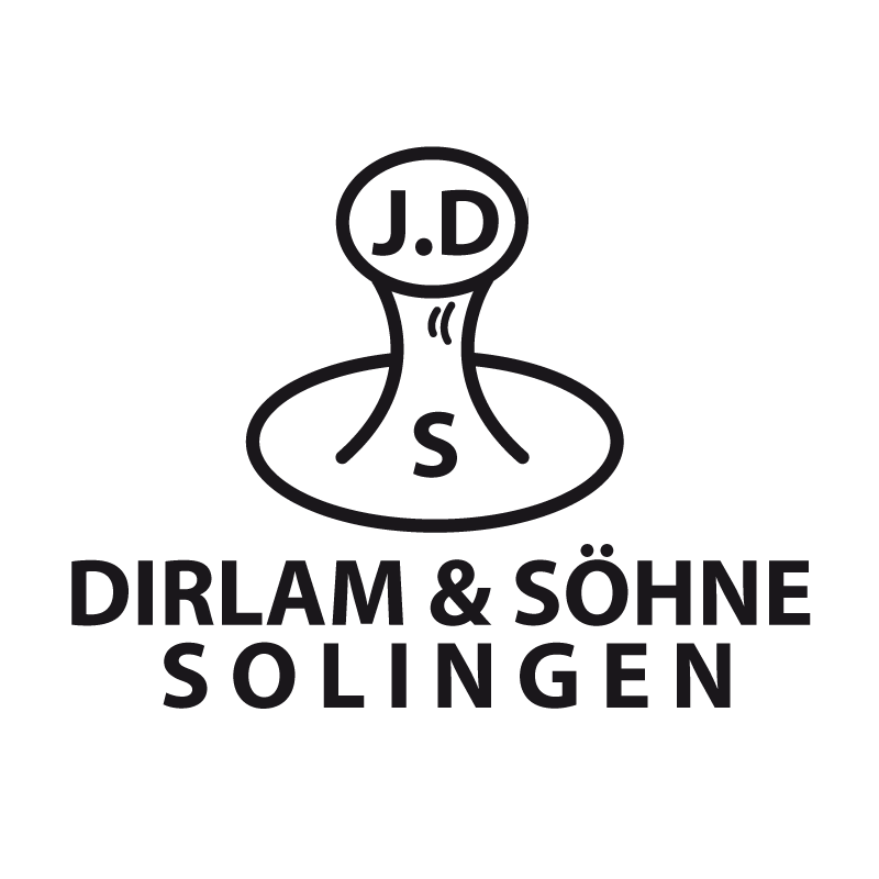 The logo of Dirlam & Söhne features the text „Dirlam & Söhne Solingen“ in a curved, gothic script, often with a surrounding frame, as depicted on the blades of the daggers. The design conveys a classic, traditional aesthetic and was typically etched on blades.