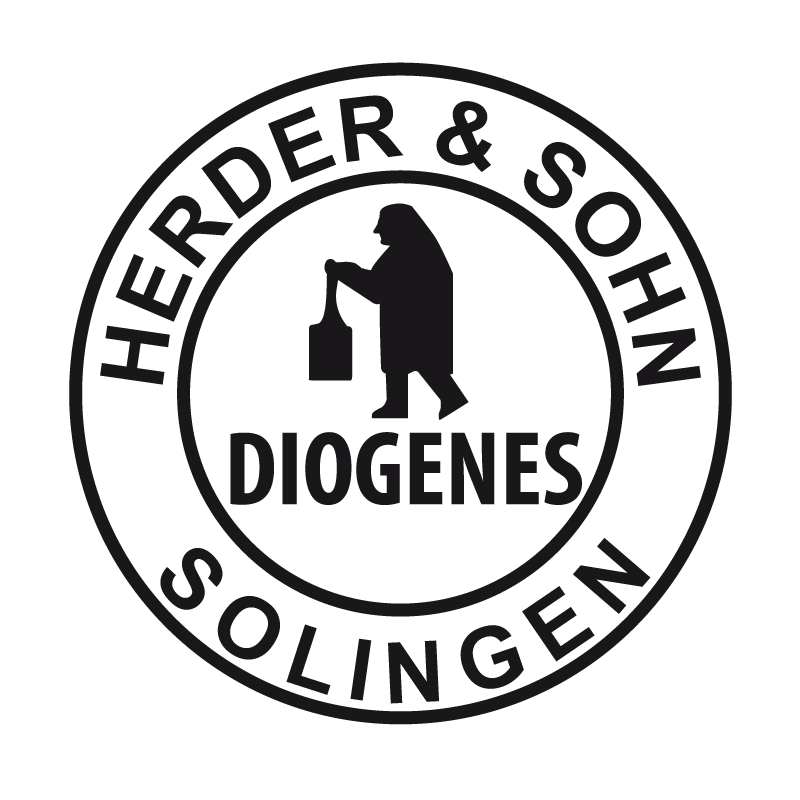 The logo of Herder & Sohn features a man with a lantern (Diogenes), symbolizing tradition and quality, typically etched on blades.