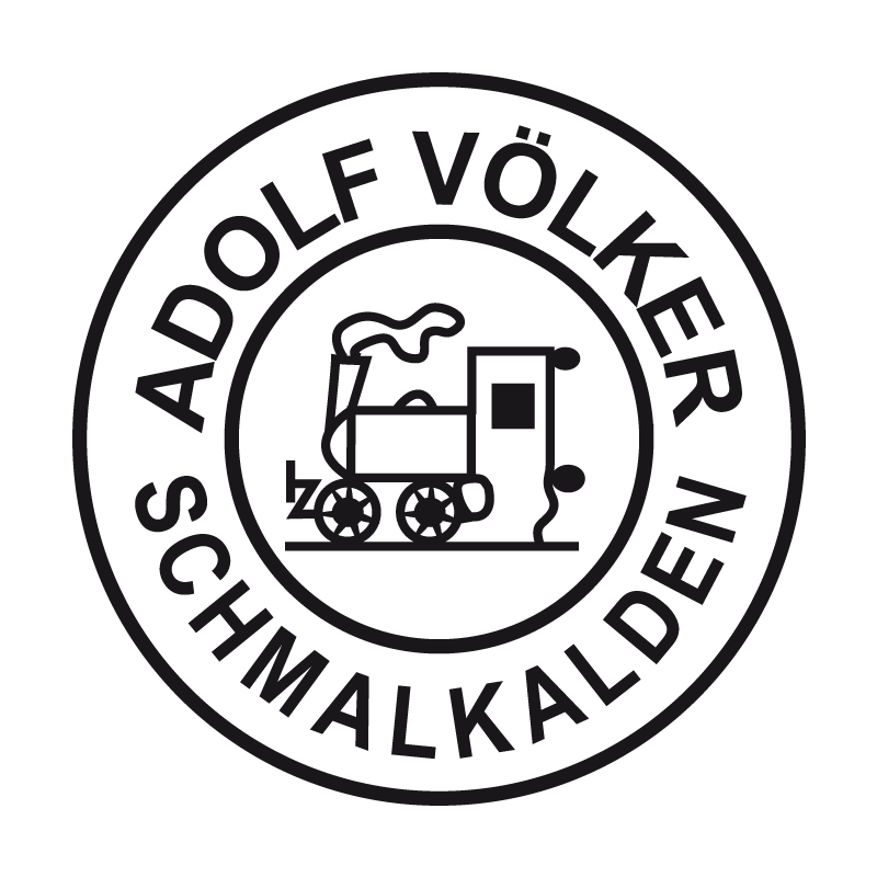 The logo of Adolf Völker is a circular emblem in dark gray on a transparent background. The text "ADOLF VÖLKER" is arched at the top, and "SCHMALKALDEN" at the bottom. In the center is the silhouette of a steam locomotive facing right. The design symbolizes industry and tradition, typically etched on blades.