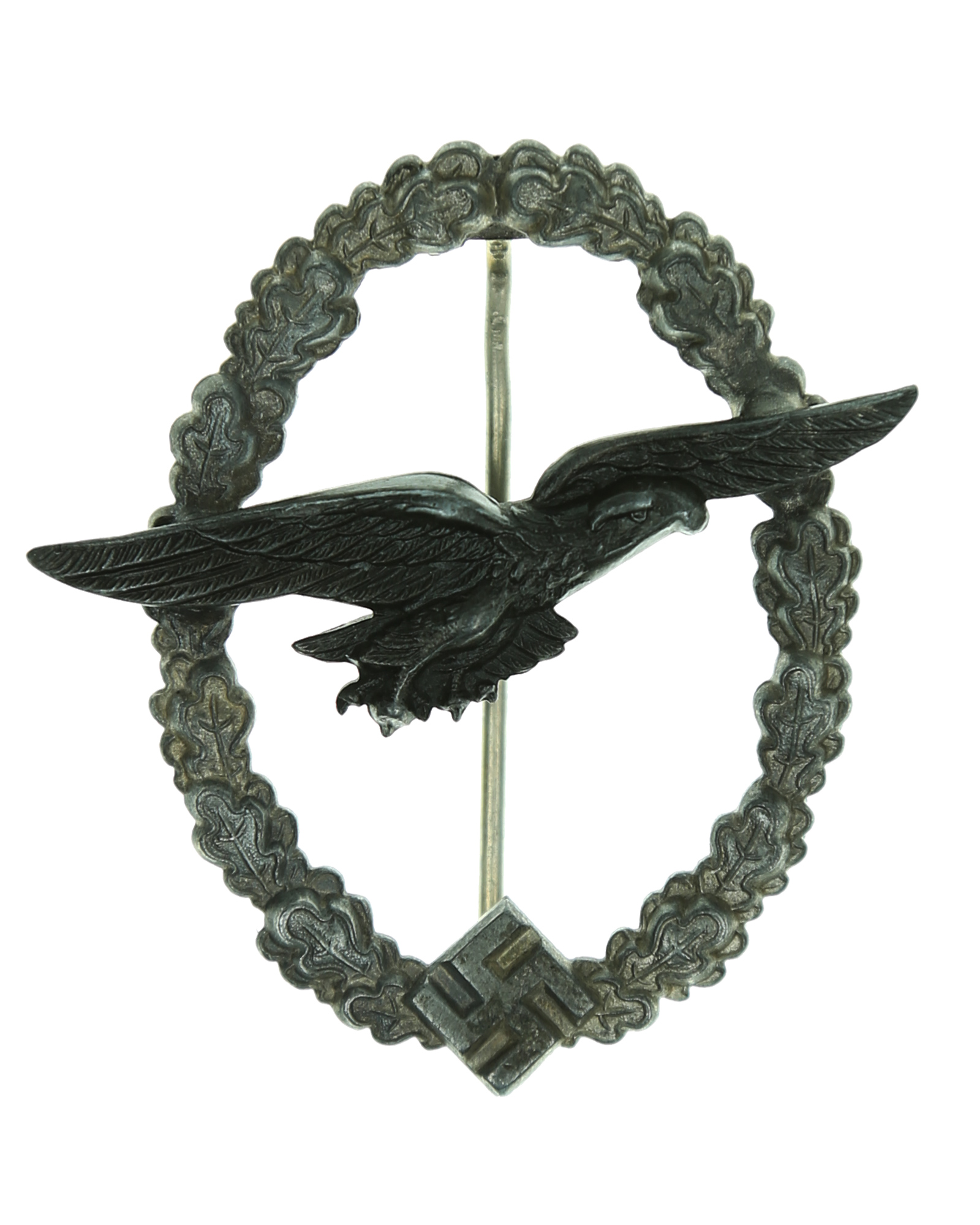 One of the most rare of the Luftwaffe badges, the glider pilot badge was instituted on December 16, 1940. It was awarded to pilots who successfully completed the glider training course. Badge is compromised of a oak leaves wreath with a non-cut out canted swastika at the base. A dark oxidized eagle is riveted to the wreath by two tiny round flat rivets, the eagles wings are widely spanned with its legs bent close to the body. The claws are well detailed and hand finished, and the ridges are burnished.