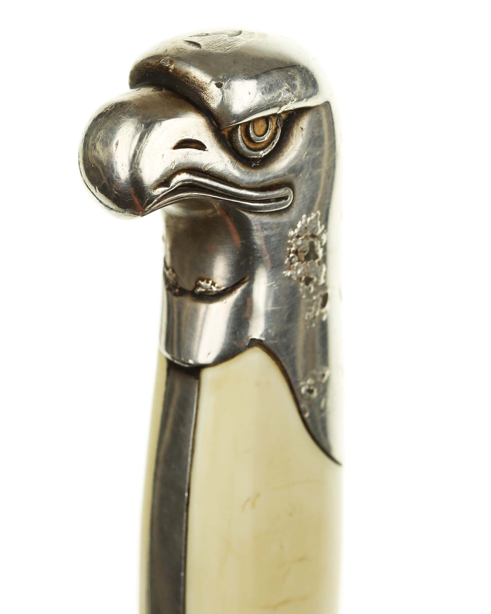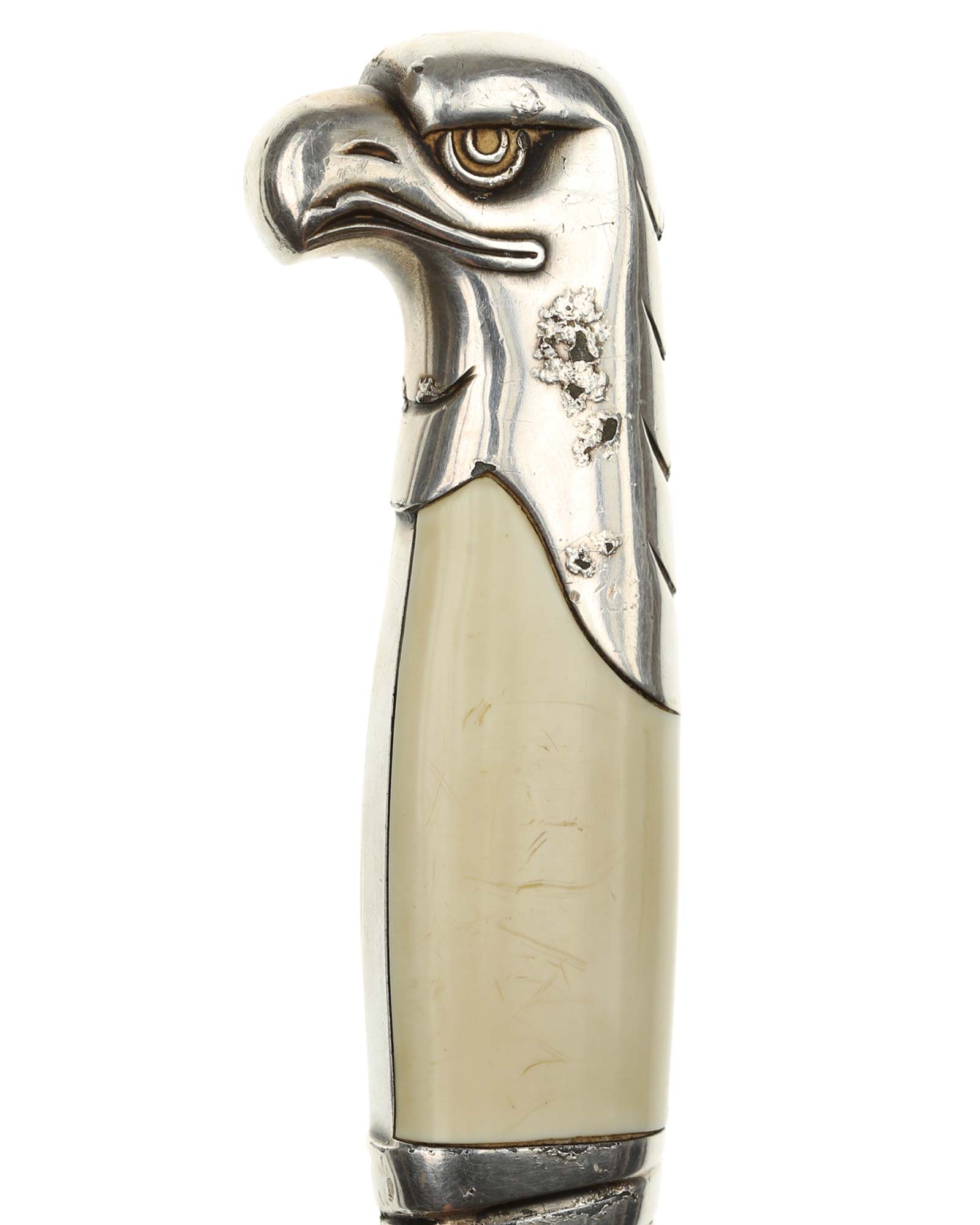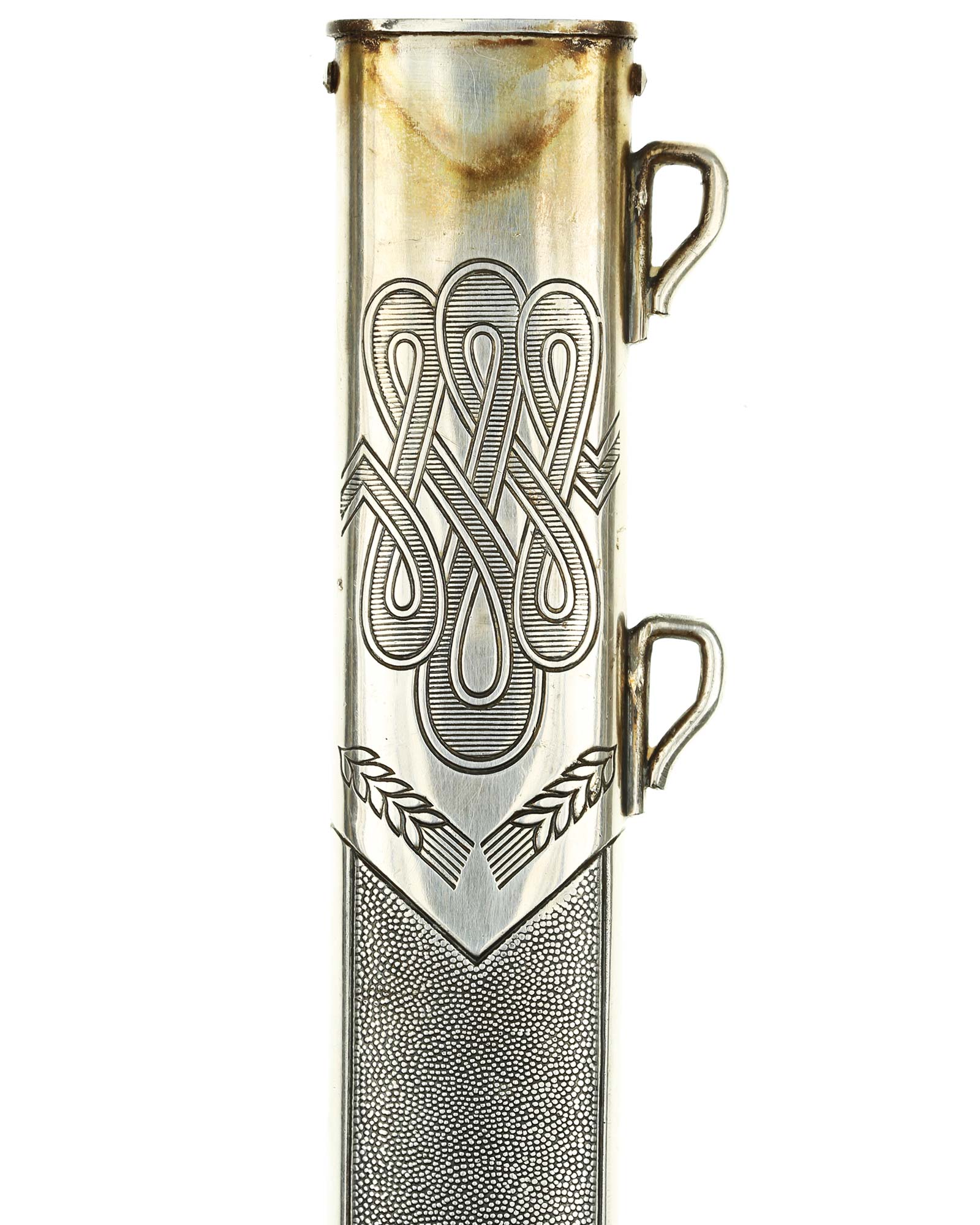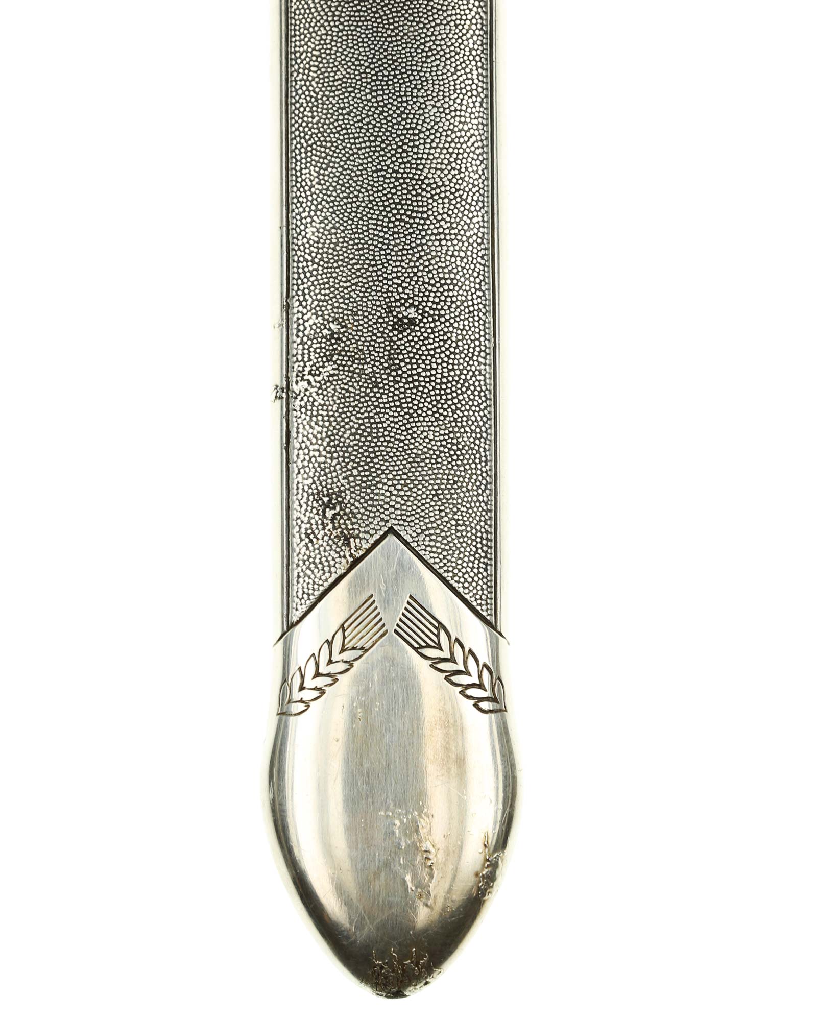 Grip: The pommel has the usual outstanding detail to the eagle’s nasal area, beak, brow and eye. The ferrule has the decorative lines running on forty-five degree angles on the ferrule, each having its original factory darkening in the backgrounds. The crossguard features quillon arms that curl to a swirl at the quillons. The obverse features a spade which is lined and has a superimposed swastika placed between two wheat shafts. The grip plates are a very pleasing off-white color.
