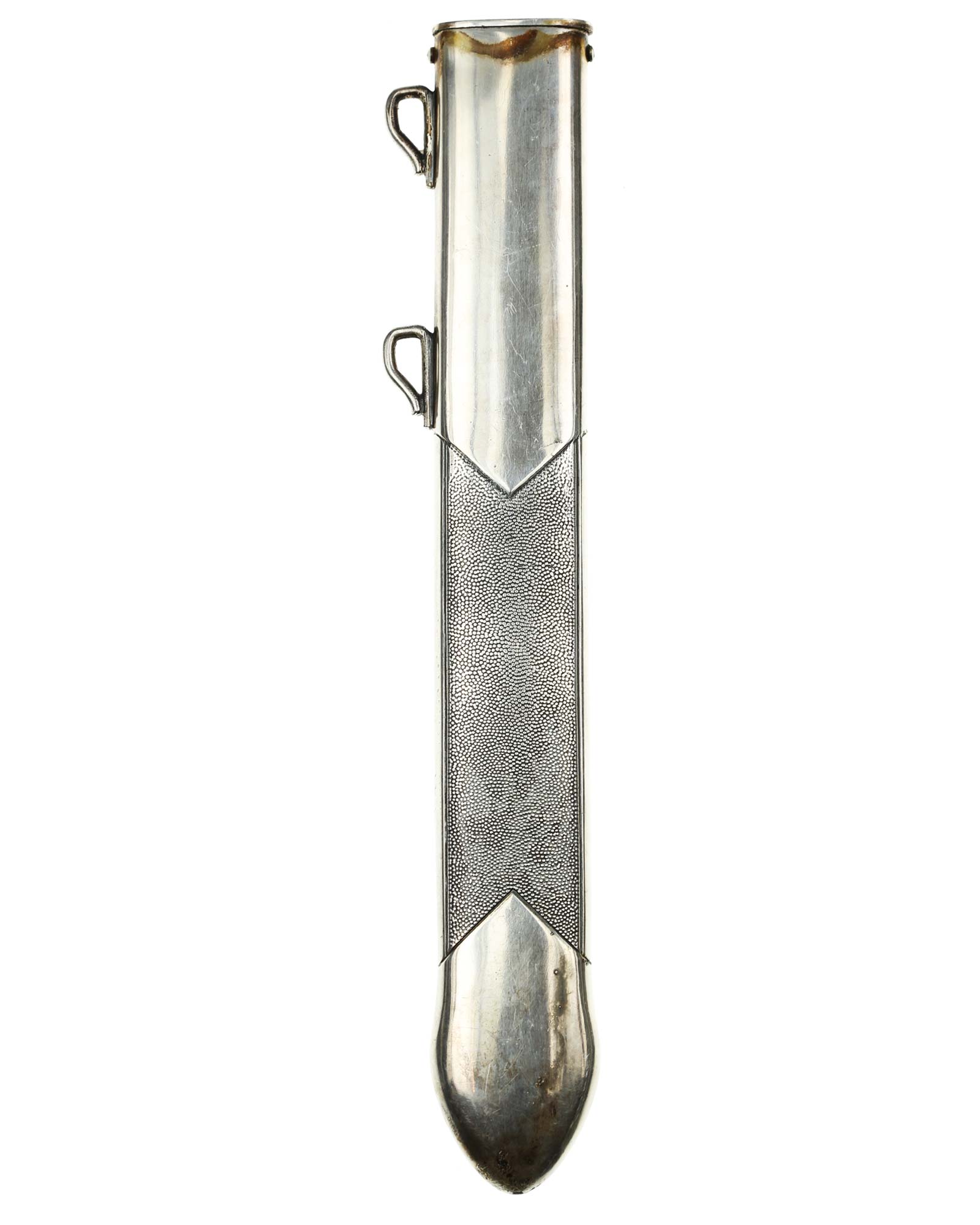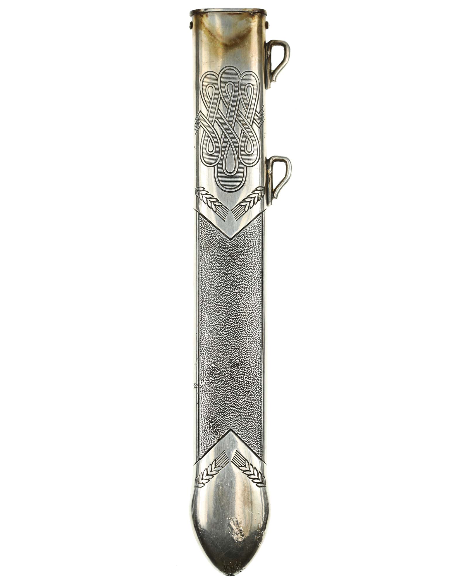 Scabbard: The scabbard has a good crisp pebble pattern on both sides. The scabbard features the curl designs on the upper portion and below the curls are two touching wheat shafts. The throat is retained by two side screws.