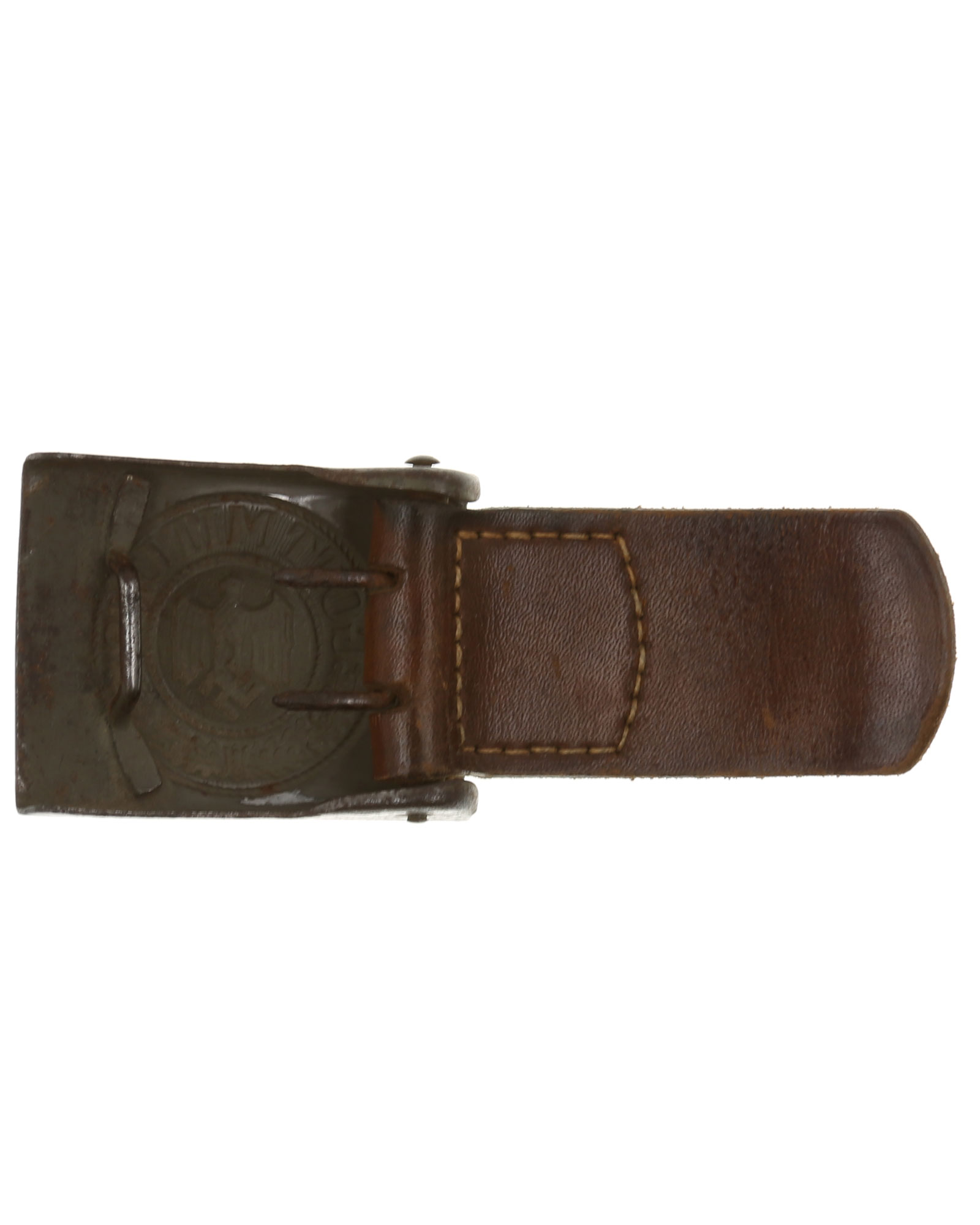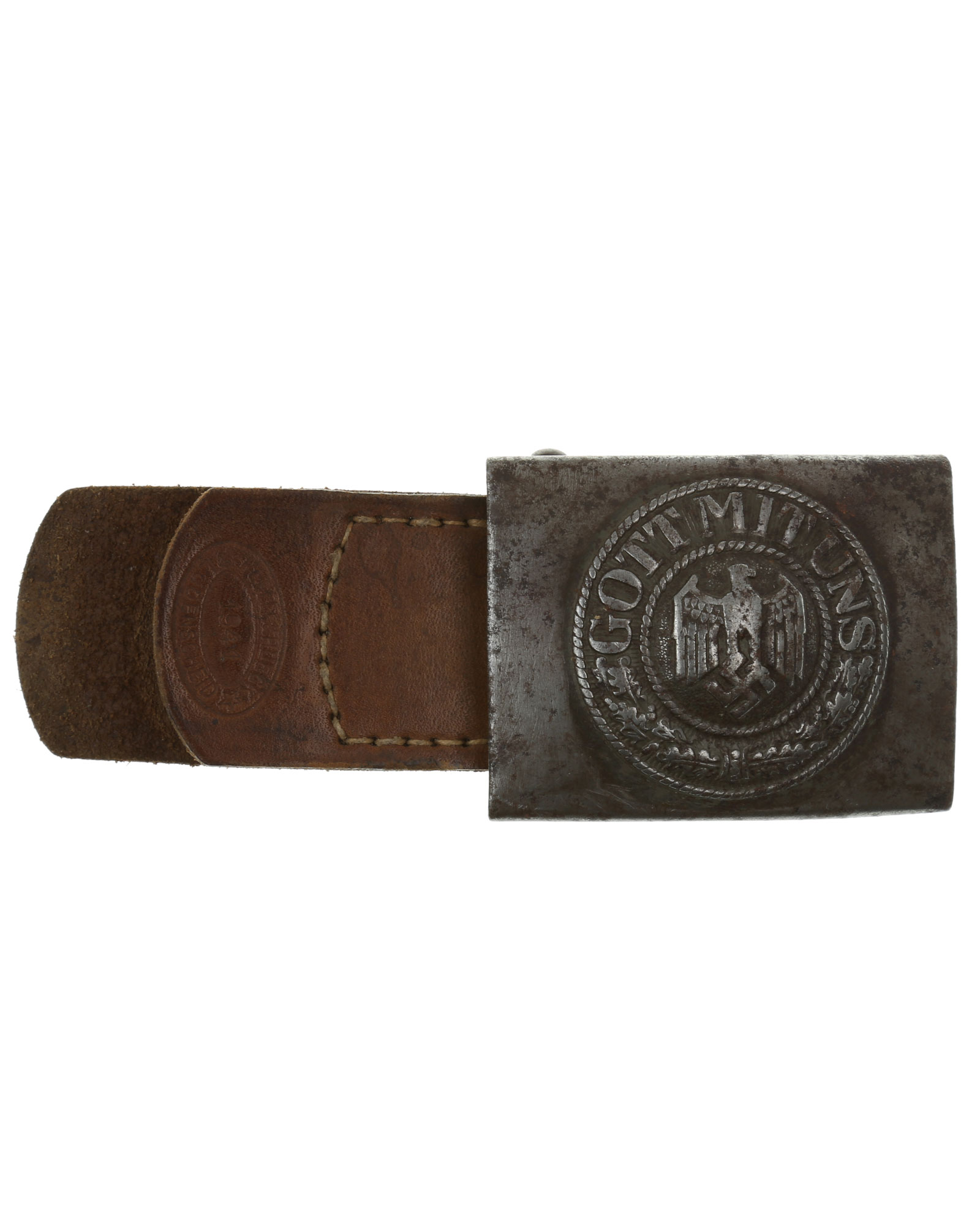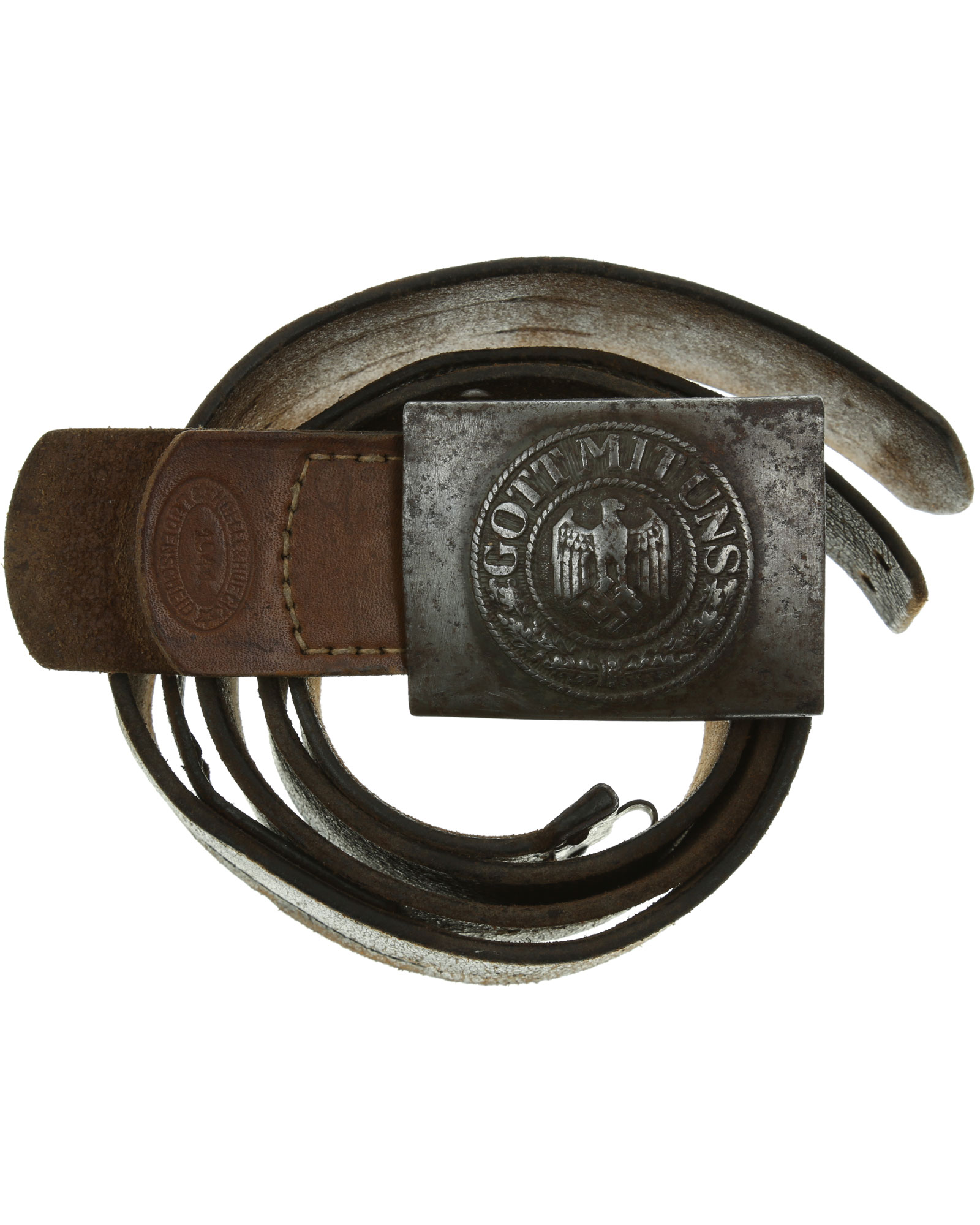 The belt of this example shows quite a bit of age throughout, and most of the original finish is gone from the leather. A good polishing of the surfaces would no doubt help the looks of this belt extensively. The buckle is a rectangular, steel based variety, having the two circles in the center, separated with rope-like designs. In between the center at the bottom area, are oak leaves and acorns, and at the upper area is the slogan GOTT MIT UNS. In the center is a Wehrmacht style eagle, having half open wings, and clutching a mobile swastika.