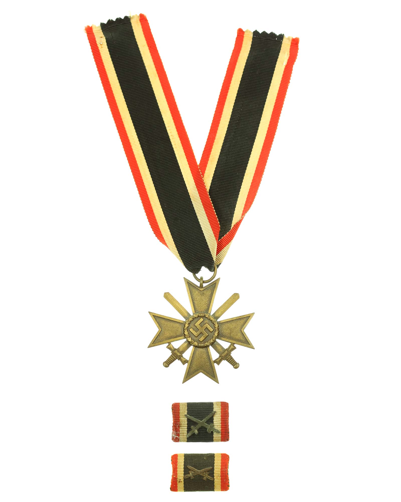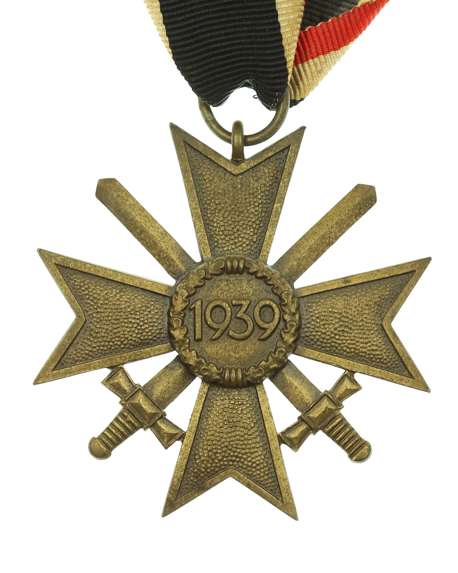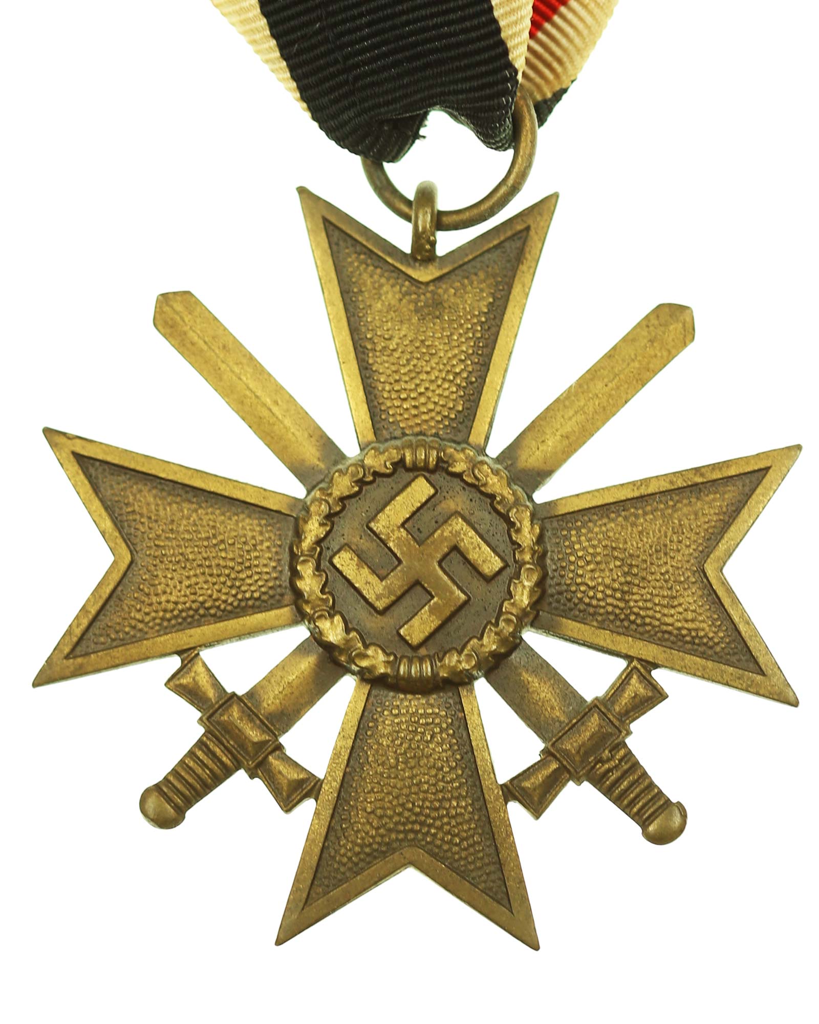 This is the German War Merit Cross badge with Swords for Combatants Second Class Badge with ribbon (red | white | black | white | red).The condition is near mint. It is HEAVY bronze plate. Total weight 22 g. Dimensions: 47,60 x 48,18 mm.