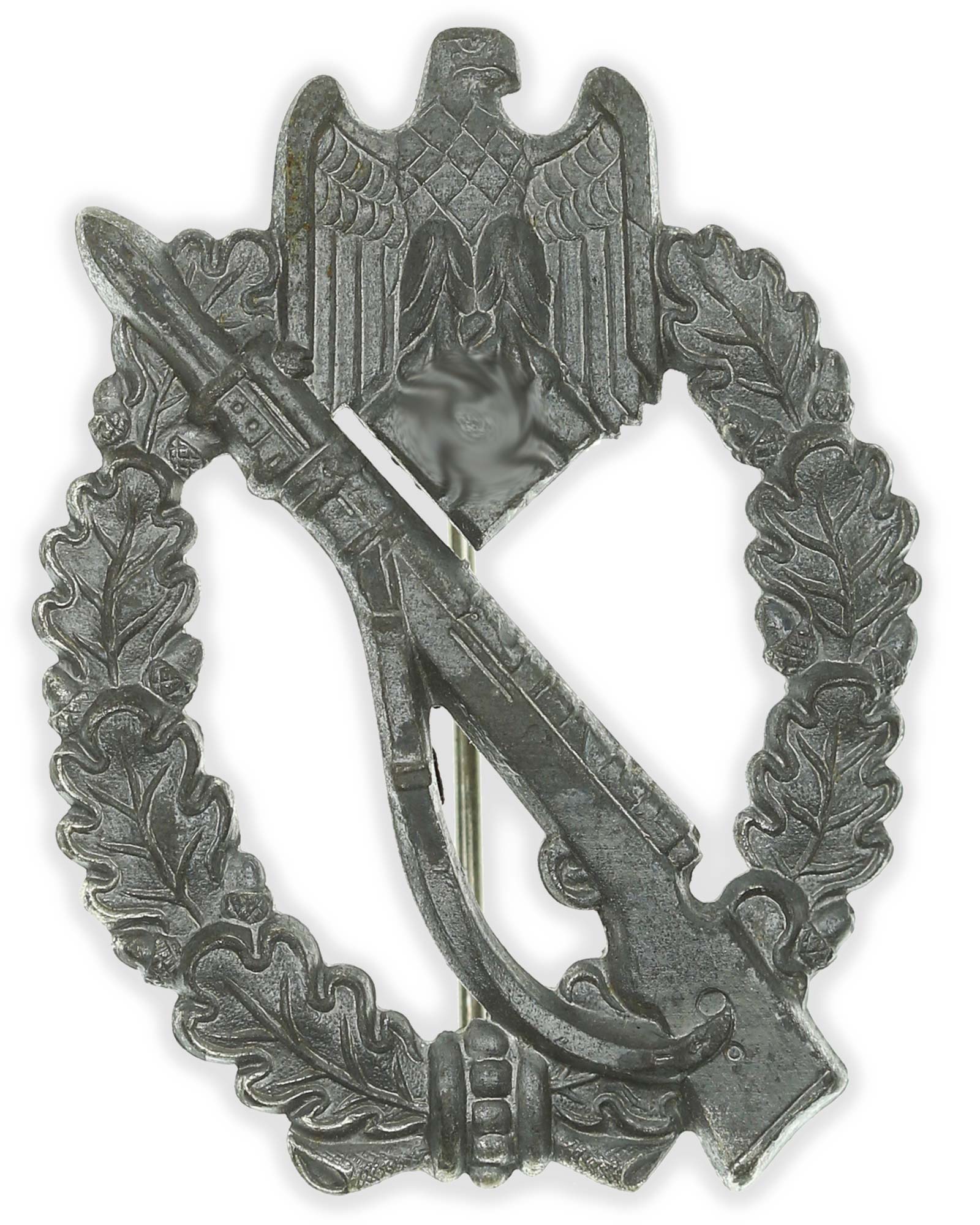 A Silver Grade Infantry Assault Badge - in zinc alloy, silvered, marked S.H.u.Co. for Sohni Heubach & Co. Oberstein. The condition is EXC+. Total weight 31 g. Dimensions: 61,49 x 47,03 mm.