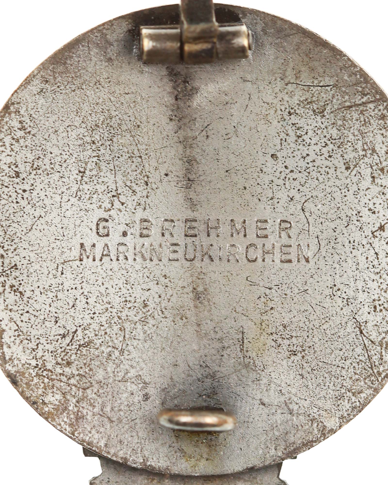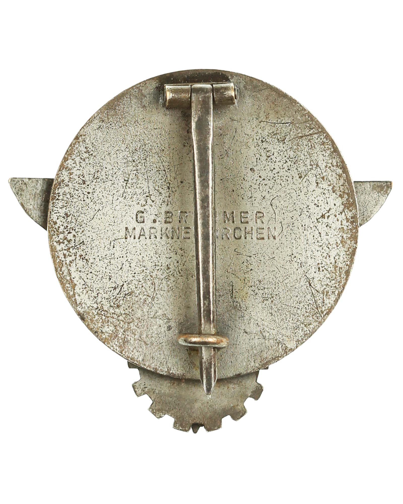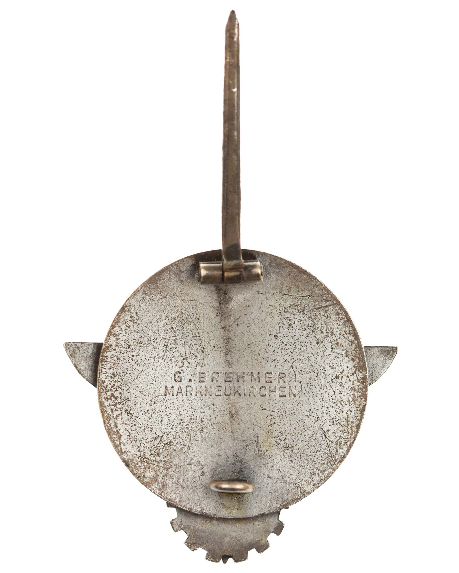 A Victors Badge in the National Trade Competition by G. Brehmer Markneukirchen, maker marked on the reverse, vertical pinback. The condition is Near Mint. Total weight 29,2 g. Dimensions: 49,18 x 46,66 mm.