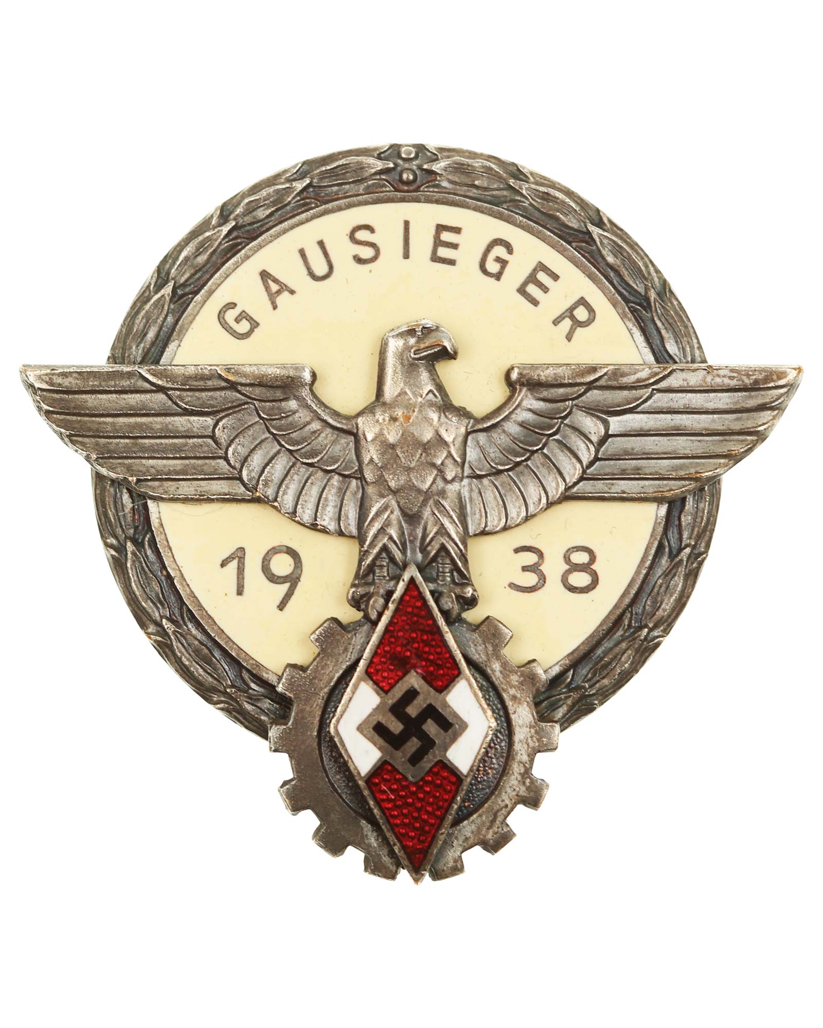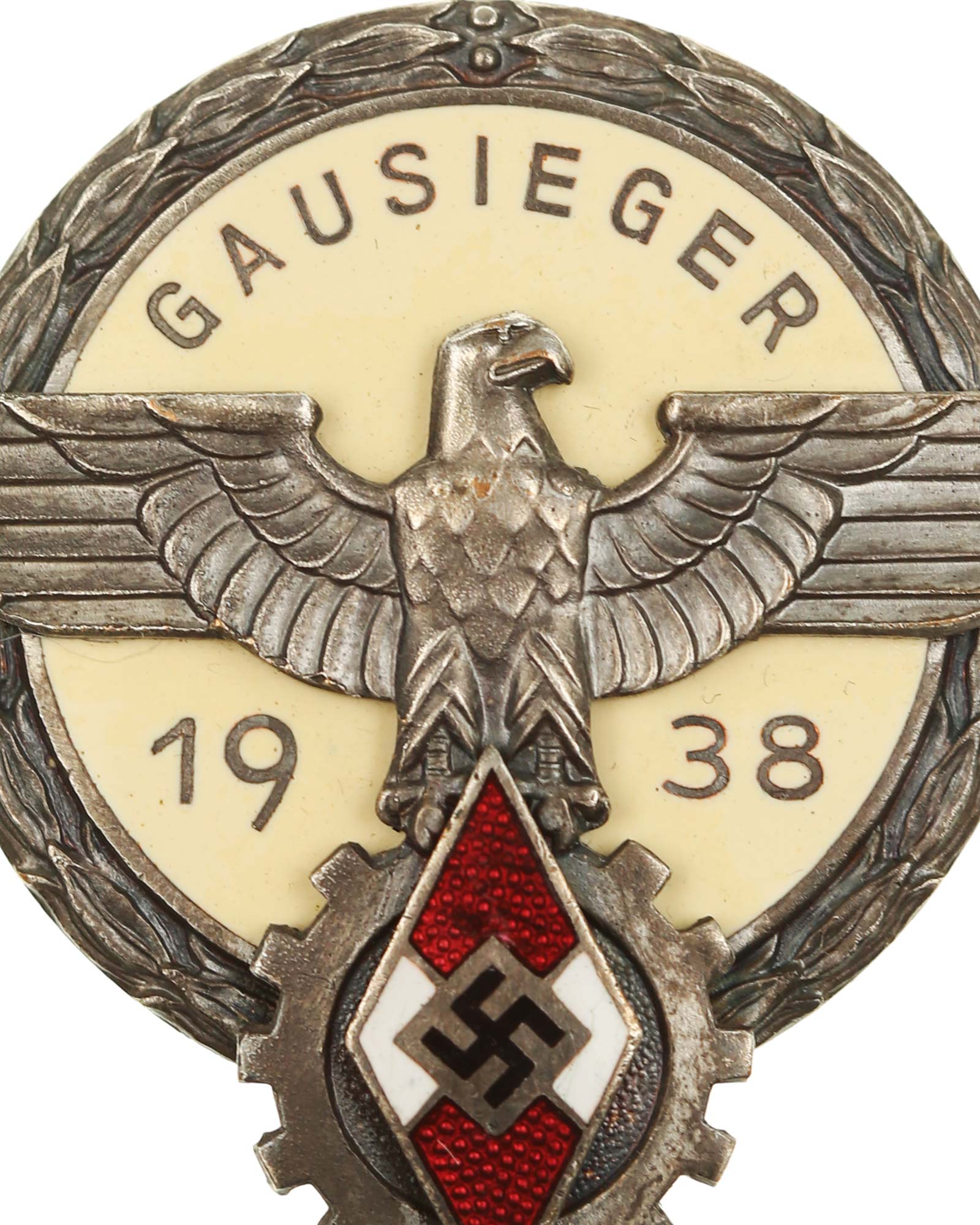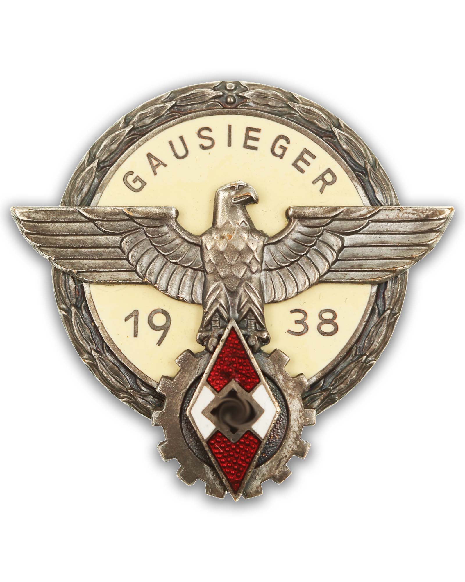 A Victors Badge in the National Trade Competition by G. Brehmer Markneukirchen, maker marked on the reverse, vertical pinback. The condition is Near Mint. Total weight 29,2 g. Dimensions: 49,18 x 46,66 mm.